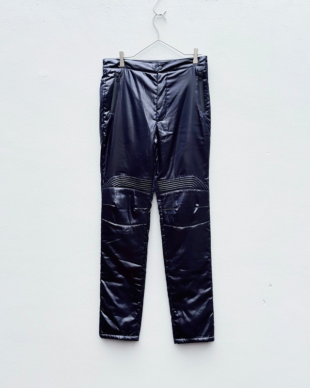 JOHN LAWRENCE SULLIVANのデッドストックパファーパンツ。 バイカープロテクターディテールをサンプリングした面構えに直線的なストレートシルエット。 中綿入りながらも過度なボリュームは抑えられ、光沢感のある素材感は流石の一言。 機能性とデザイン性を高次元で両立した、冬のスタイリングに強度をもたらす一本です◎ . 【size】 : 36 (mens M・ladies L程) waist (ウエスト) 41.5cm rise (股上) 31cm insneam (股下) 79.5cm thigh width (ワタリ幅) 25.5cm hem width (裾幅) 17cm 【material】 : polyester . 【condition】 : 10 (10) 新品、未使用品、デッドストック (8)ダメージや汚れが見当たらない良好な状態 (6)多少の使用感のみの状態 (平均的な古着の状態) (4)一部にダメージや汚れが見受けられる状態 (2)全体的にダメージや汚れが見受けられる状態 . No.GH
