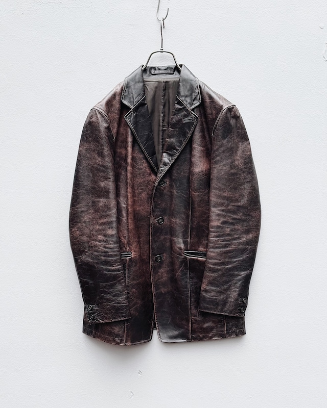 バッファローレザーを使用したテーラードジャケット。 肉厚で荒々しい質感を持つレザーに、長い年月を経たような退廃的エイジングが現れた一着です。 テーラードの端正なシルエットと、無骨な素材感の対比が印象的。 レザー特有のムラ感や色の変化が、唯一無二の表情を生み出しています。 存在感はありながらも、不思議と日常の装いに馴染むプロダクト。 スタイリングに奥行きを与える、古着の良さが詰まった希少性の高いレザーアイテムです◎ . 【size】 : men's M (ladie's L程) shoulder width (肩幅) 42cm body width (身幅) 50 cm sleeve length (袖丈) 62 cm body length (着丈) 75 cm 【material】 : buffalo leather 【condition】 : 4 ※全体的に褪色やスレ等の使用感がございます (10) 新品、未使用品、デッドストック (8)ダメージや汚れが見当たらない良好な状態 (6)多少の使用感のみの状態 (平均的な古着の状態) (4)一部にダメージや汚れが見受けられる状態 (2)全体的にダメージや汚れが見受けられる状態 . No.GH