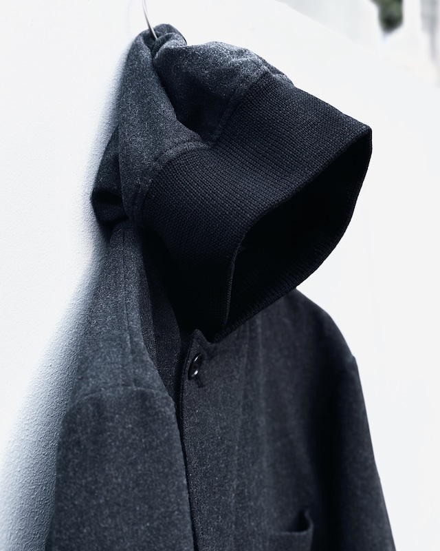 津村耕佑によって1994年に展開され「都市生活における機能服」をテーマにした実験的なデザインで知られているFINAL HOMEによるフーディーコート。 ラフなウールボディに、ボリュームのあるリブフードを組み合わせた特徴的な一着。 フロントを開けるとラペルのような表情が現れ、ドレッシーな印象に。 ボタンを留めるとやや斜めに重なる設計となり、シンプルな中に独特の動きが生まれます。 テクニカルな発想とベーシックな造形が程良く融合した、同ブランドらしいプロダクトです。 【size】 : men's M (ladies L程) shoulder width (肩幅) 46.5cm body width (身幅) 52cm sleeve length (袖丈) 65cm body length (着丈) 89cm 【material】 : Wool 50% Polyester 50% 【condition】 : 8 (10) 新品、未使用品、デッドストック (8)ダメージや汚れが見当たらない良好な状態 (6)多少の使用感のみの状態 (平均的な古着の状態) (4)一部にダメージや汚れが見受けられる状態 (2)全体的にダメージや汚れが見受けられる状態 . No.GH