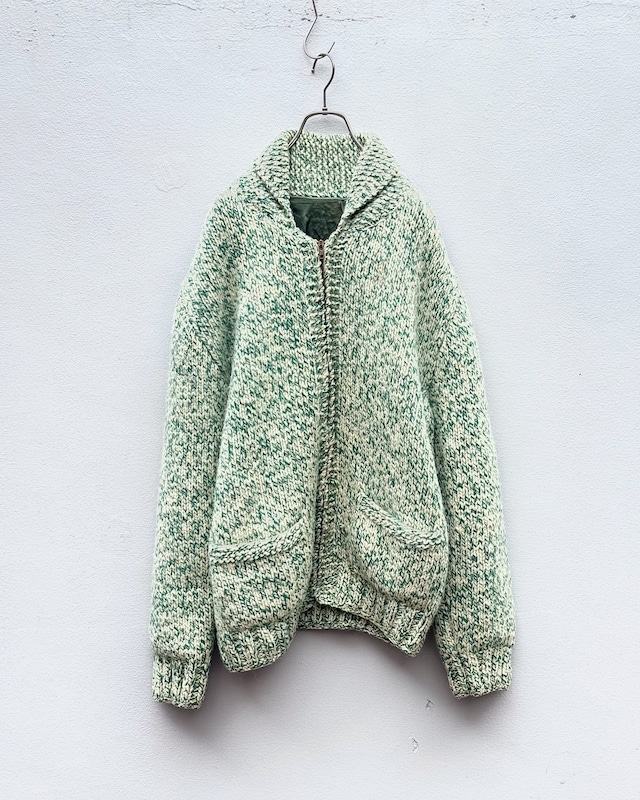 ヴィンテージ のカウチンニットジャケット。 重厚なウール編みに鮮烈な配色バランスが乗った一着。 柔らかな色味を軸に、グリーン・オレンジを差し込んだクラシックなノルディックパターンが際立つ構成。 ヴィンテージ特有の武骨さと手編み特有の厚みが共存。 冬の主役として成立する、存在感あるニットウェアです◎ . 【size】 : free (men's M~L・ladie's XL程) body width (身幅) 55cm body length (着丈) 75cm raglan sleeve length (ゆき丈) 91cm . 【material】 : wool . 【condition】 : 6 ※襟元に編み直しがございます。 (10) 新品、未使用品、デッドストック (8)ダメージや汚れが見当たらない良好な状態 (6)多少の使用感のみの状態 (平均的な古着の状態) (4)一部にダメージや汚れが見受けられる状態 (2)全体的にダメージや汚れが見受けられる状態 . No.GH