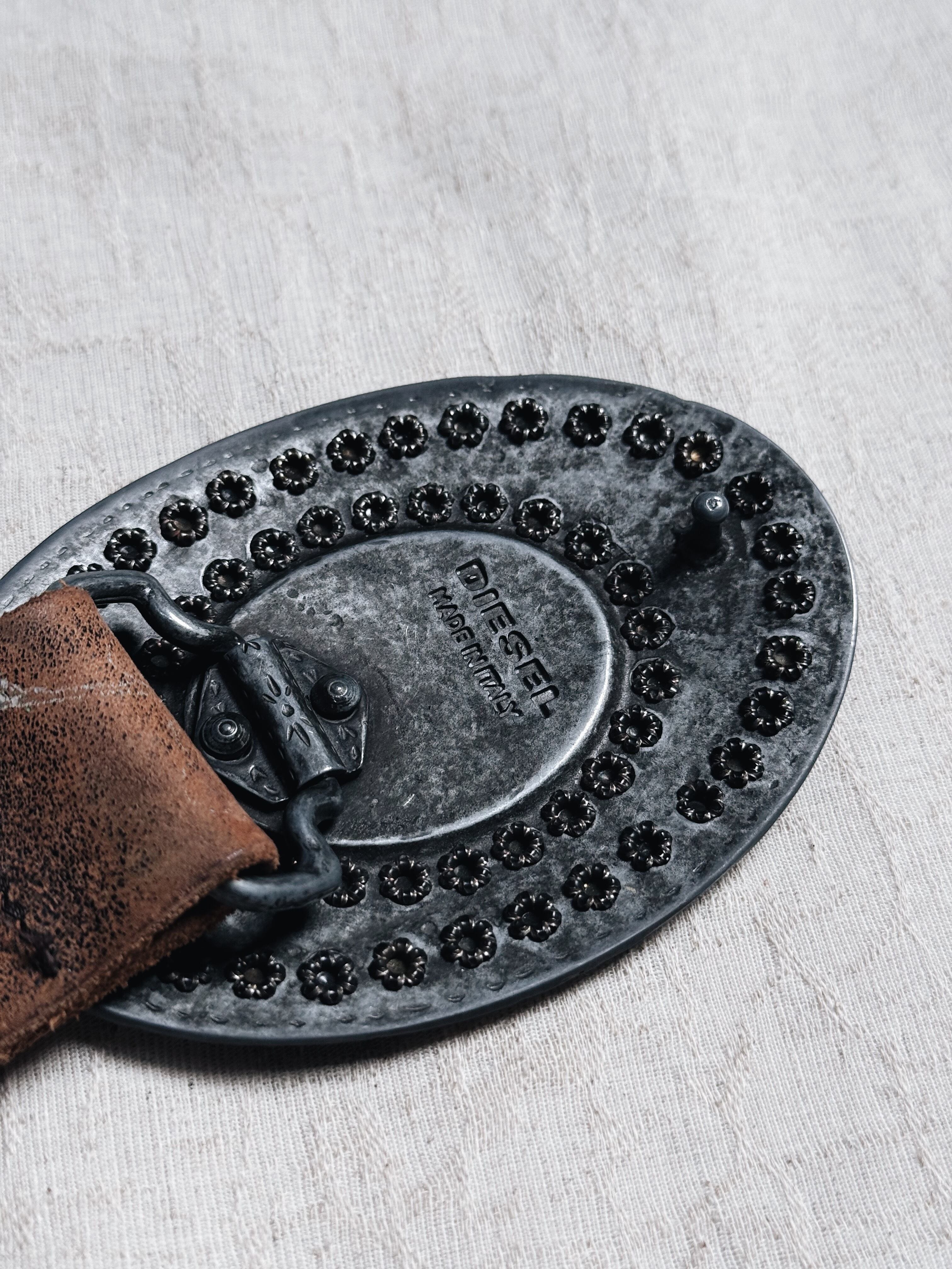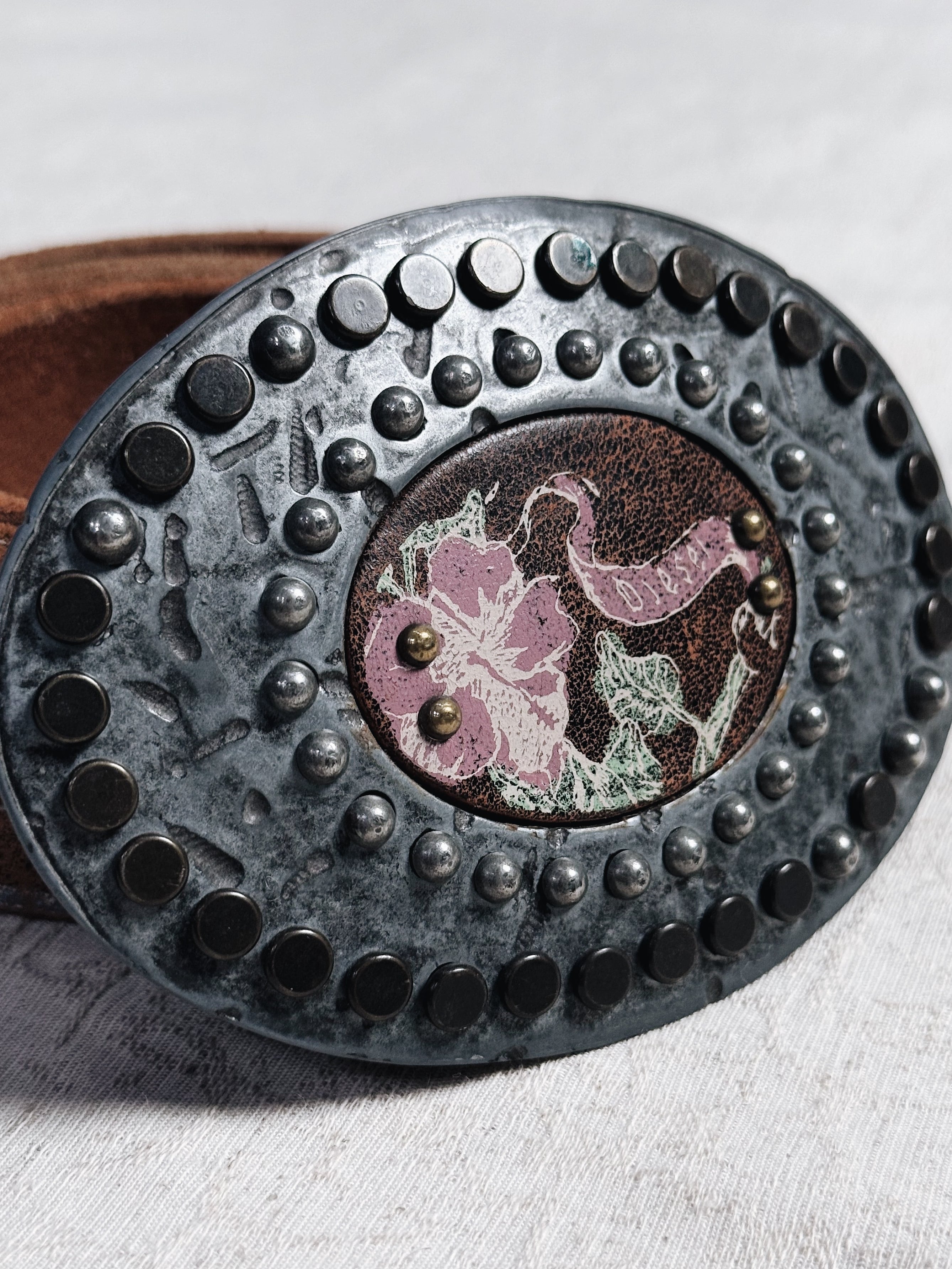 アイコニックなオーバル型バックルは重厚なメタルにスタッズ装飾を配し、中央にフラワーアートをセット。