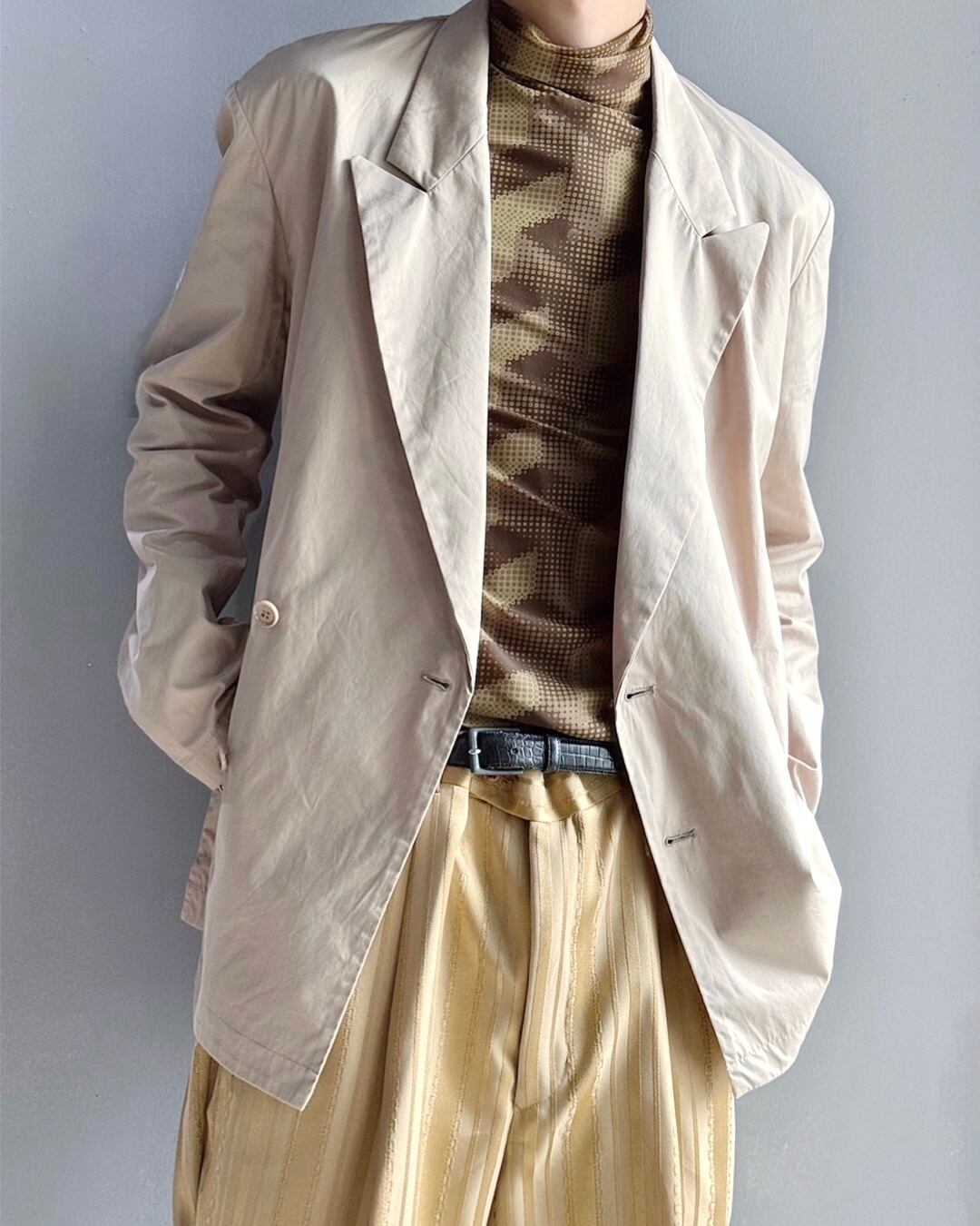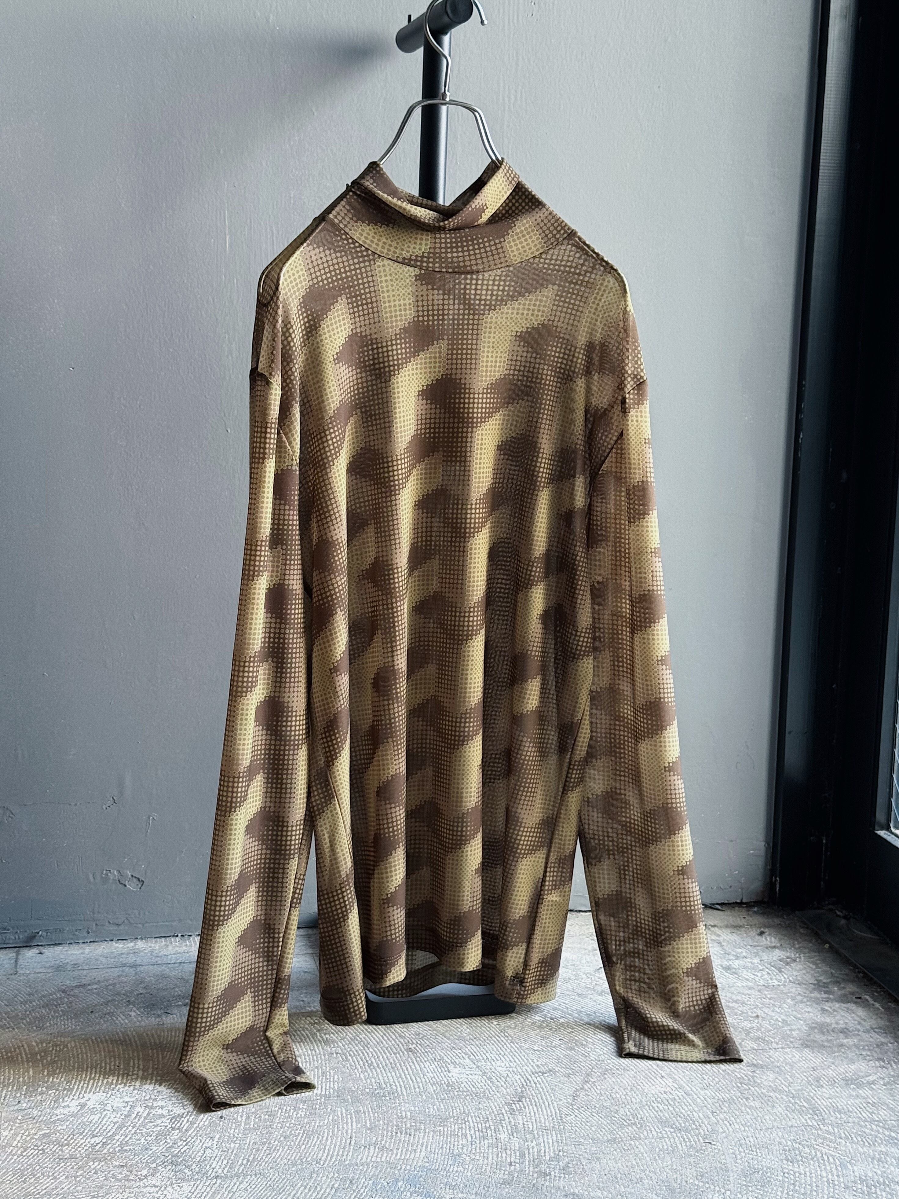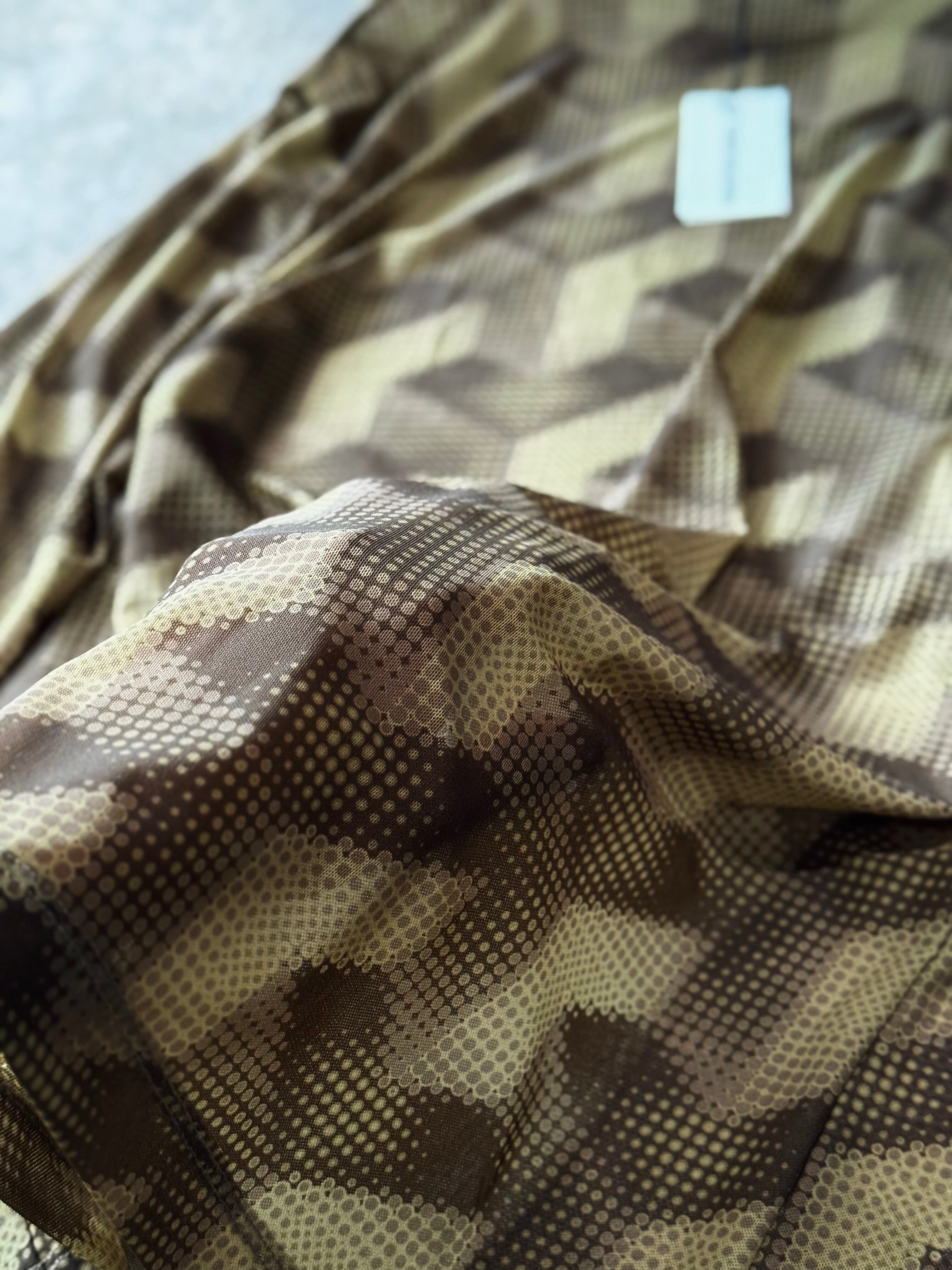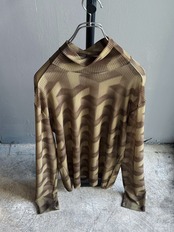 ベージュ×ブラウンのグラデーション幾何学パターンが、奥行きのある陰影とモダンな表情を演出し、透け感と質感のコントラストが、レイヤードにも単品使いにも映える一着。