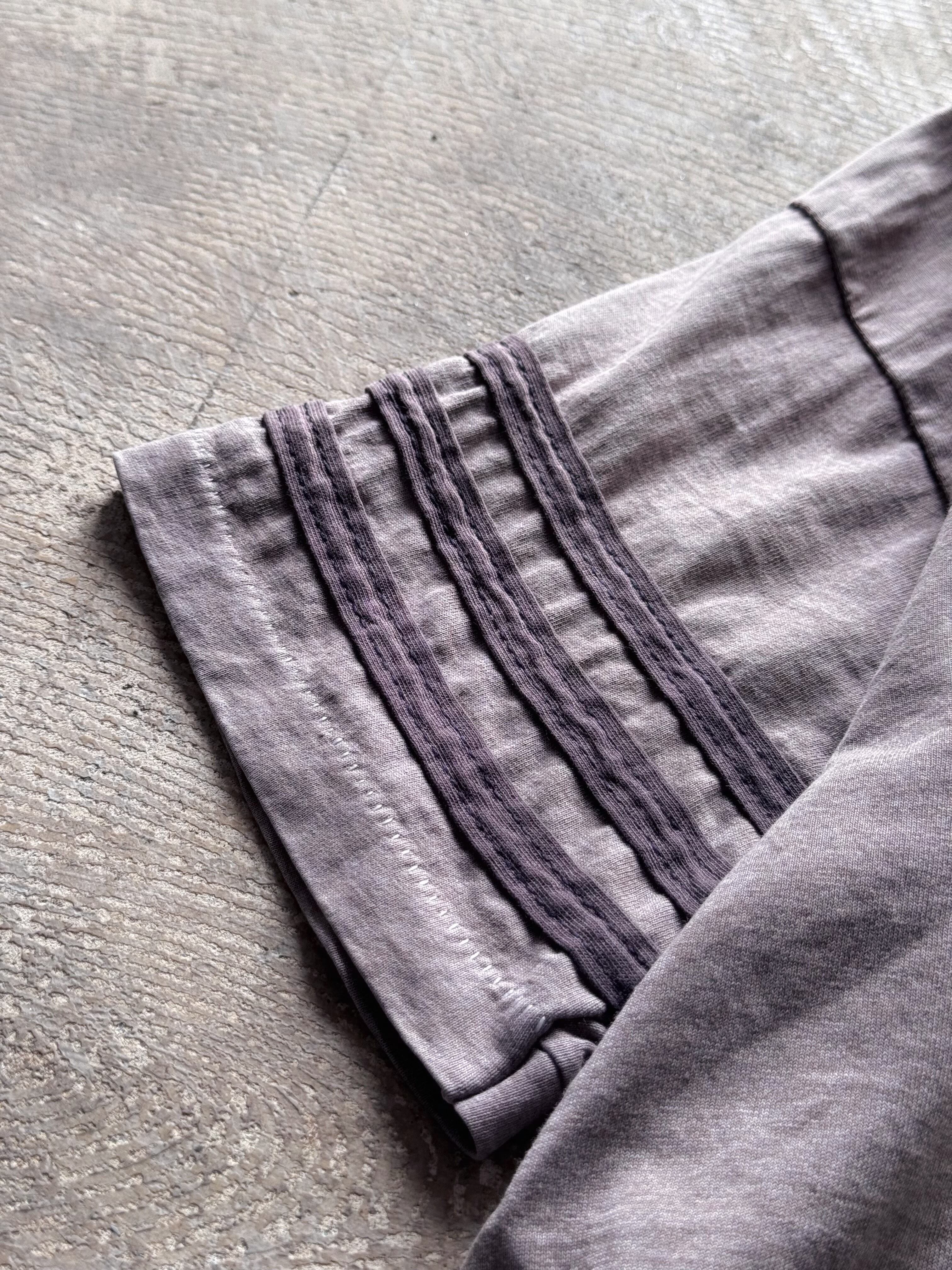 袖には3本ラインのタックデザイン、首元はVネック仕様でリブが切り替えられたスペシャルなディテール。