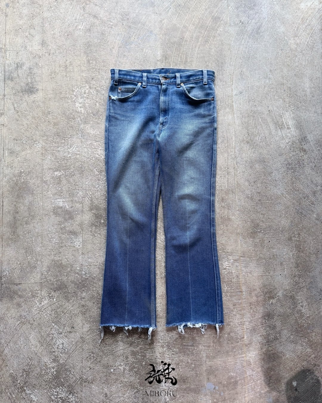 ブーツカットシルエットは勿論のこと、程良い色落ち、センタープレス、ストレッチ素材と特徴に富んだ一本です。裾はカットオフ仕様でフリンジが残り、ヴィンテージらしい表情を強調。