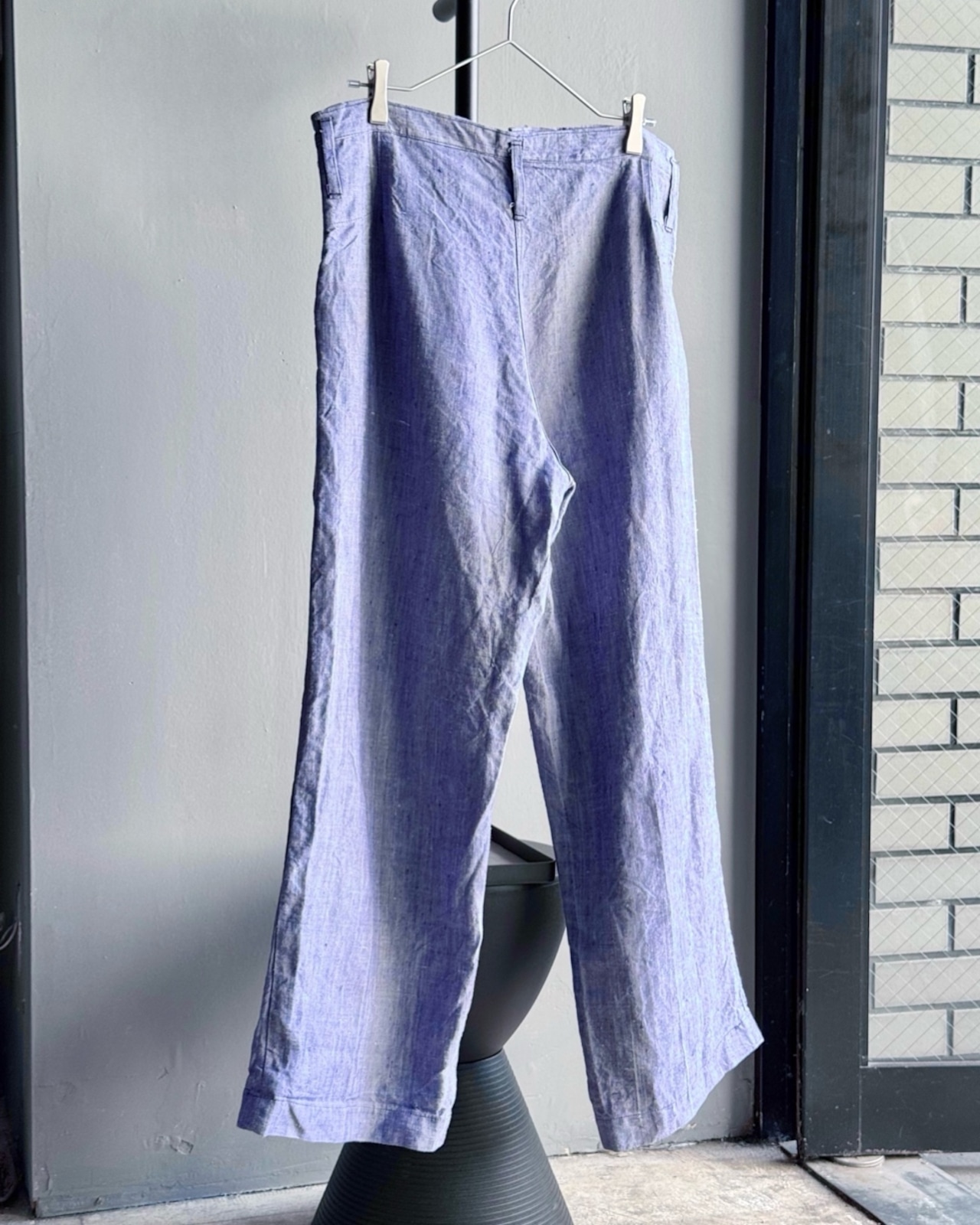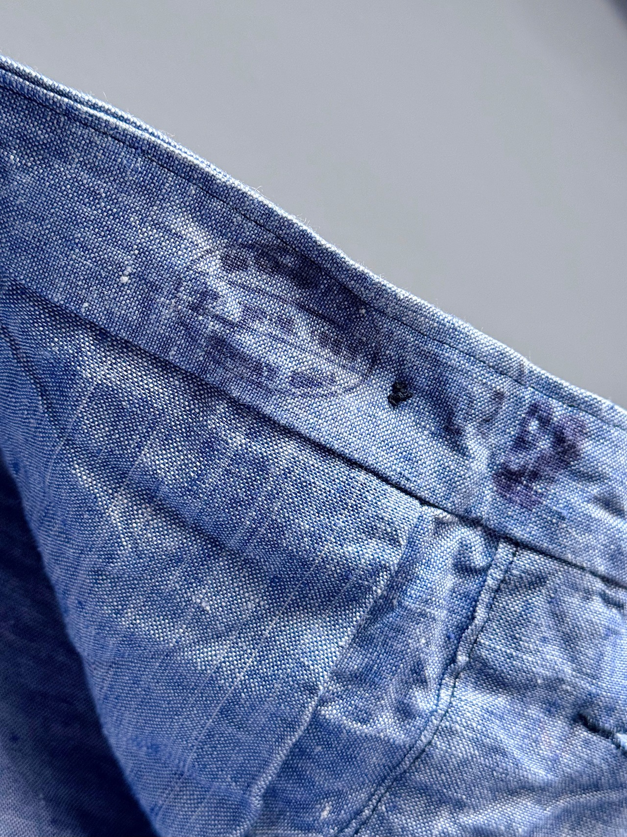 1950〜1960年代フランス製、デッドストックのラミーリネンパンツ。リネンよりも強度が高く光沢を持つラミーを混ぜた粗野で武骨な生地感は、当時のワークウェアの中でも特異な存在。生成りやホワイトが一般的な中で、濃淡を含むブルーの色味は極めて希少で、デッドストックゆえに経年変化のないピュアな状態が保たれています。軍や作業服の機能美を備えながら、現存数の少なさとコンディションが相まって、ヴィンテージ市場においてもスペシャルピースと断言できる一本です◎