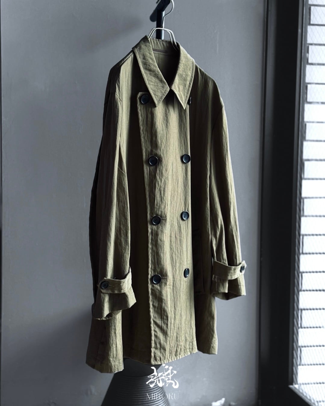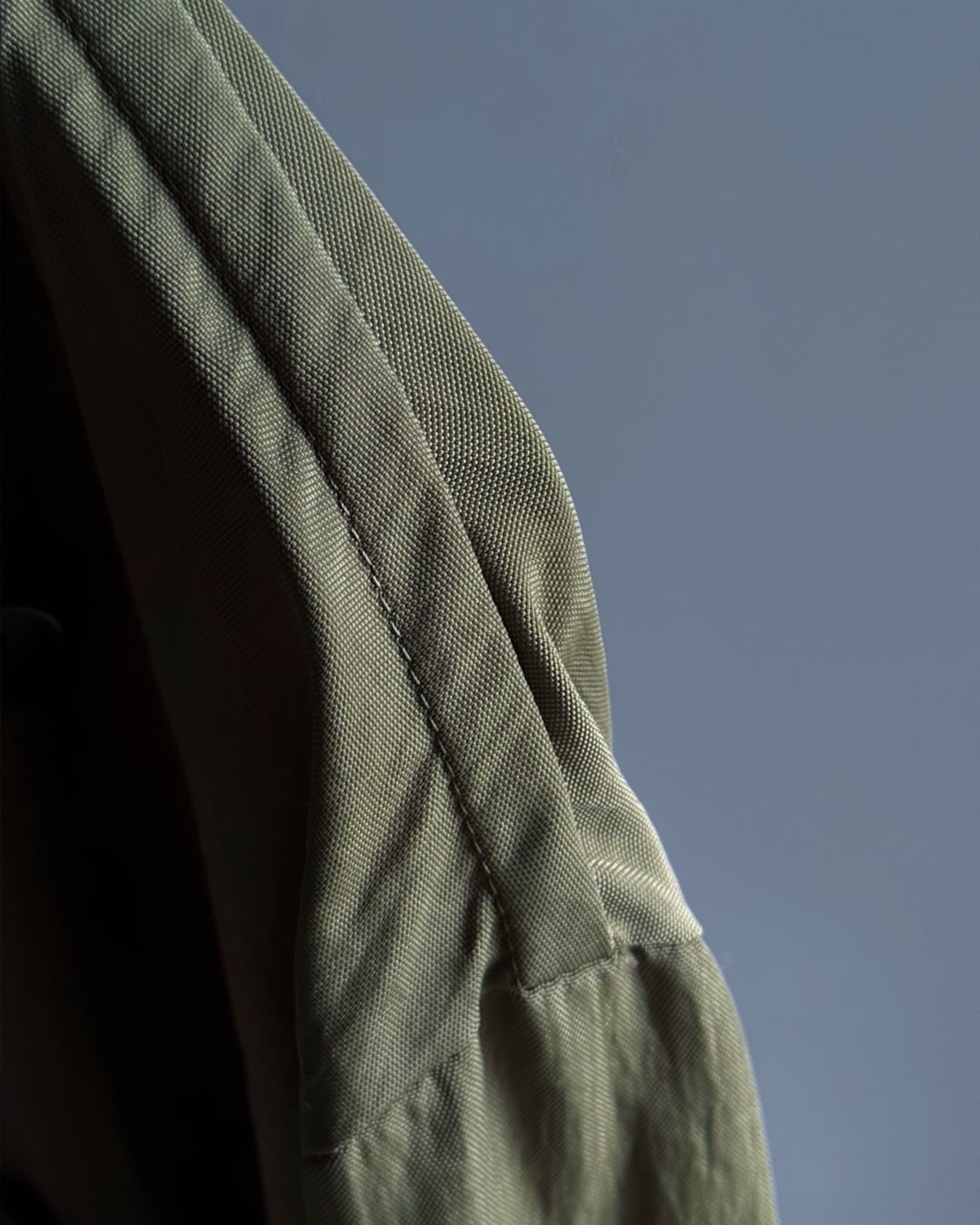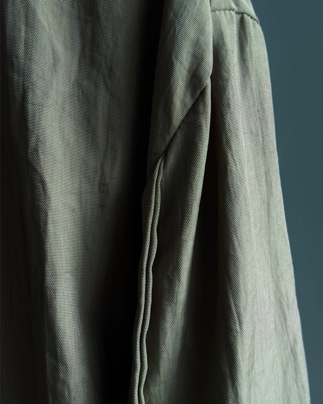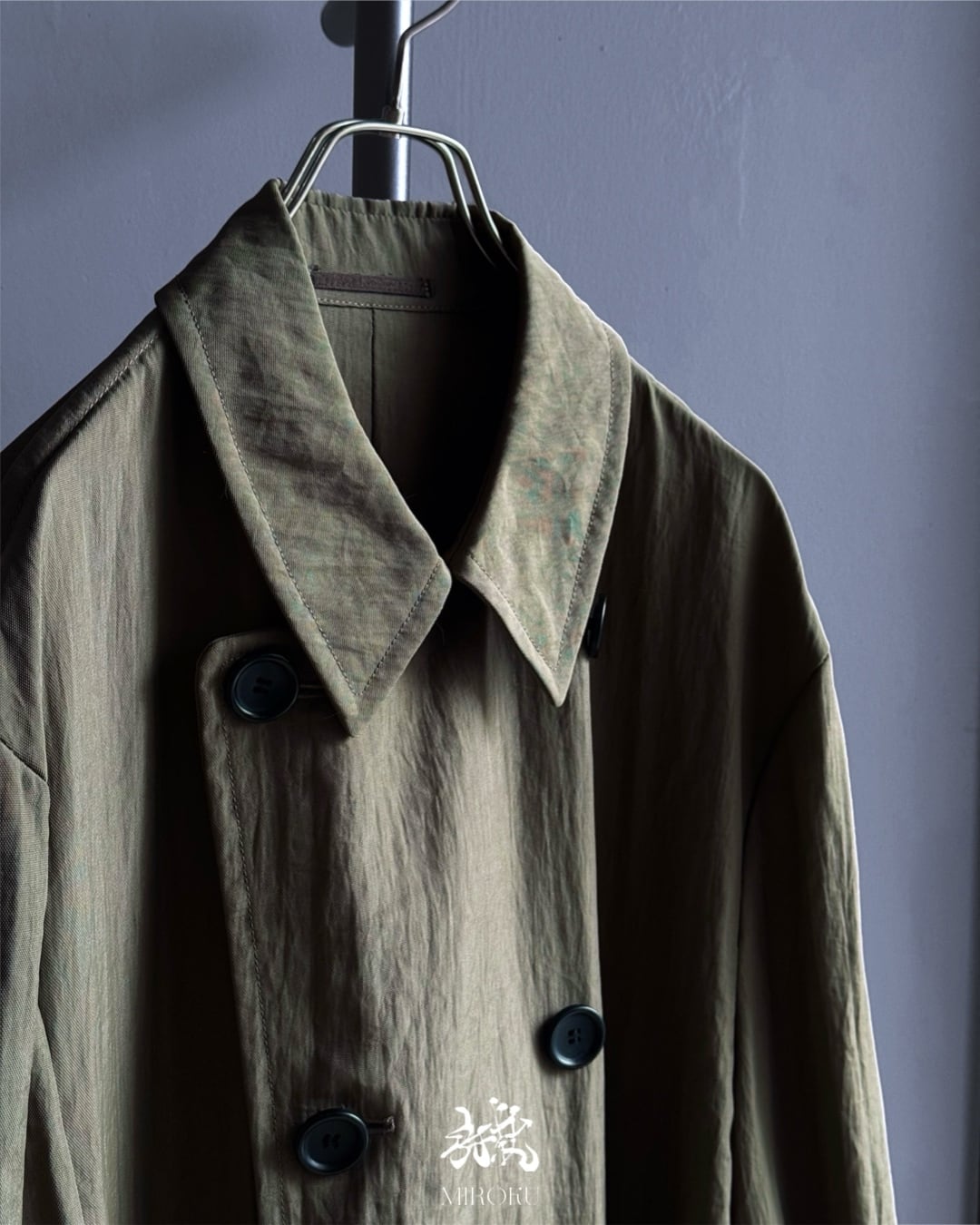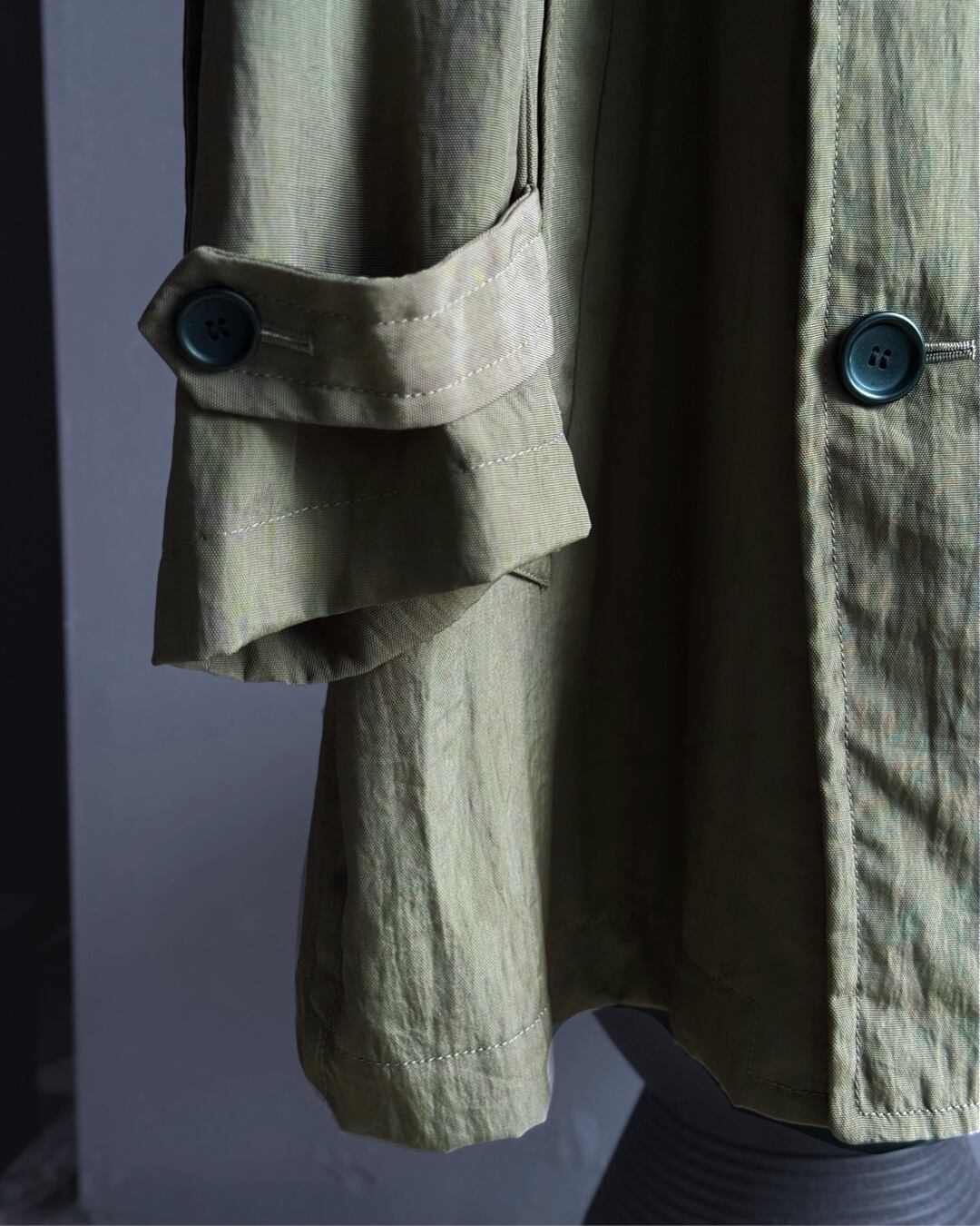 落ち着いたオリーブカラー、ボリュームのある袖口ストラップや大ぶりのボタン配置、立体的に浮き出たパイピングなど、ミリタリーとモードの要素が融合した秀逸なデザイン。