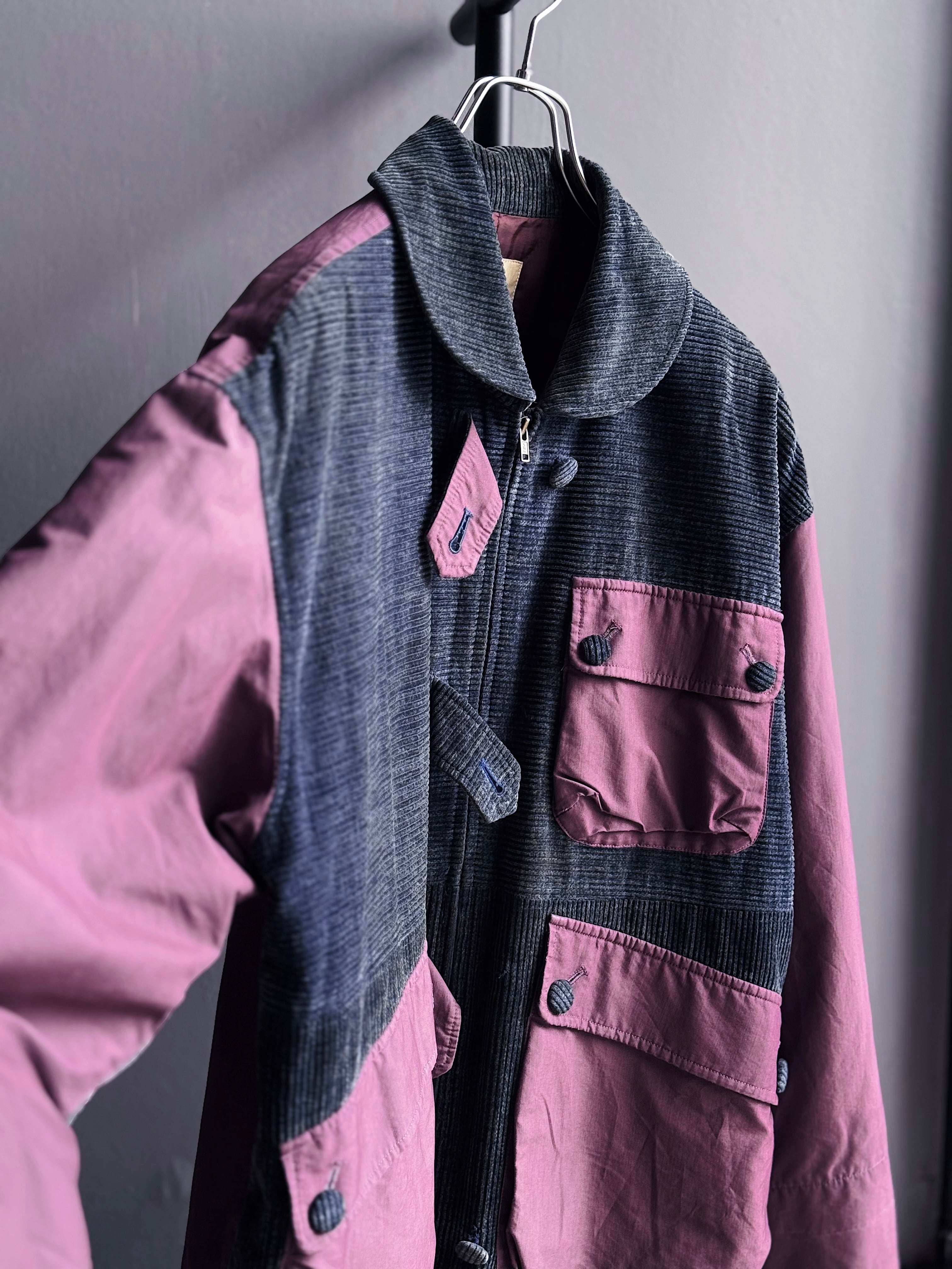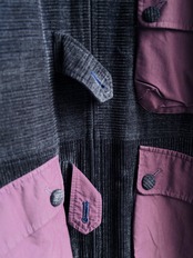 シャリ感のあるバーガンディコットンと寒色コーデュロイを組み合わせ、立体感あるコントラストを構築。