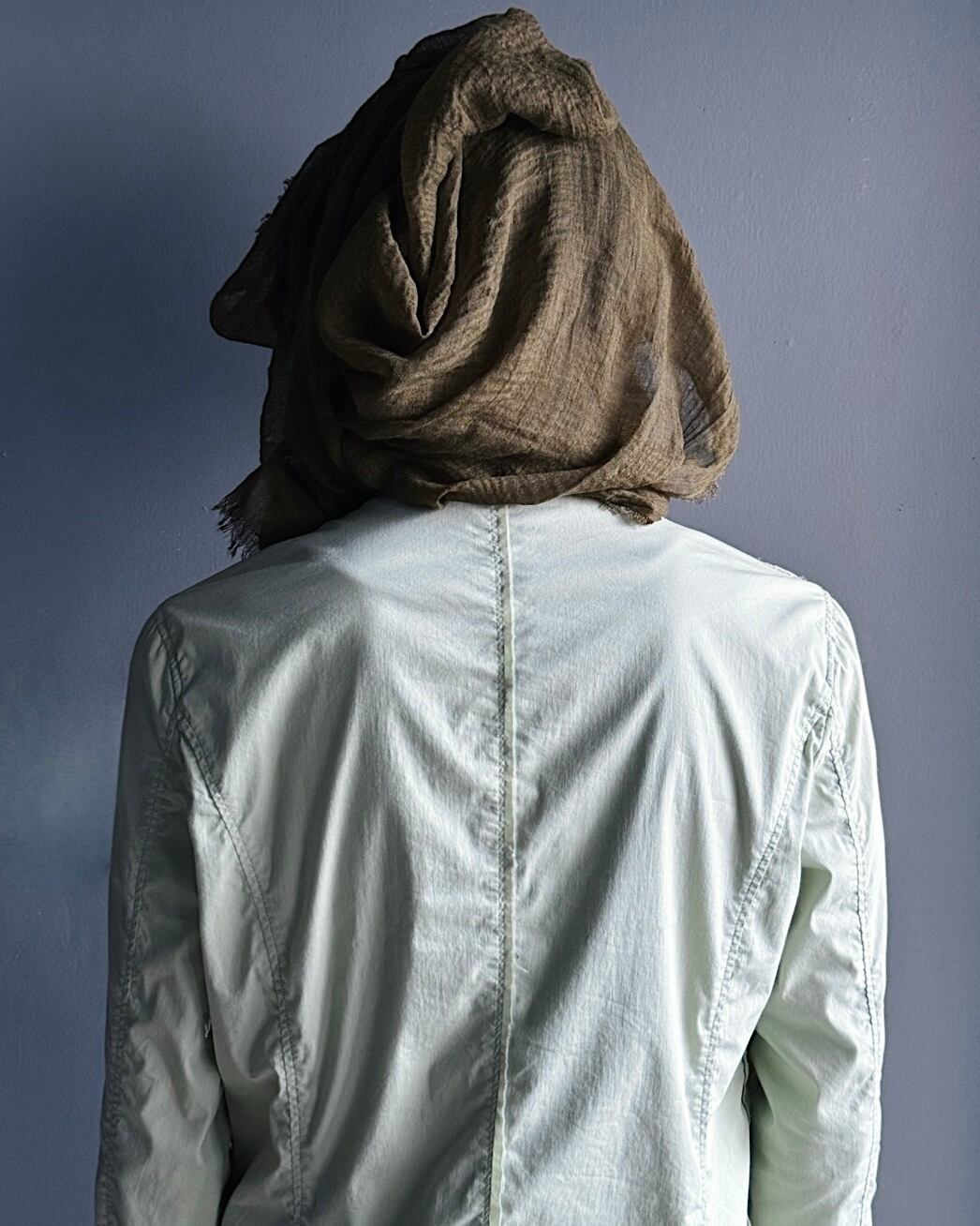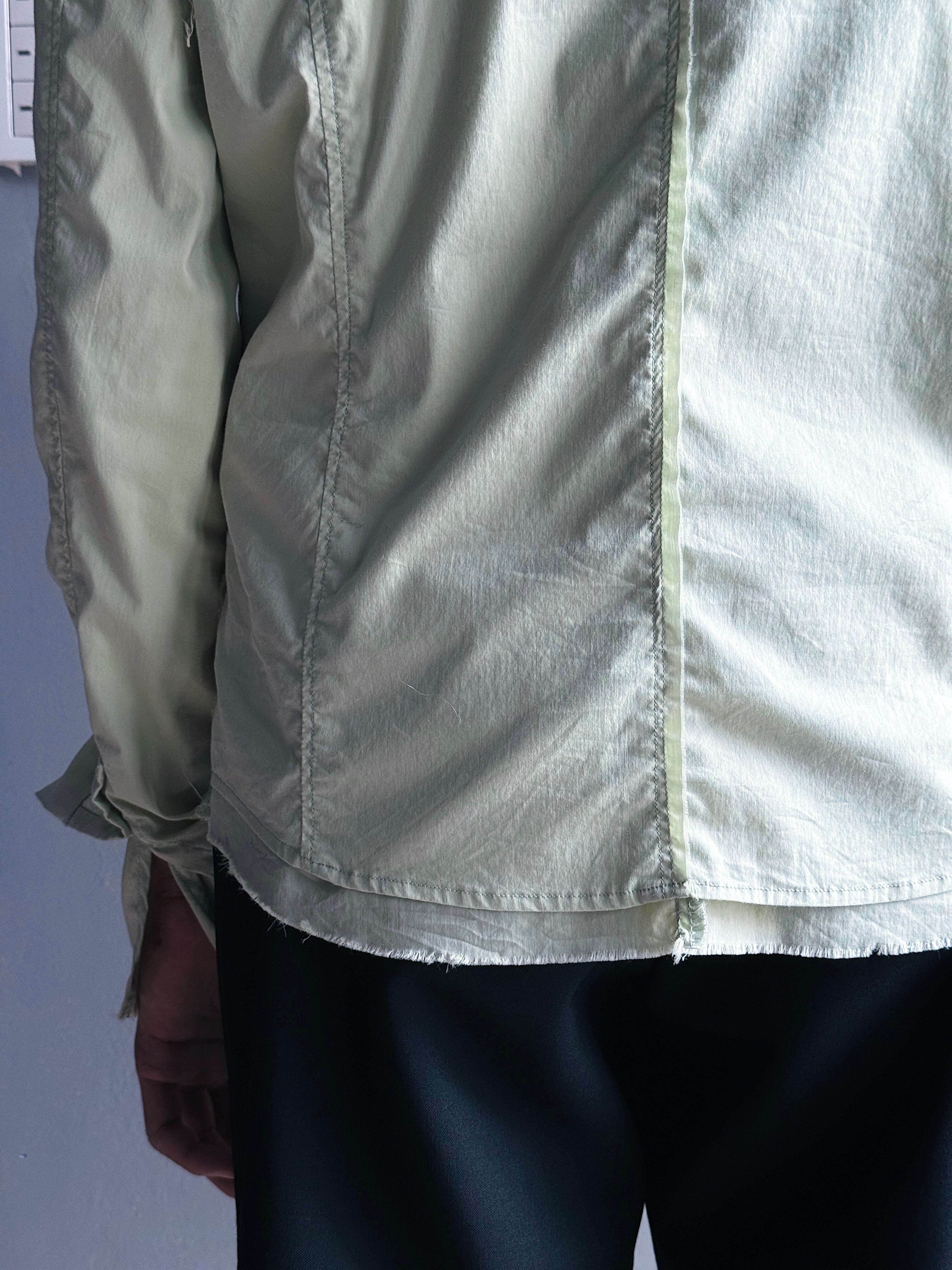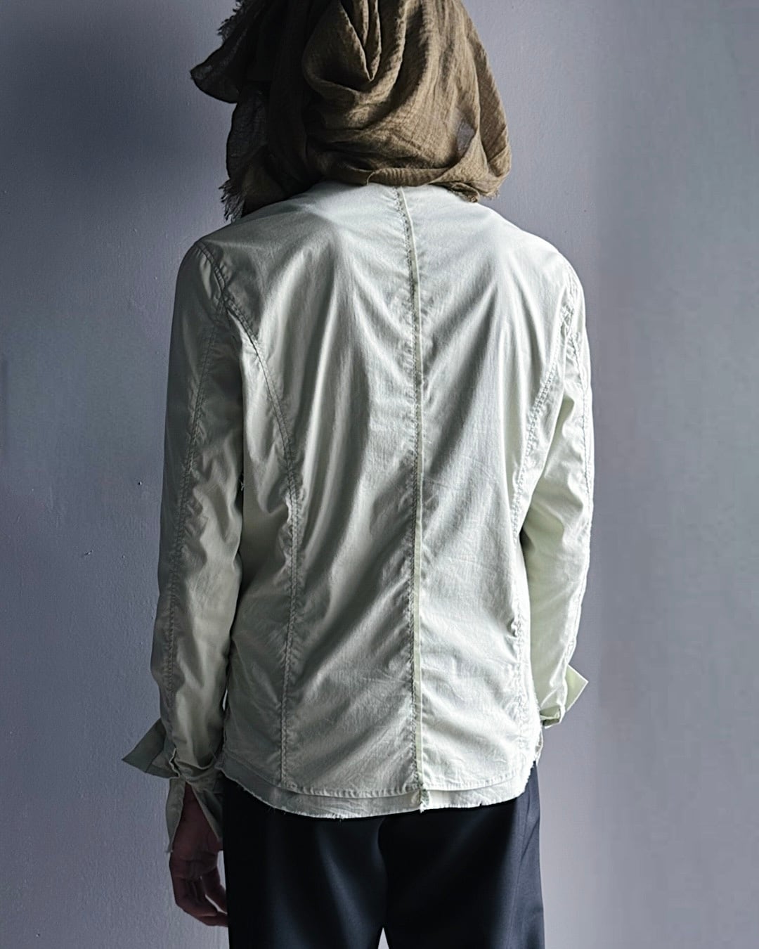 ペールグリーンの軽量コットンナイロン地を採用し、立体的なカッティングで身体に沿うシャープなシルエットを形成。