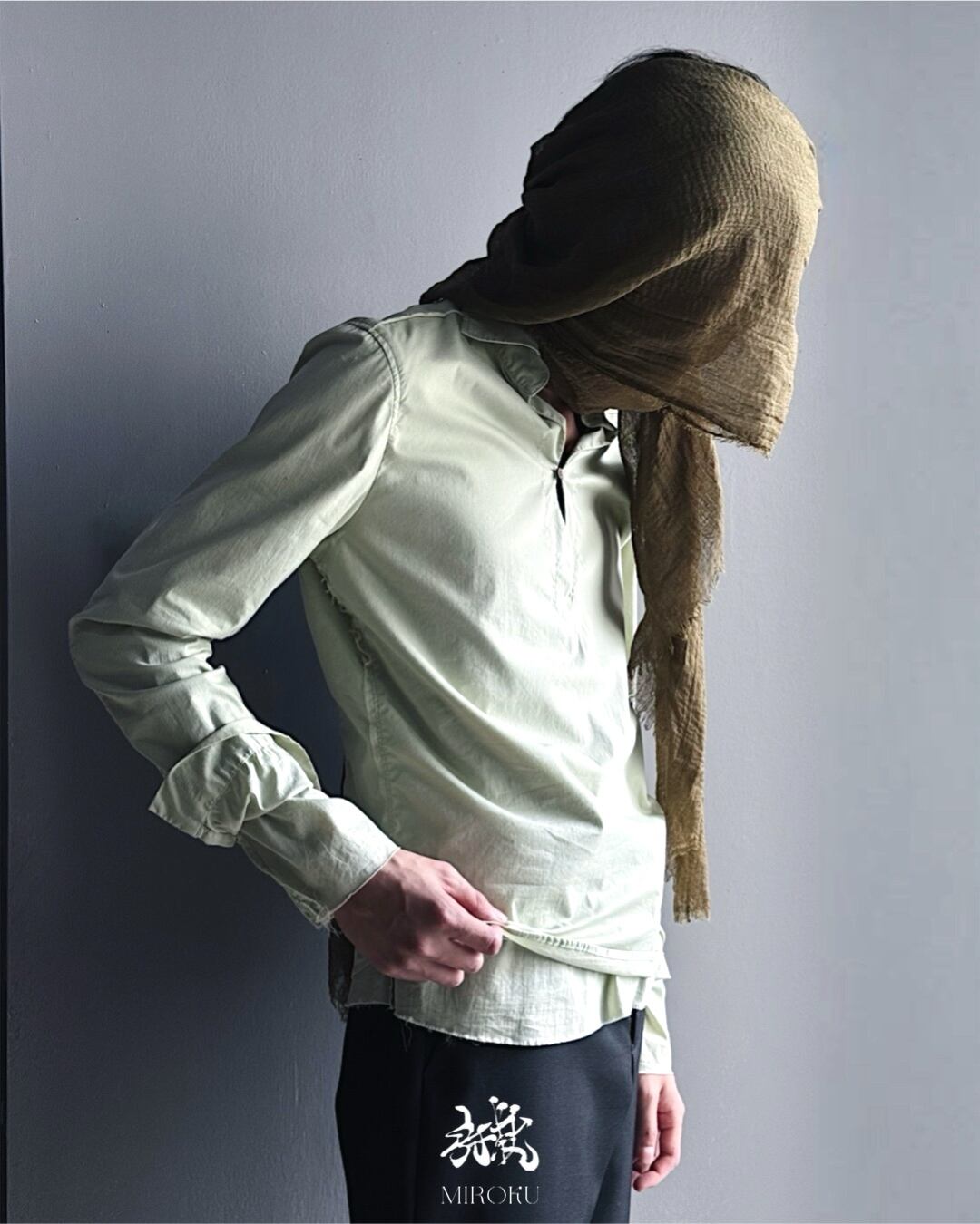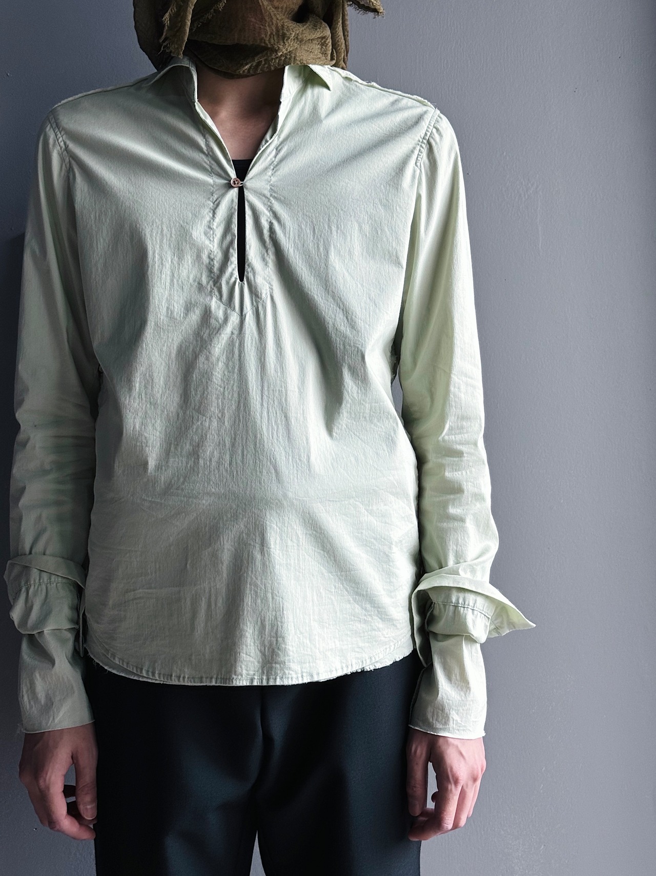 深いプラケットの1B仕様と断ち切りインサイドアウトディテールが特徴的なプルオーバーシャツ。