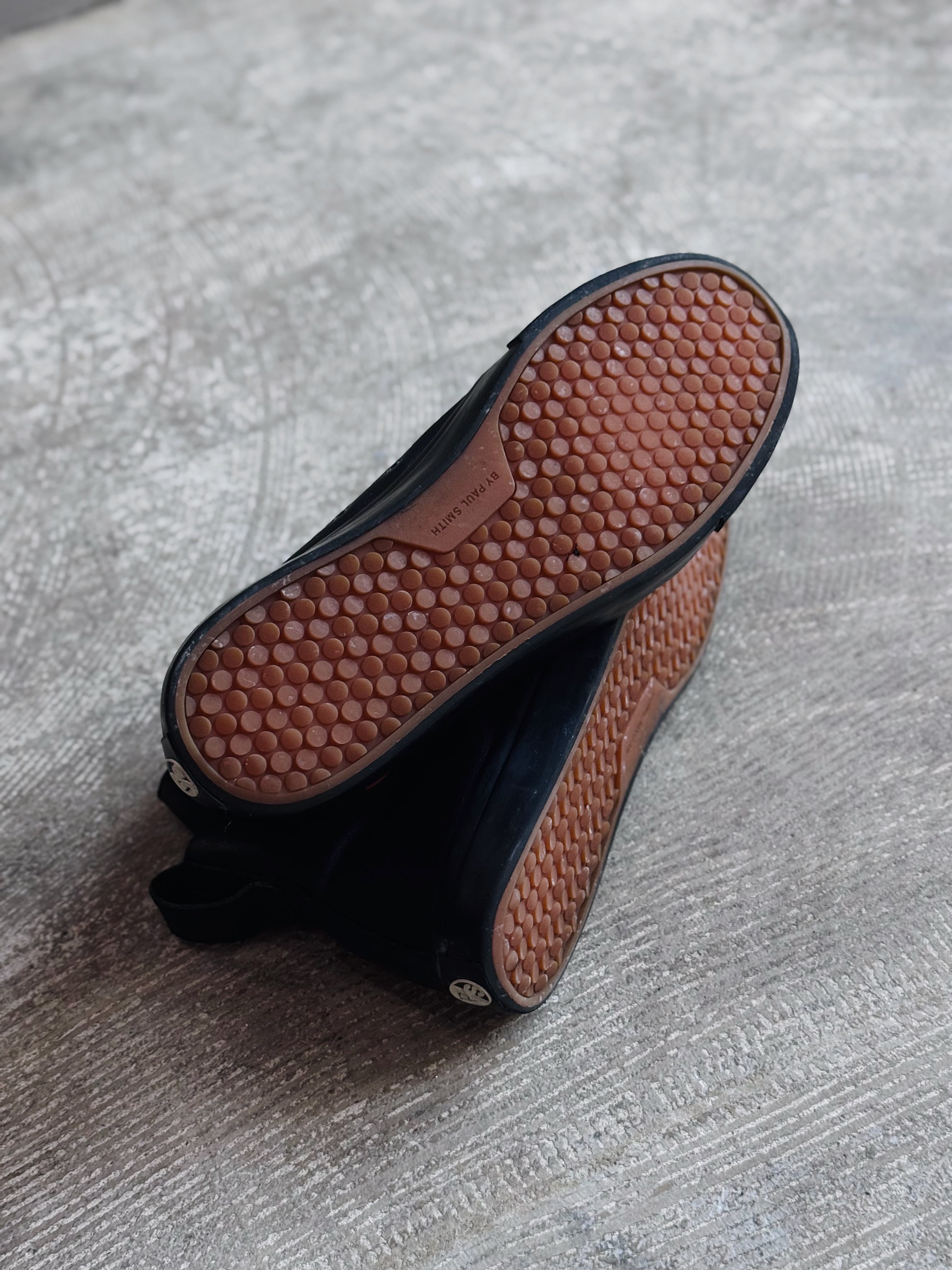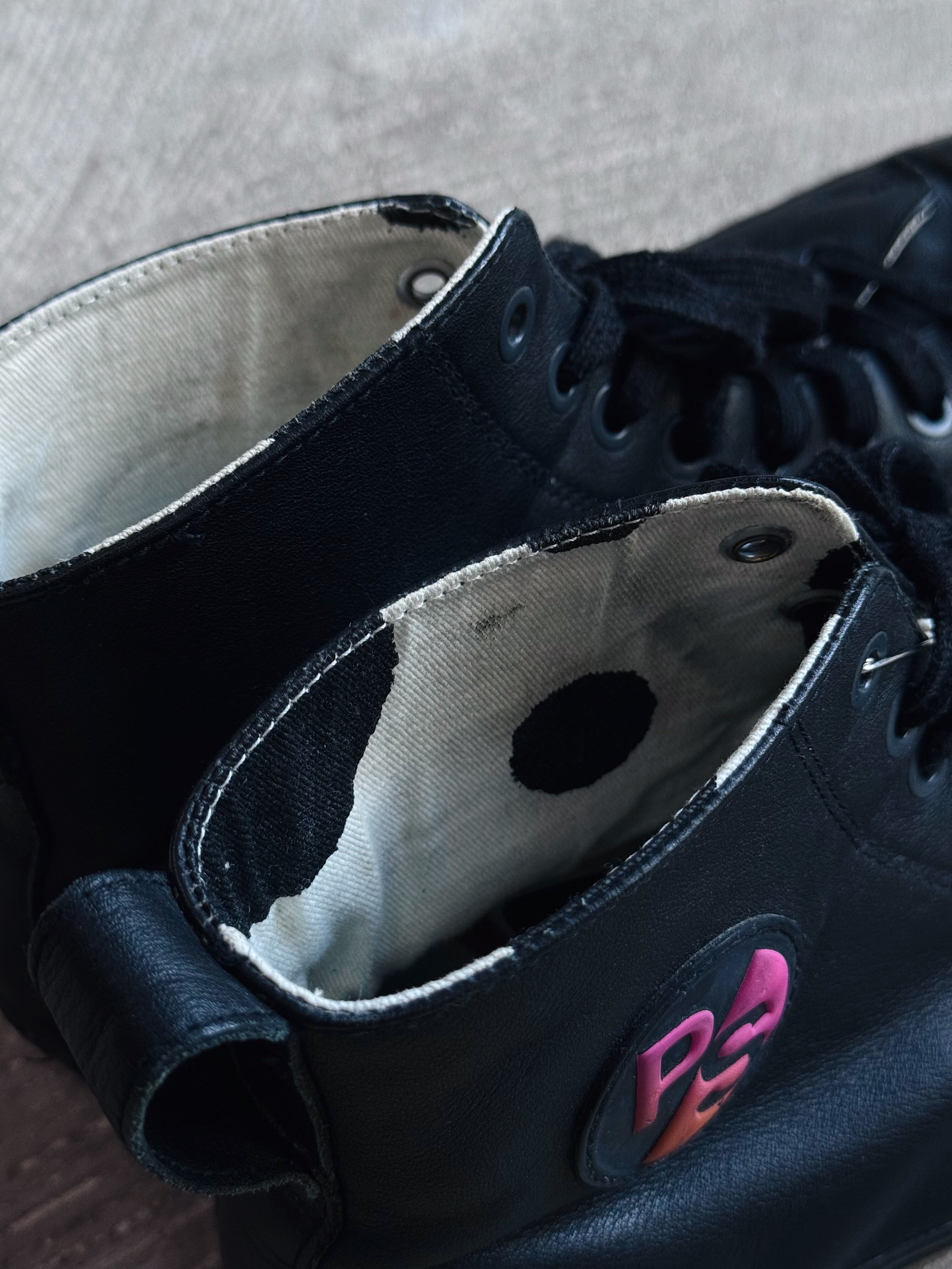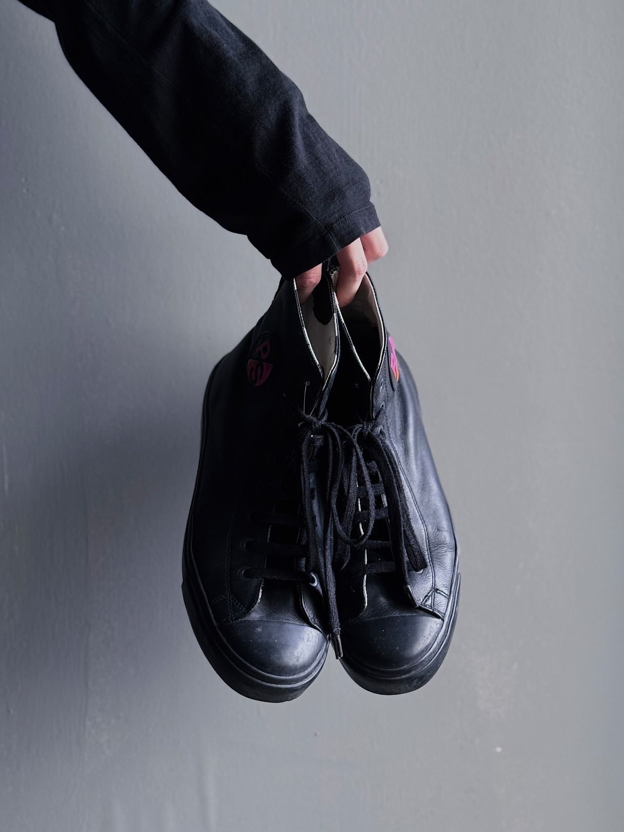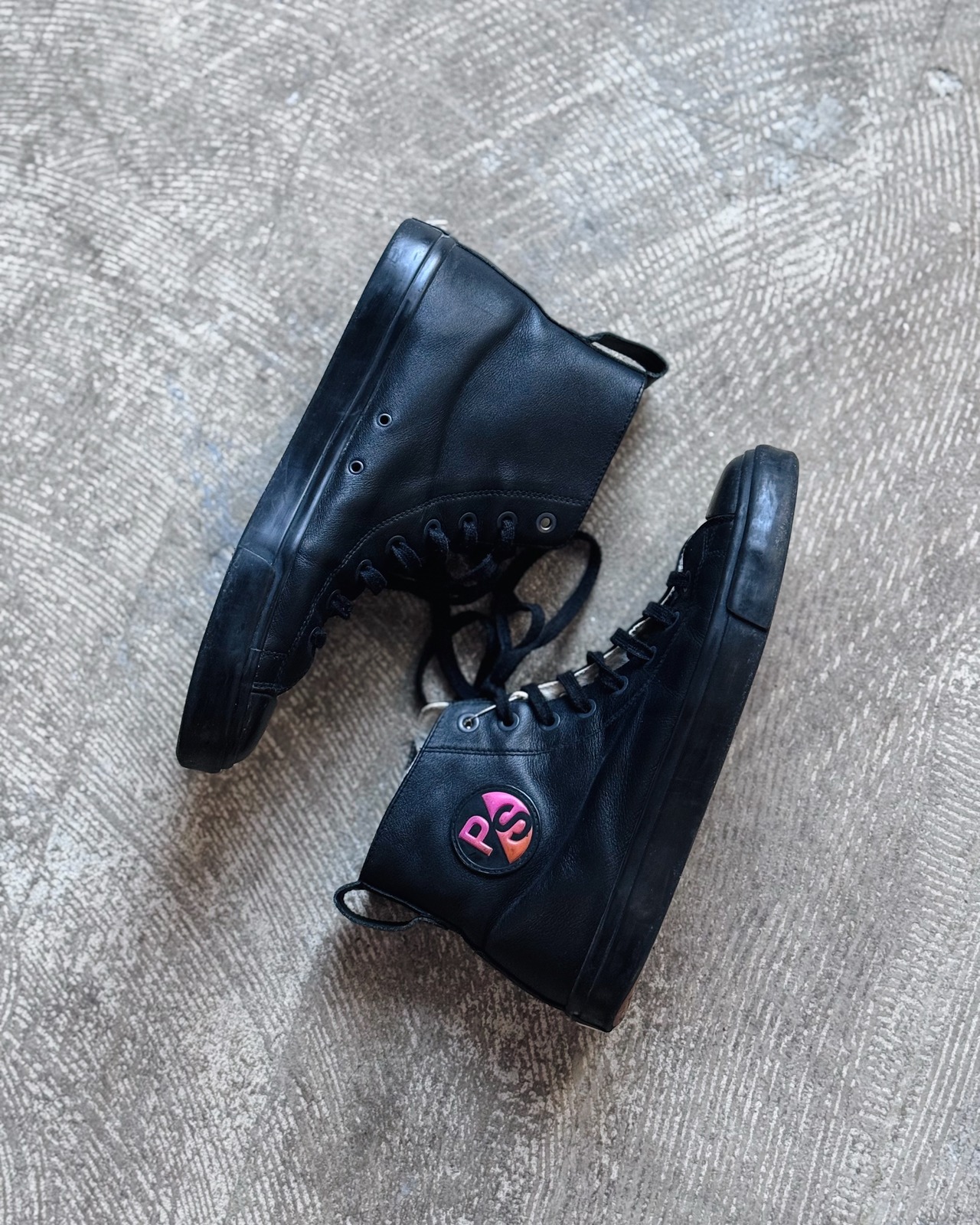 ブラックレザーをベースに、サイドに配されたグラデーションロゴがアクセントとなる一足。