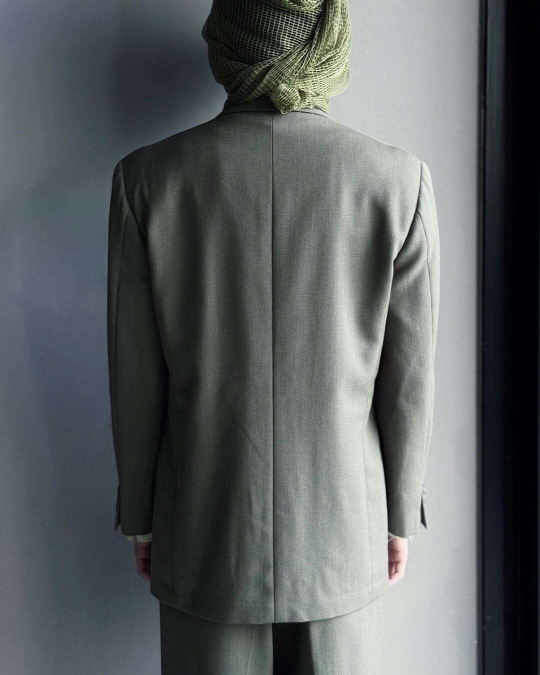 繊細な織り柄と深みのあるカーキグリーンが印象的な、イタリア製EMPORIO ARMANIのセットアップスーツ。