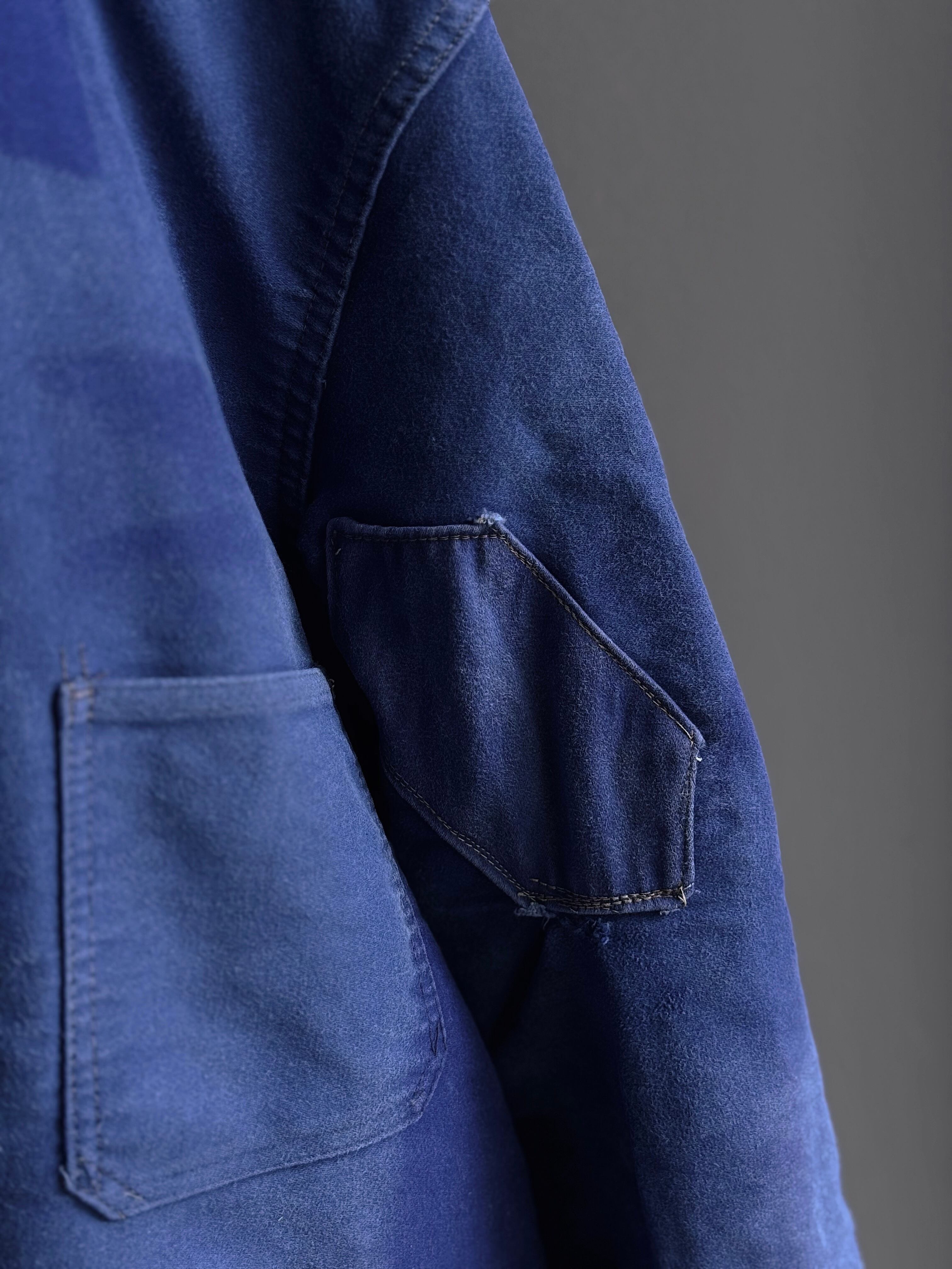 左袖には六角形の当て布、各所のリペア跡も含め、実用の中で形成されたヴィンテージならではの表情が魅力。