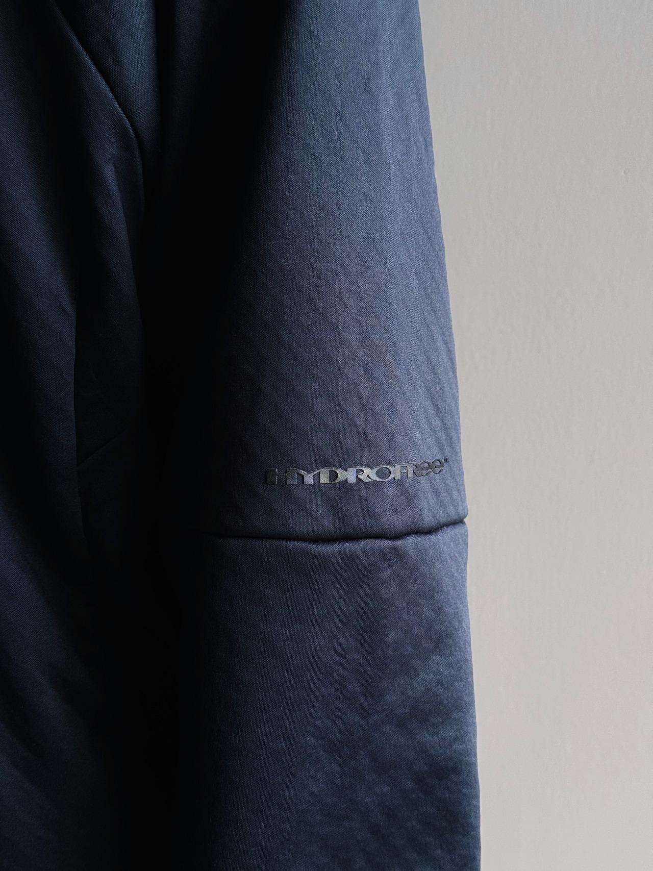 マットな質感のナイロン系素材に、シャープなパネル切替と同系色のロゴ刺繍を配した一着。