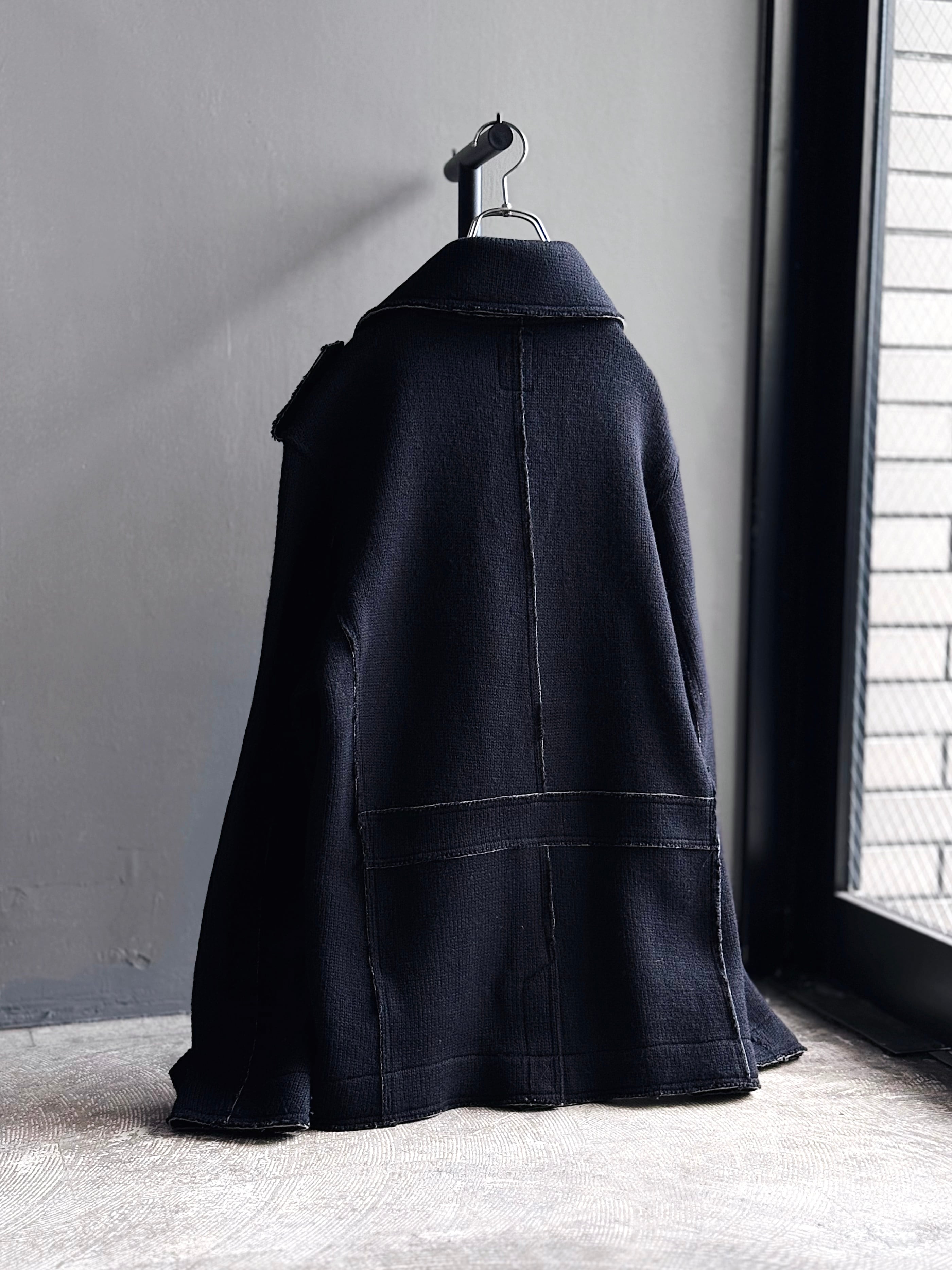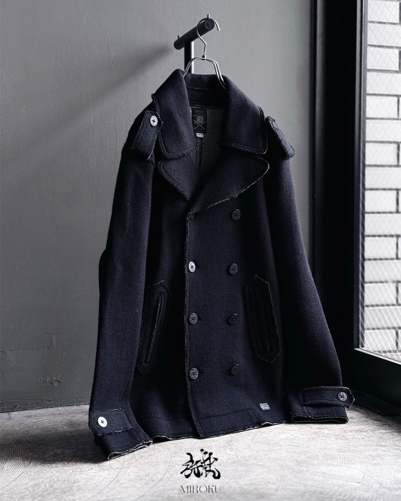 重厚なミリタリー由来のピーコートを、ローゲージニットのような表情豊かなウール地で再構築。