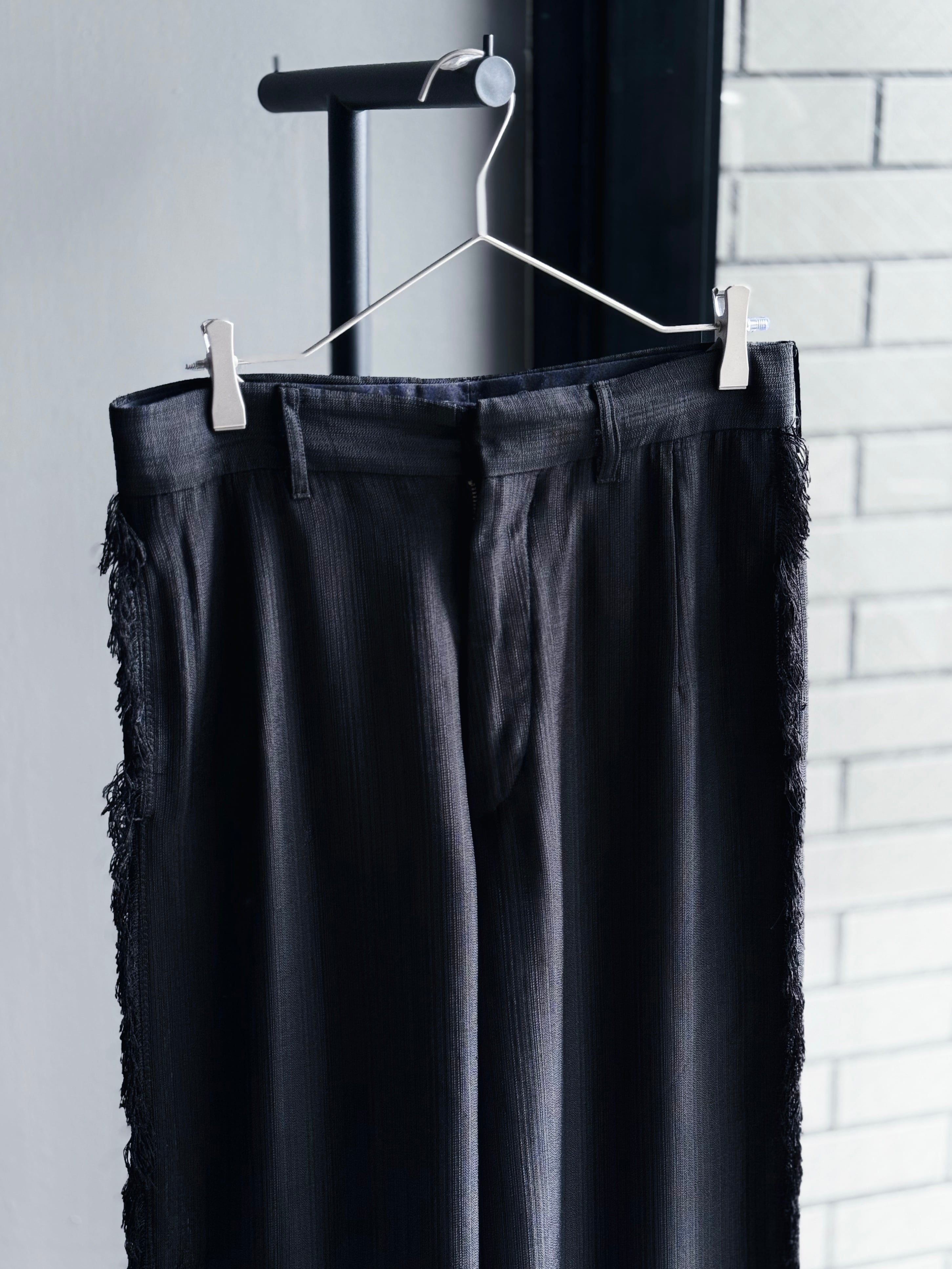 上品な光沢を帯びたトロミのあるワイドシルエットに、サイドには繊細なフリンジ装飾が施され、動きに合わせて柔らかく揺れる仕立て。