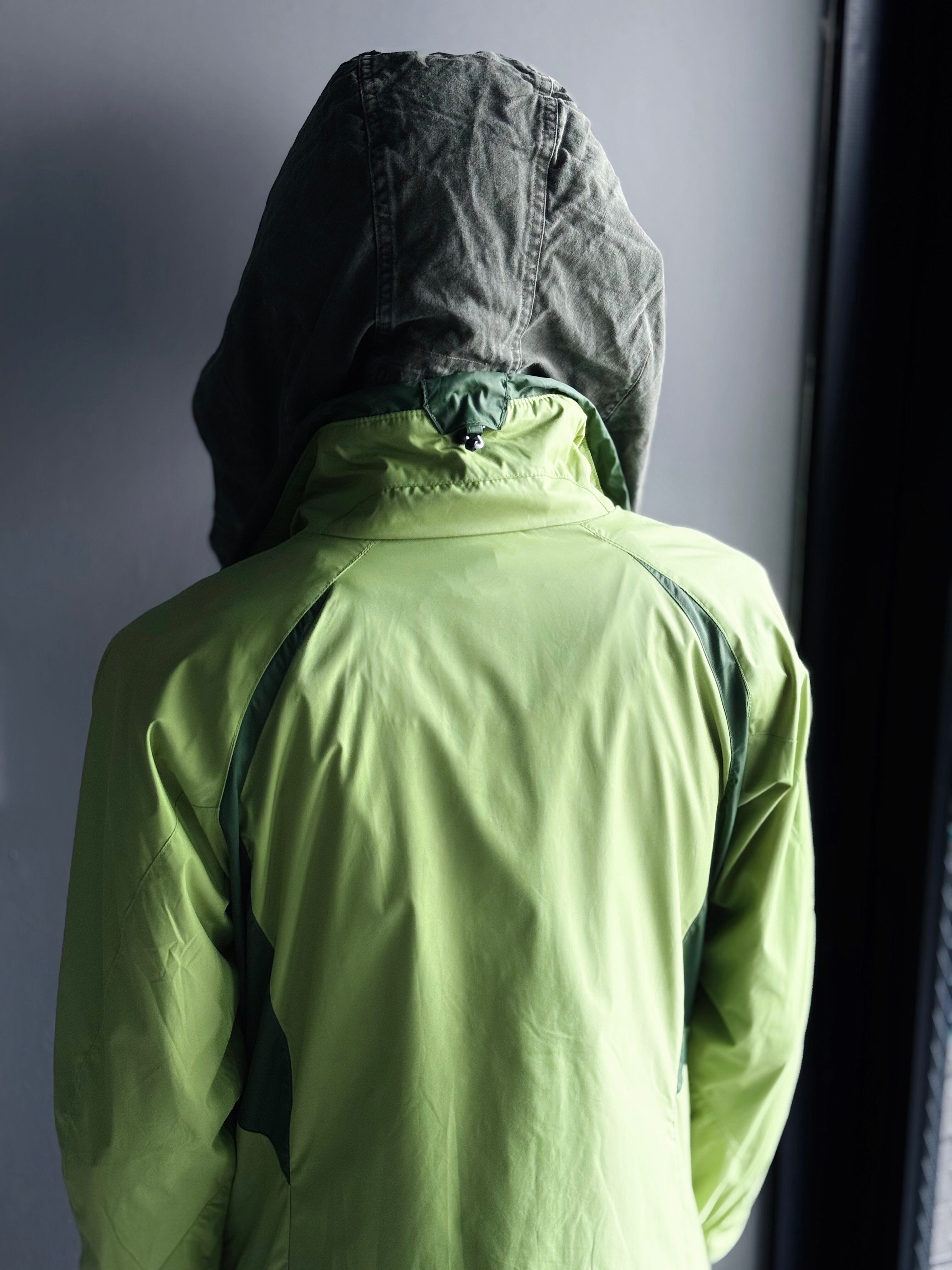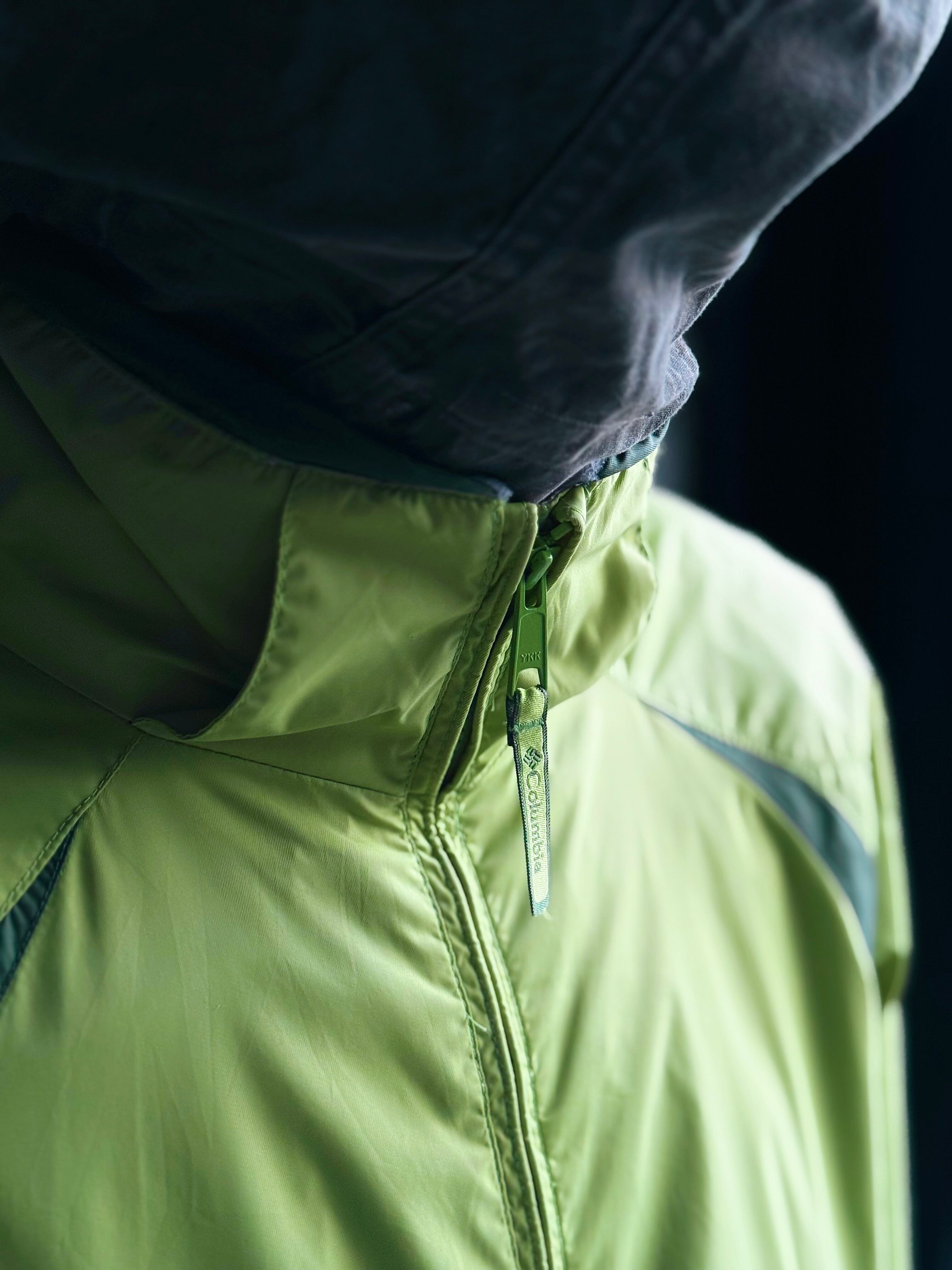 淡いグリーンに深みのあるダークグリーンの切り替えが映える、Columbia製の高機能シェルジャケット。軽量ながら防水・透湿性を備えた“Interchange”シリーズ。