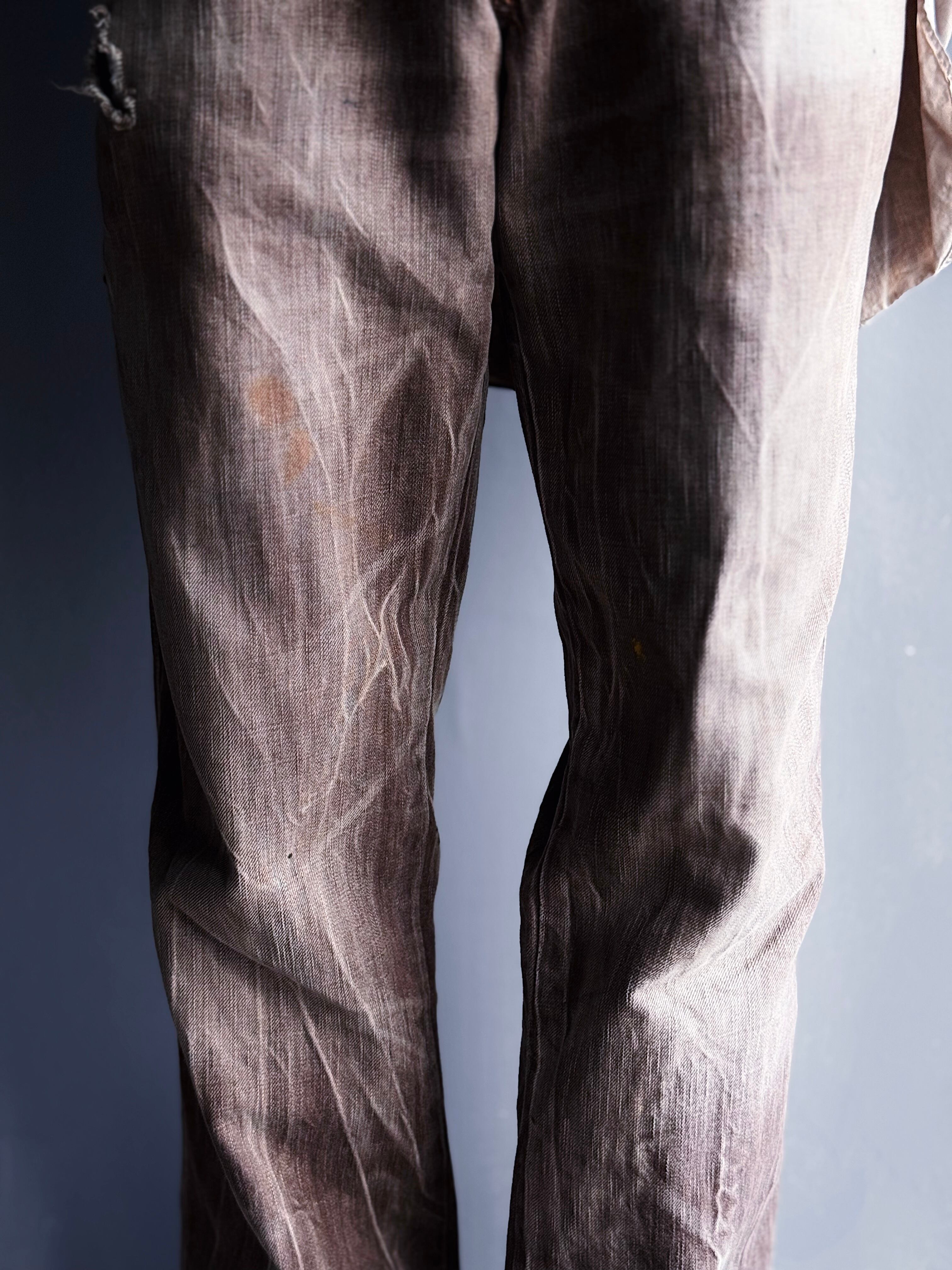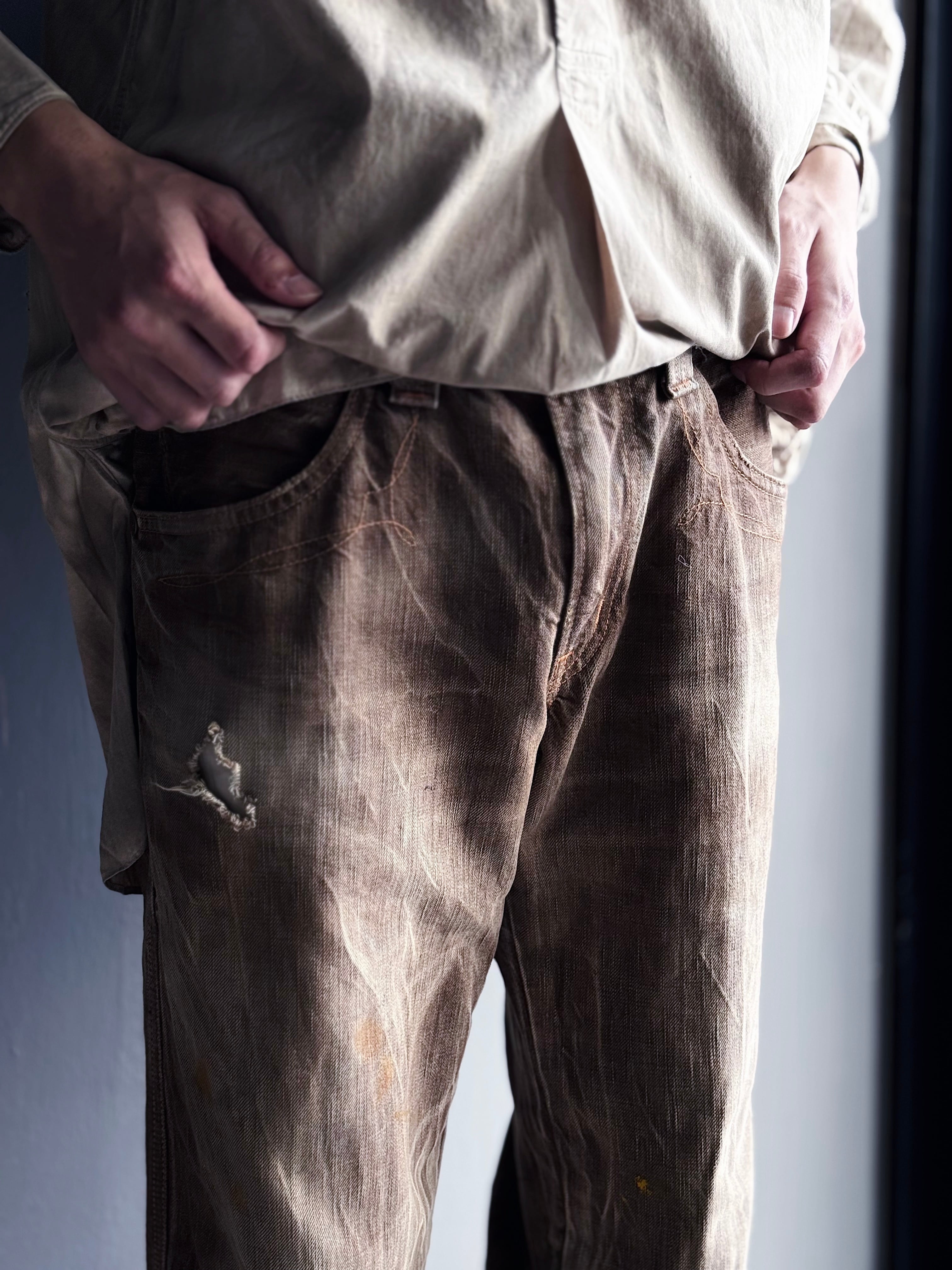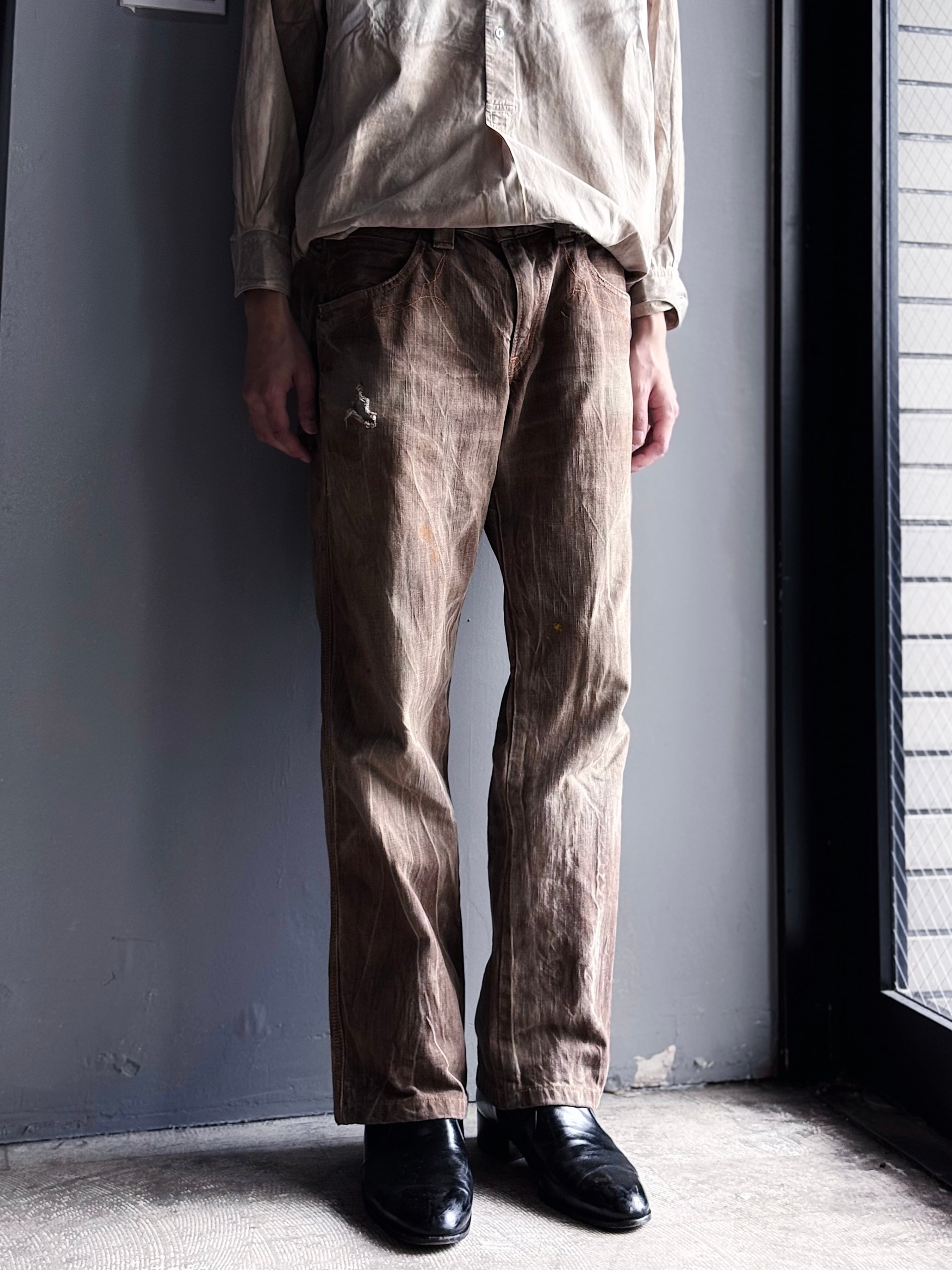 ブラウンベースに淡く浮かび上がる色ムラ、各所に飛んだペンキ跡やダメージが、穿き込まれた一本ならではのオーラを形成。
