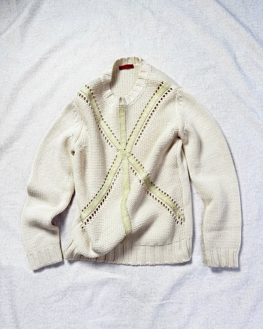 立体的なクロス編みディテールが目を引く、291295=HOMMEによる変則ケーブルニット。