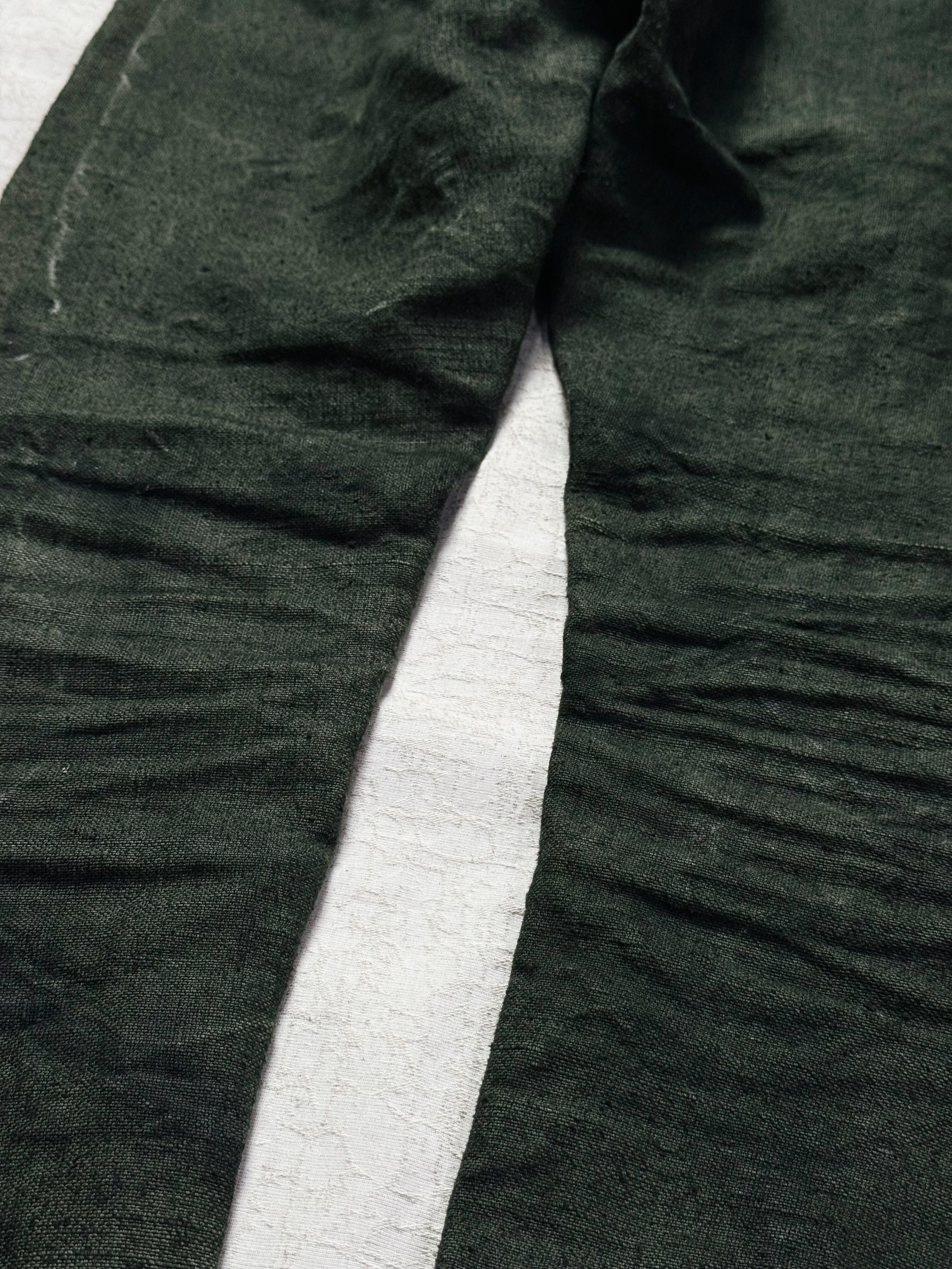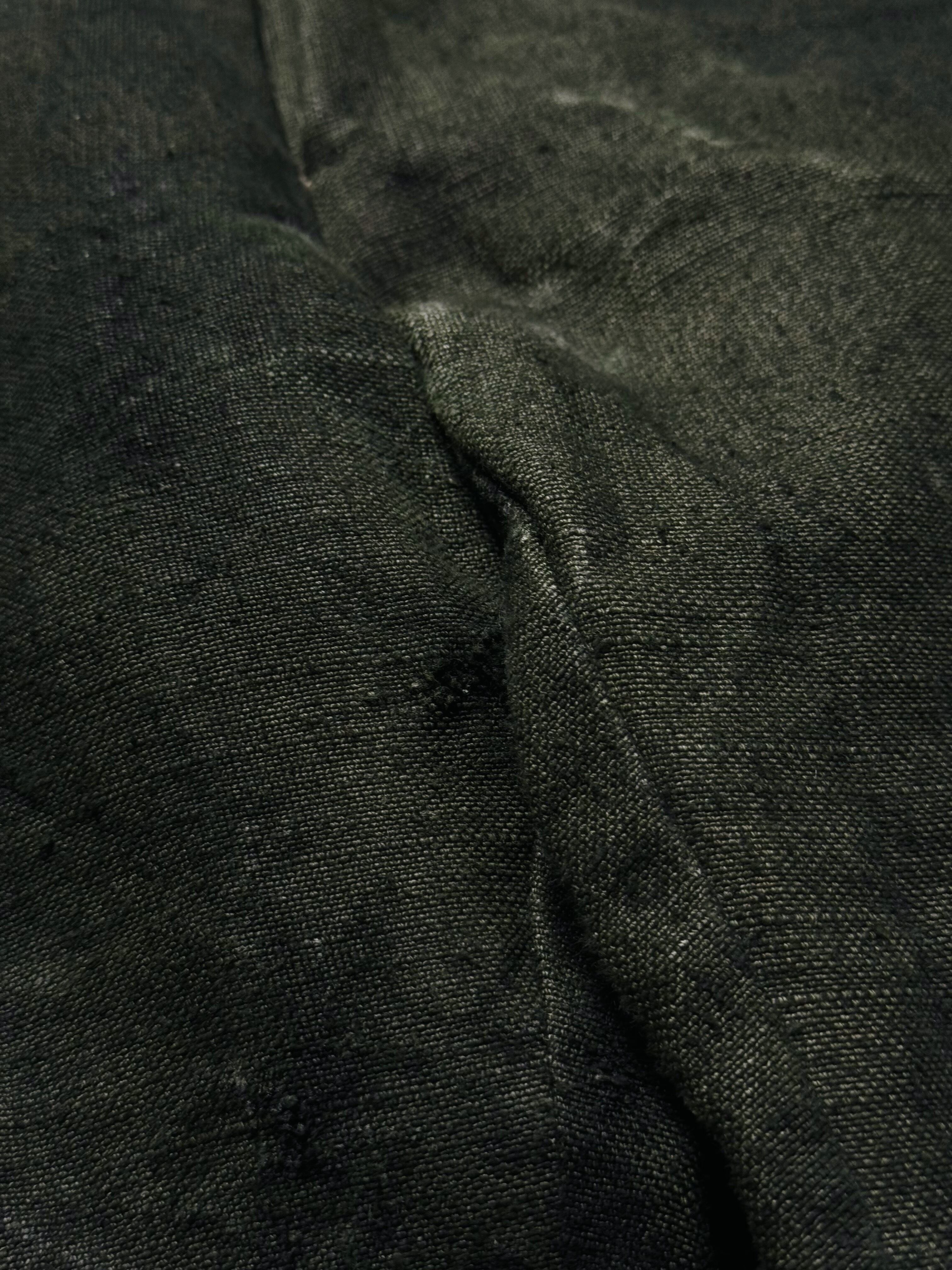 墨黒〜オリーブを混ぜたような深いトーンが印象的で、厚手のリネン特有の表情豊かなシワ感とムラ染めのような質感が魅力。
