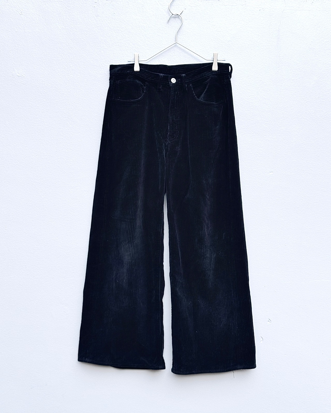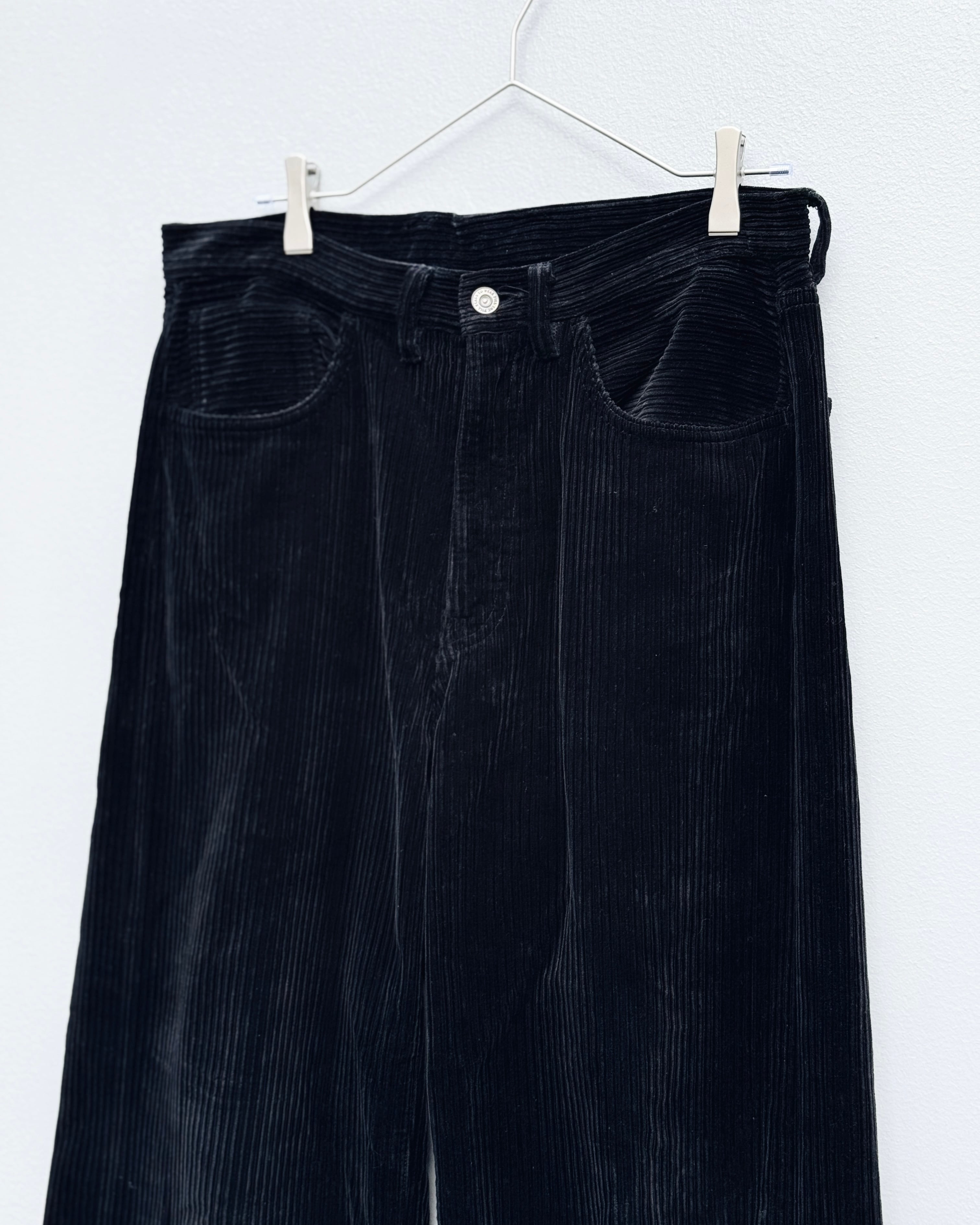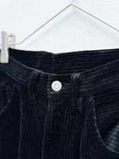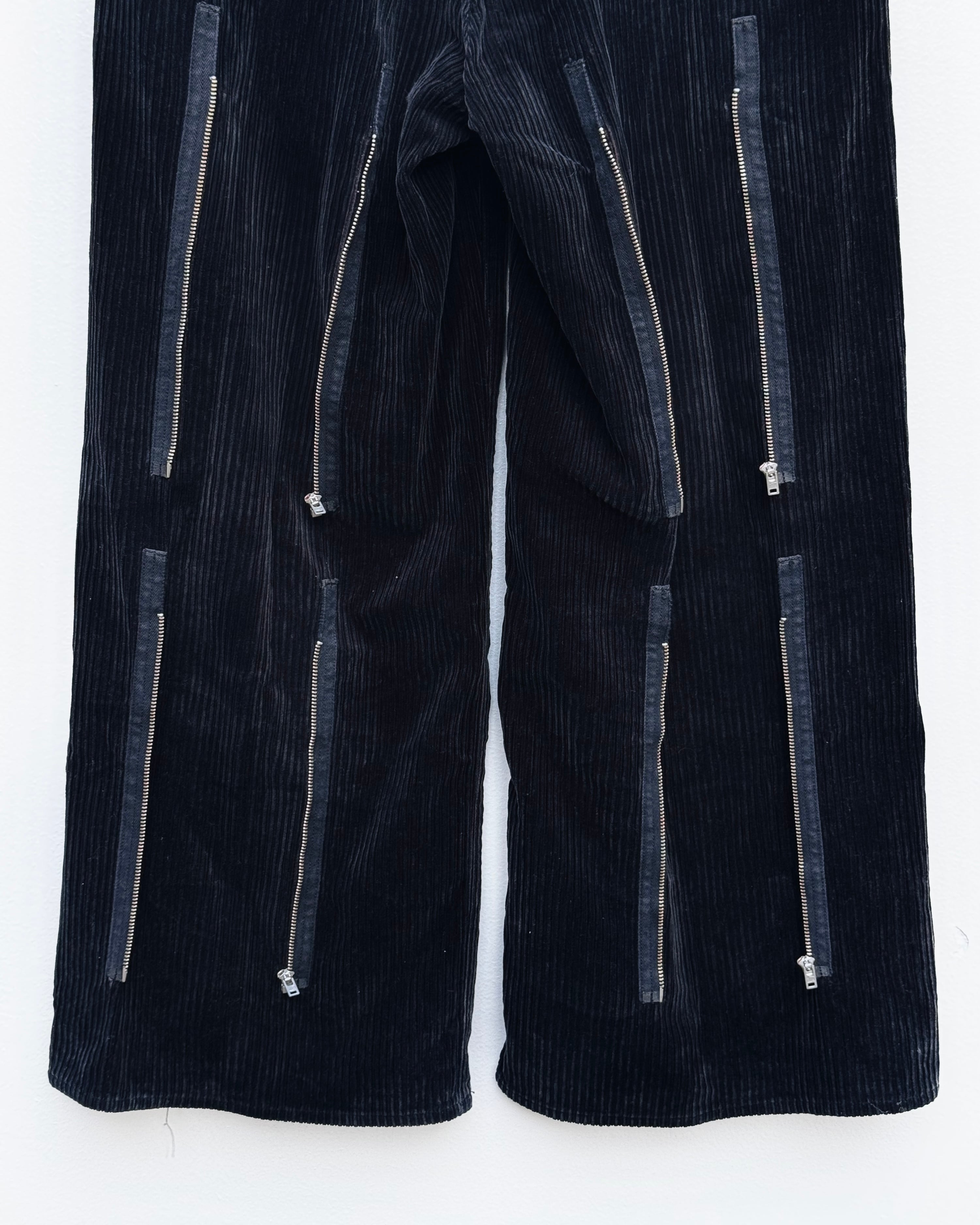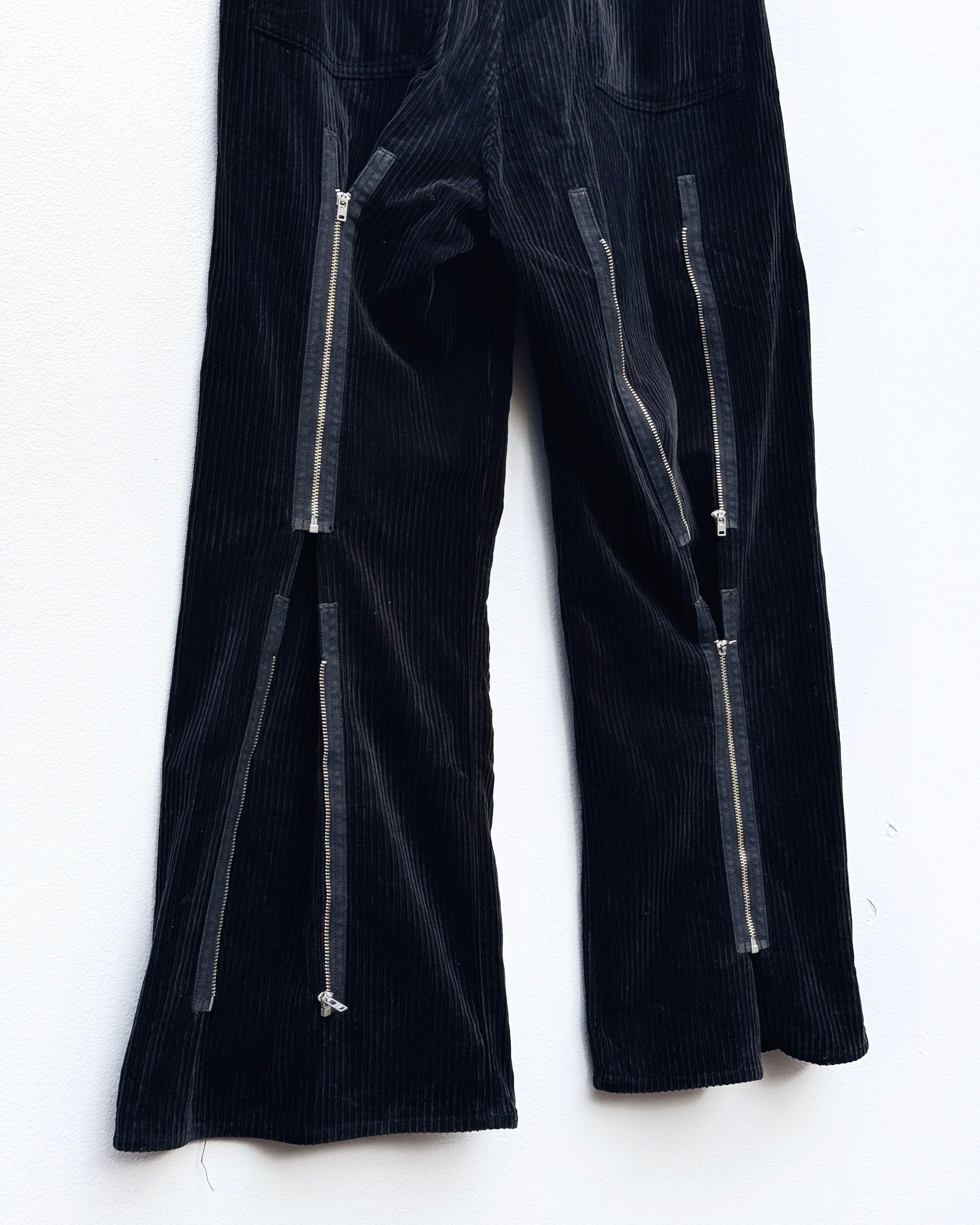 コーデュロイに無数のジップを走らせ、バギー/フレア/ストレート/テーパードの4種へ可変する設計が魅力の一本。