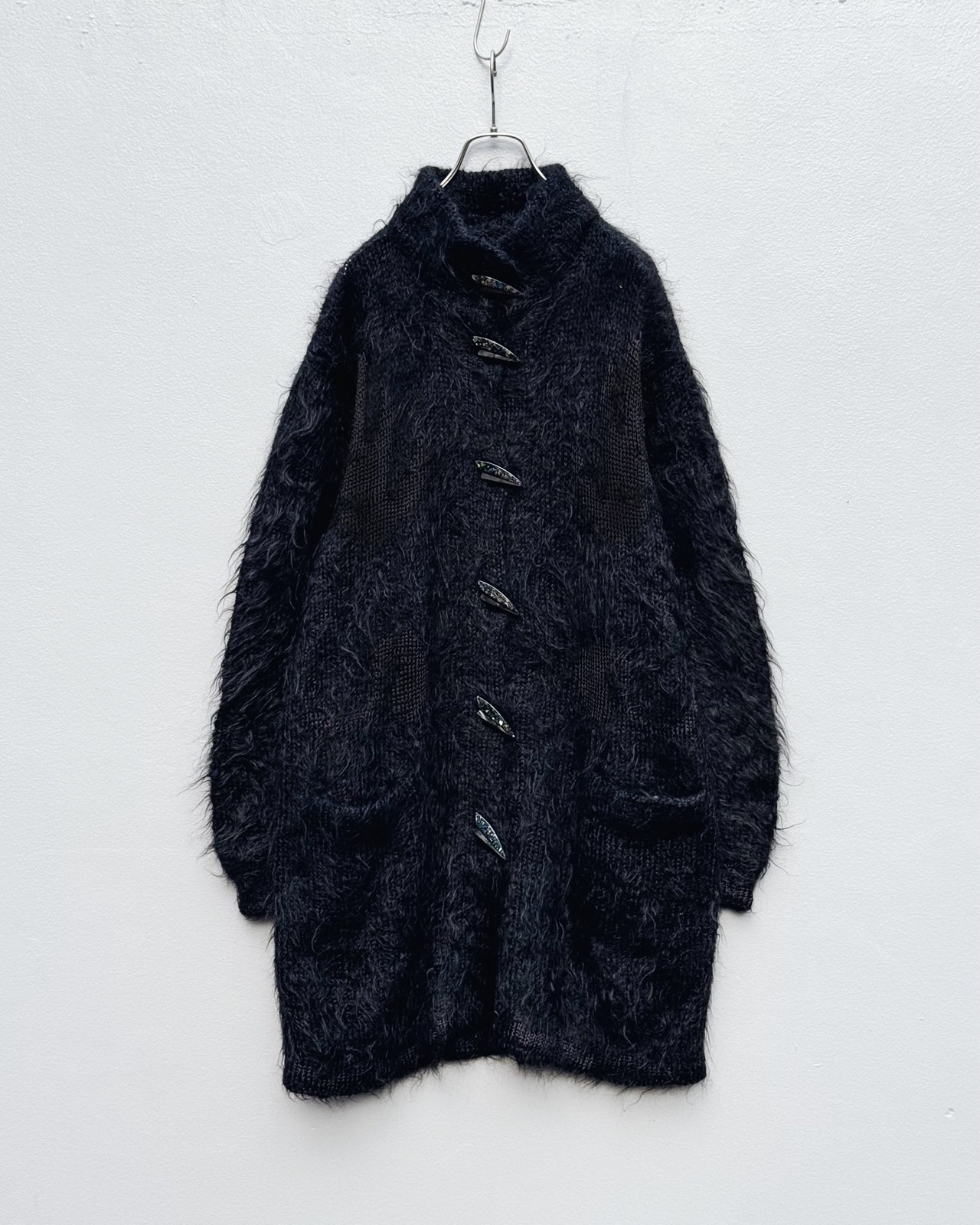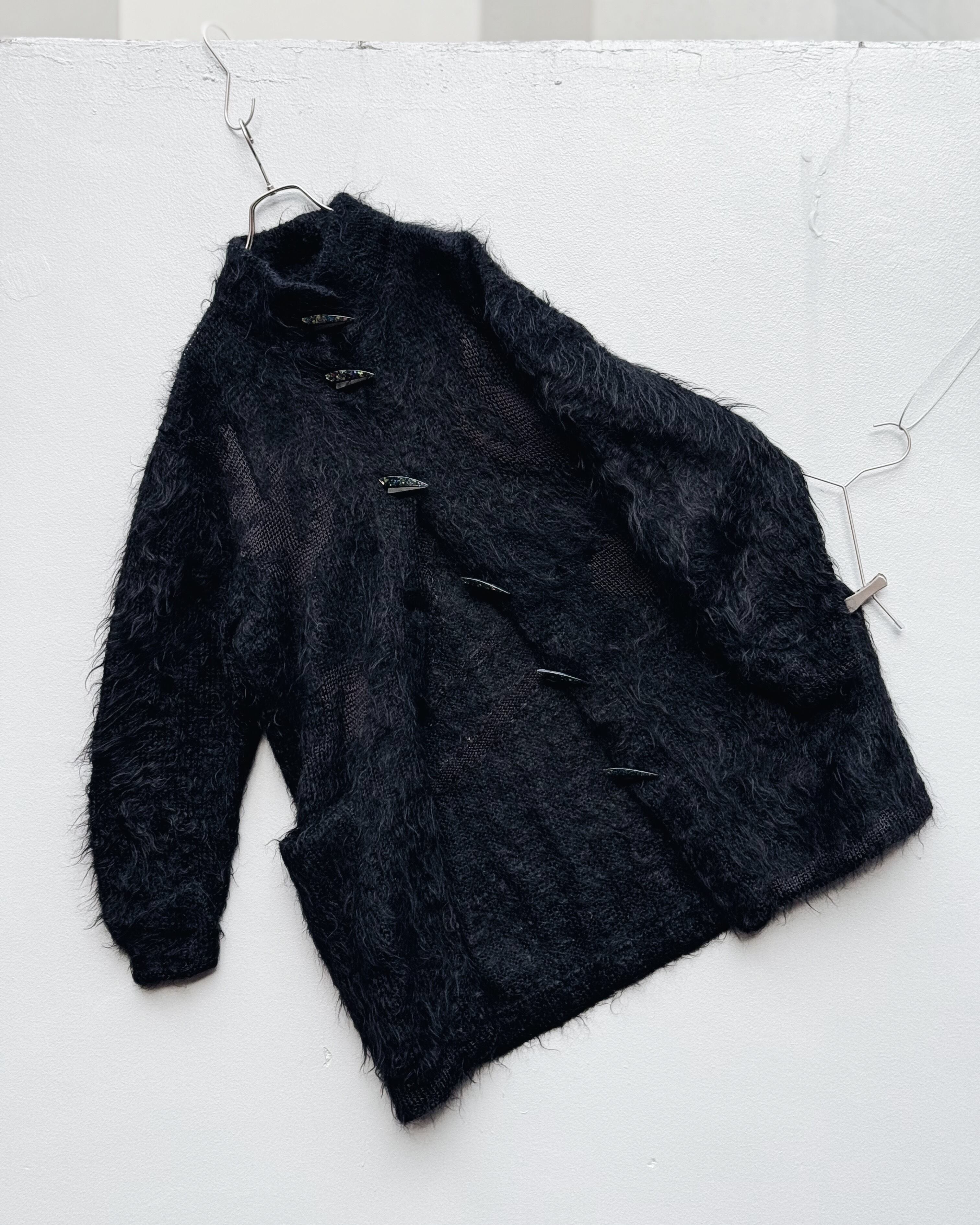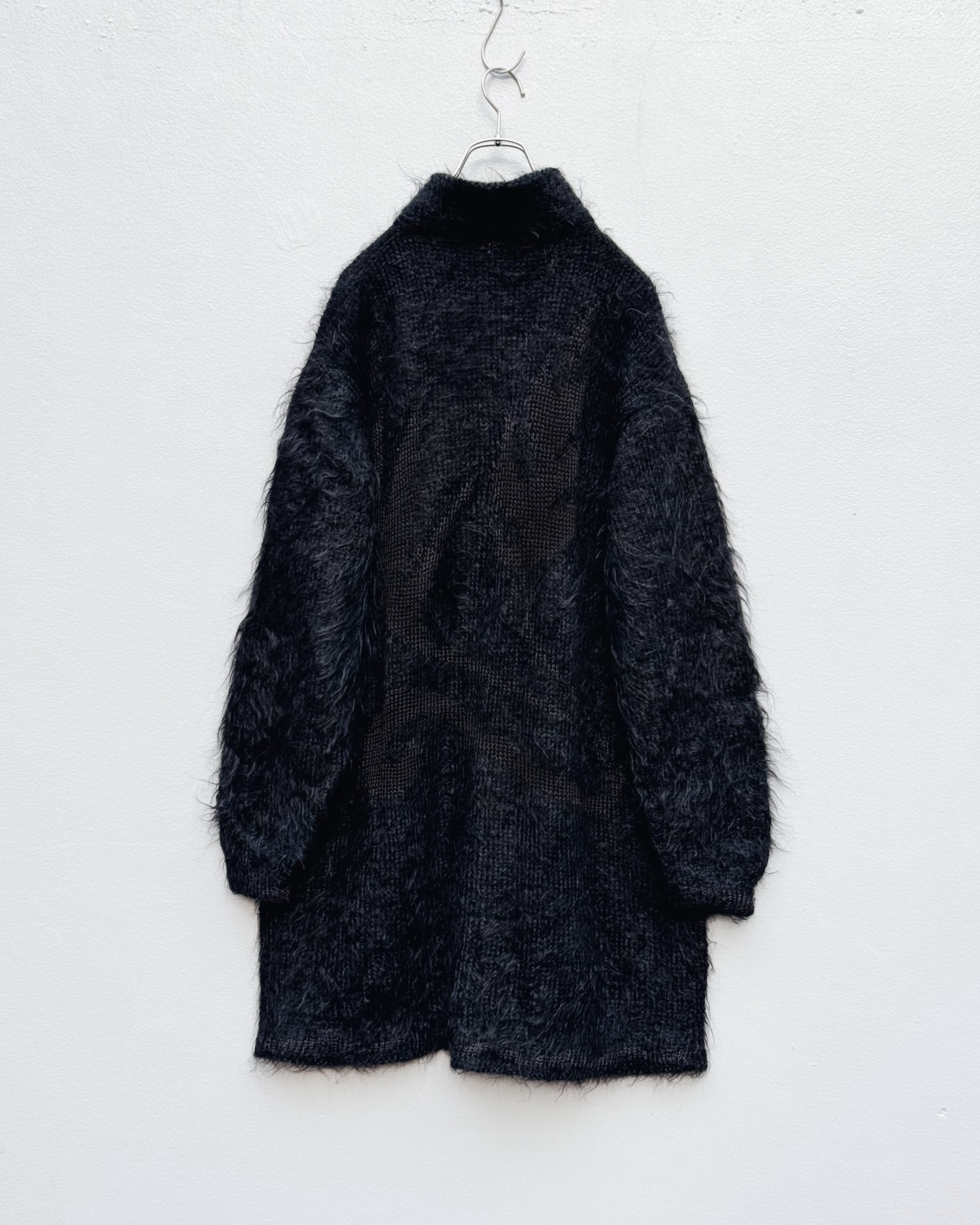 しっかりと長さを取った着丈に、密度のある毛足、モヘア特有の軽さは保ちつつ、羽織りとしての構築性も備えたバランス感が秀逸。