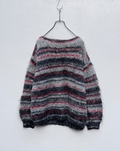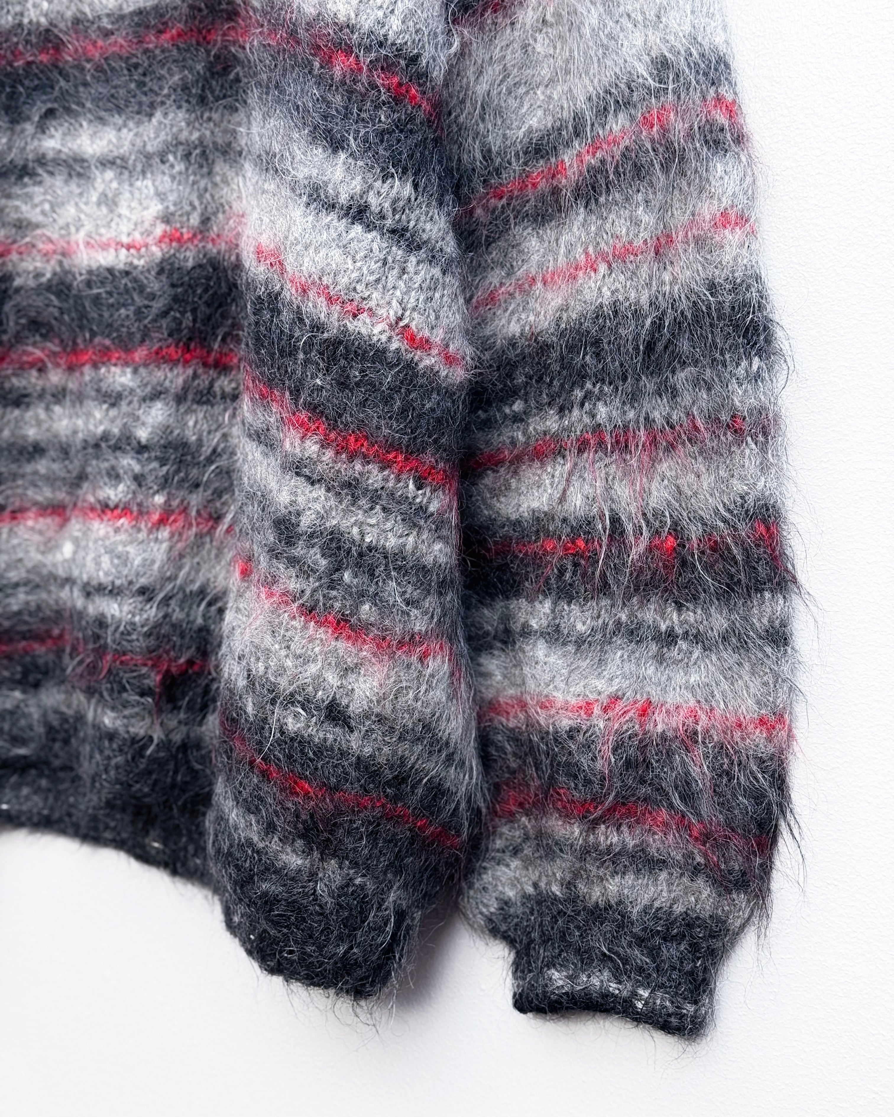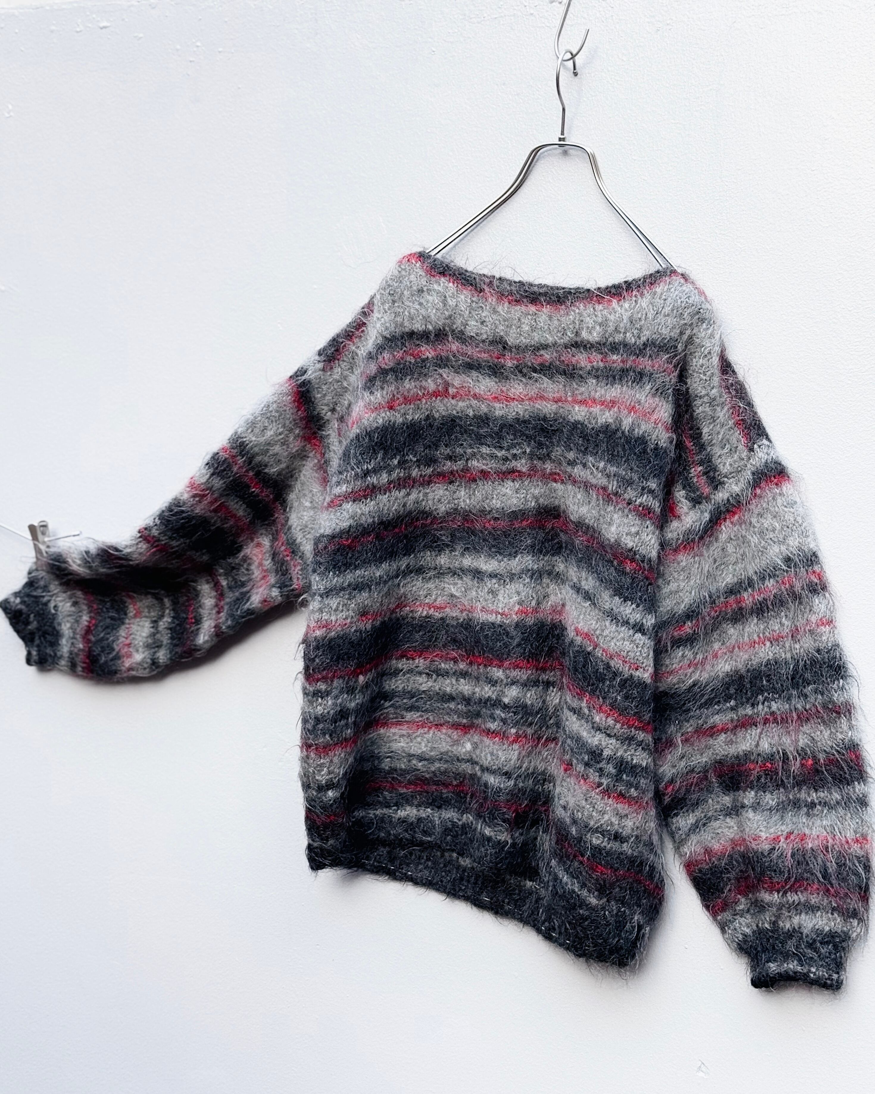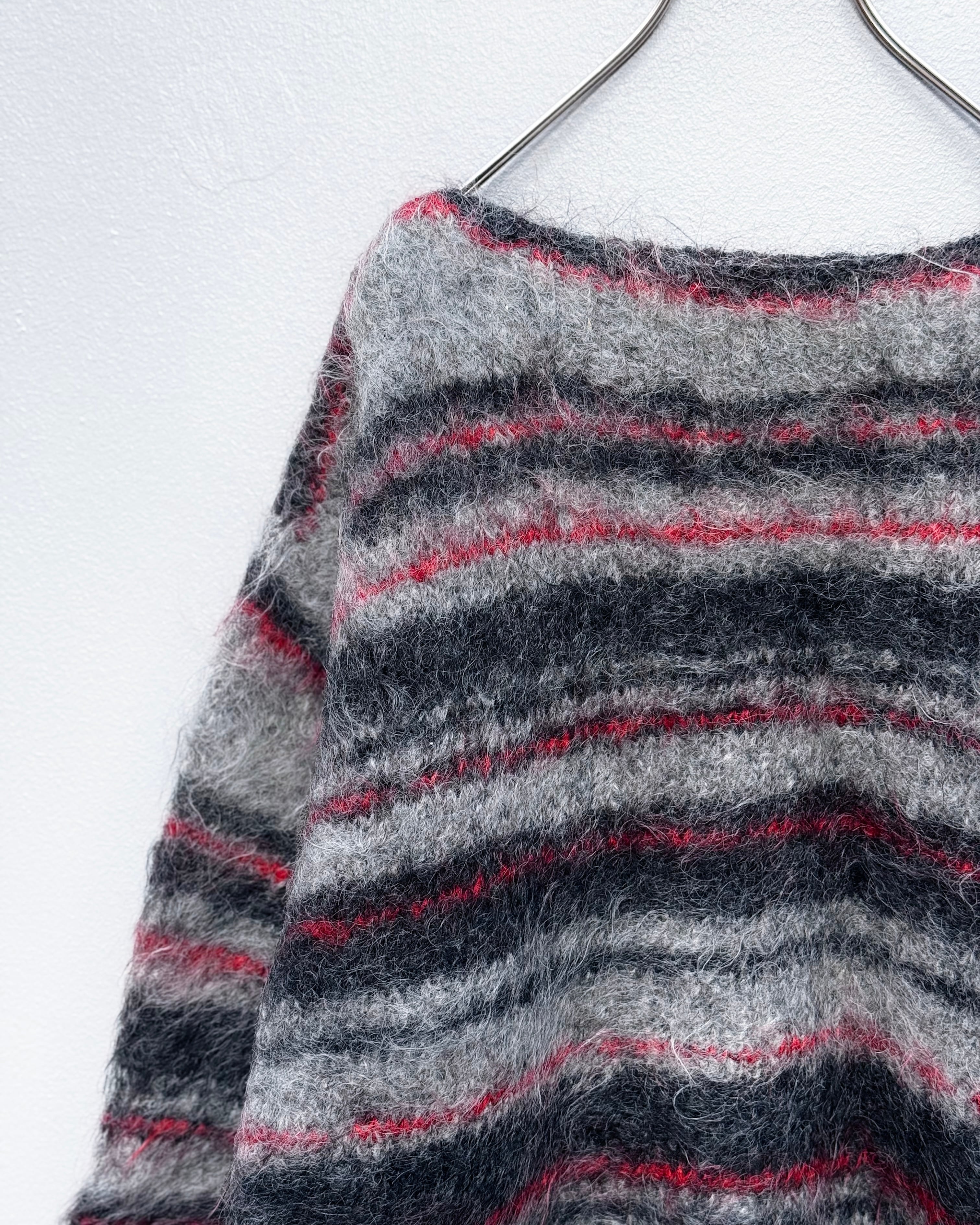 ブラック・レッド・グレーの3トーンで構成された、ハンドメイドのモヘアニット。
