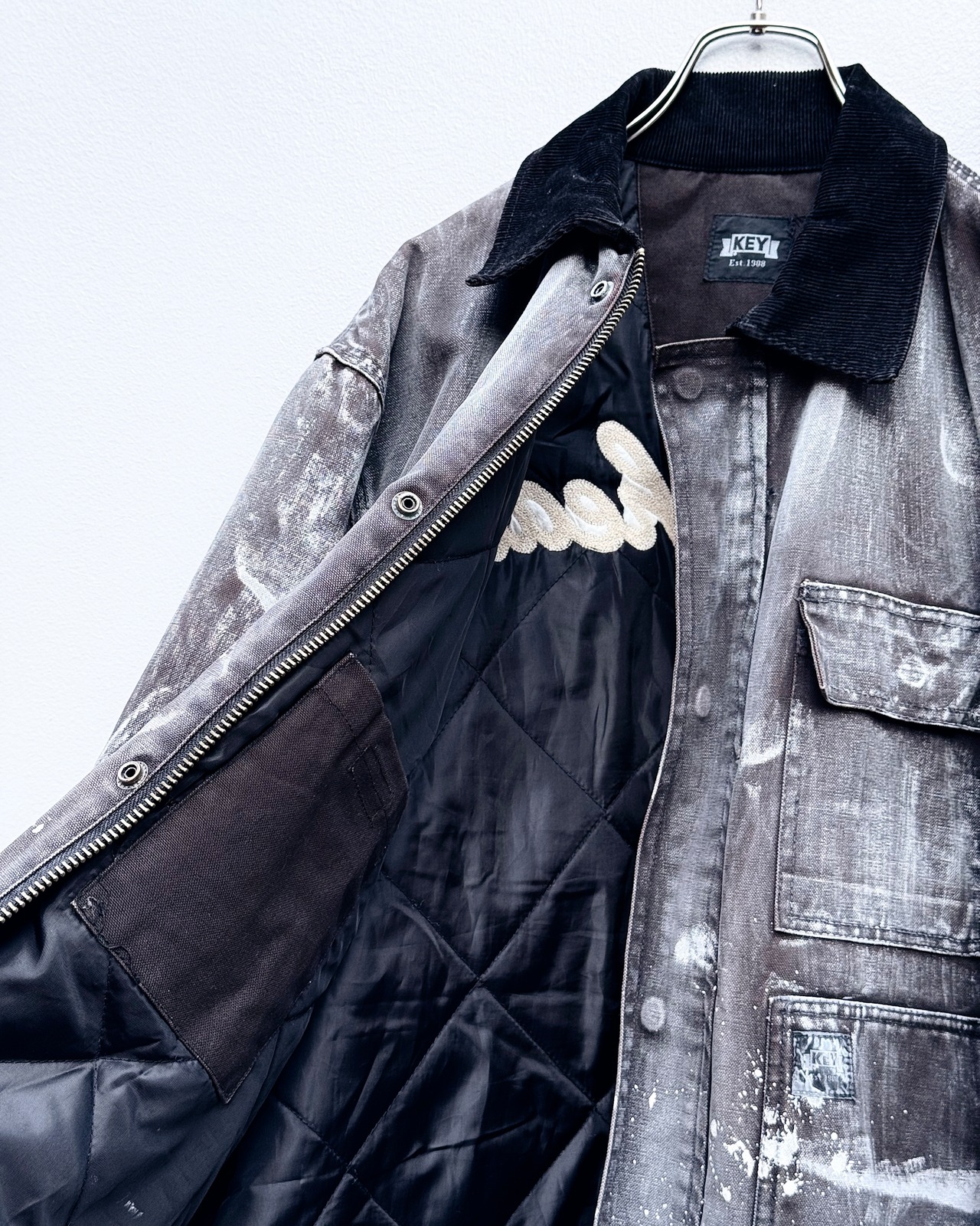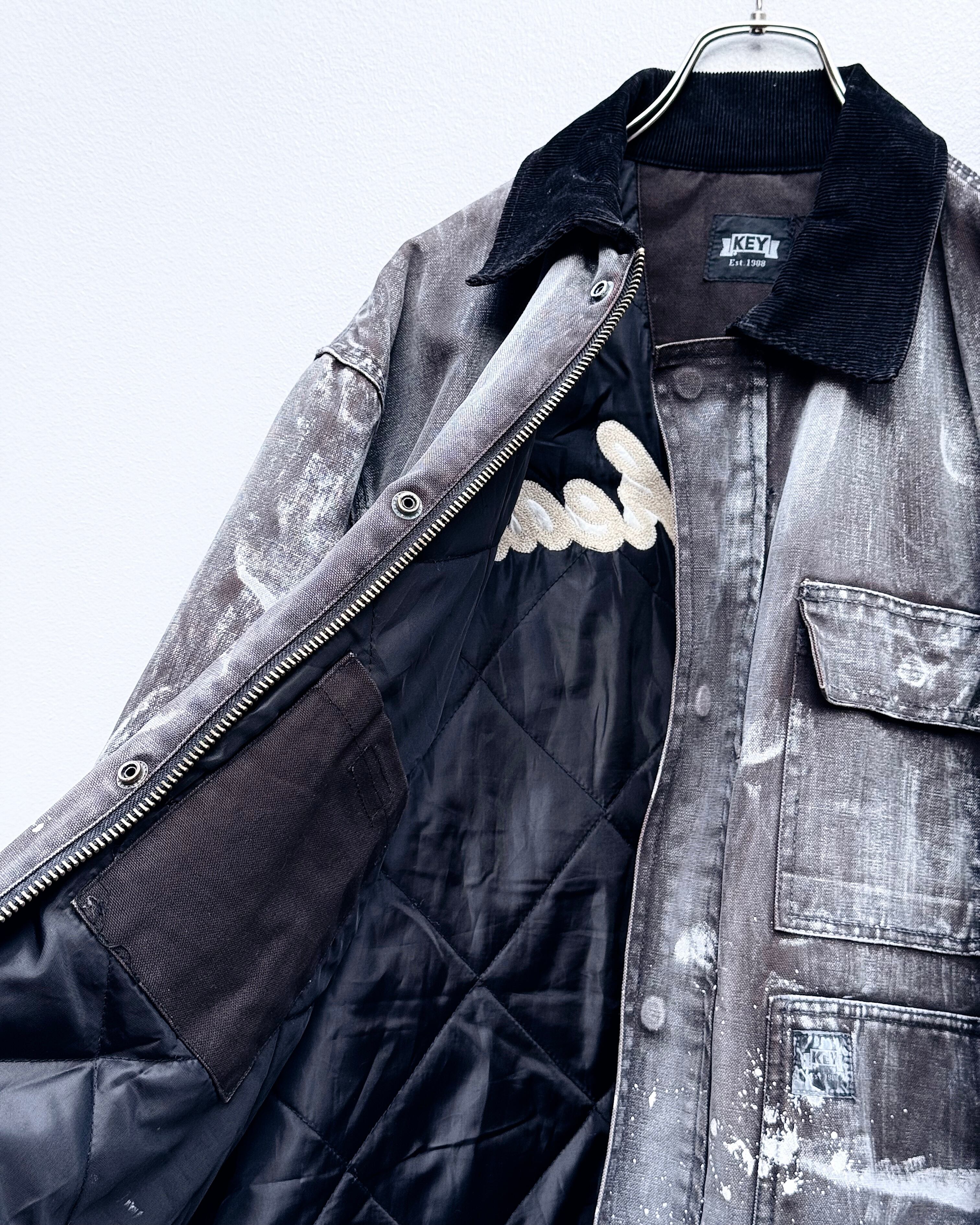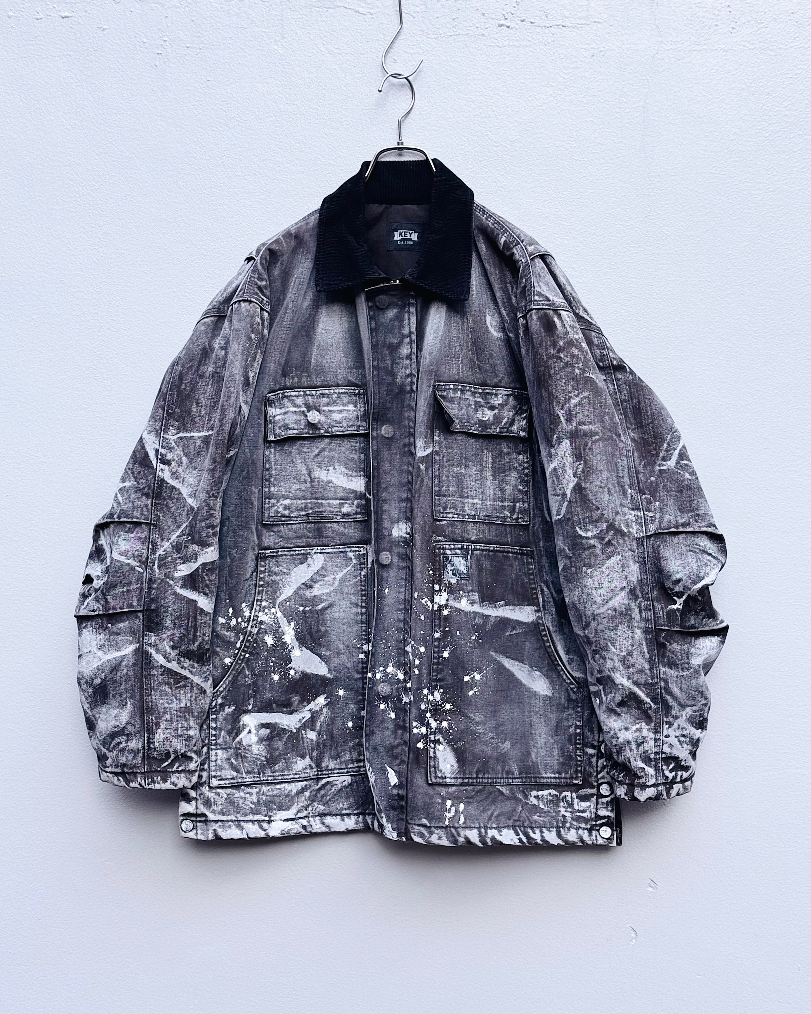 ベースはダック地のワークジャケットですが、全面に施されたペイント加工が強烈なノイズとして作用し、無骨さとアート性がせめぎ合う仕上がり。