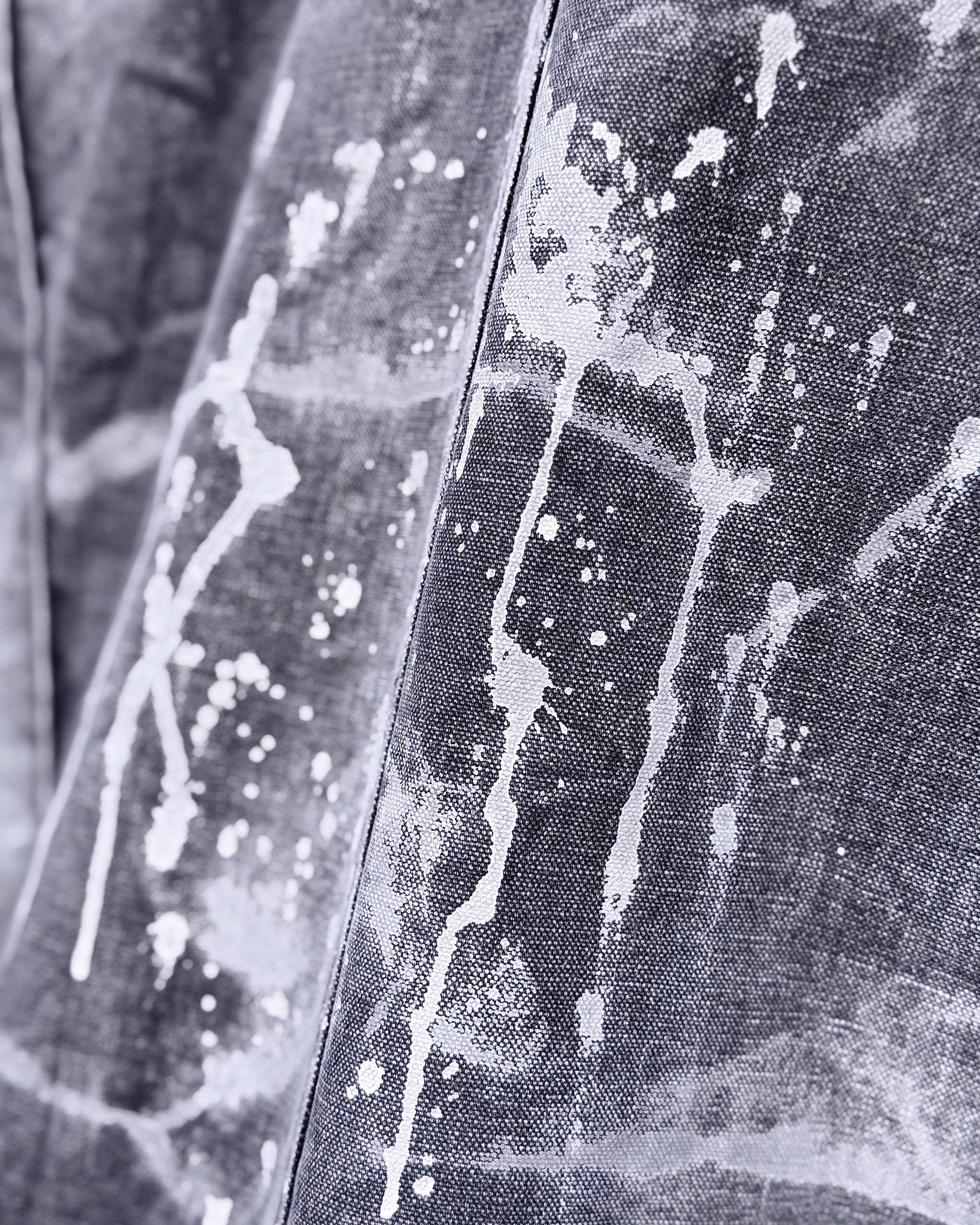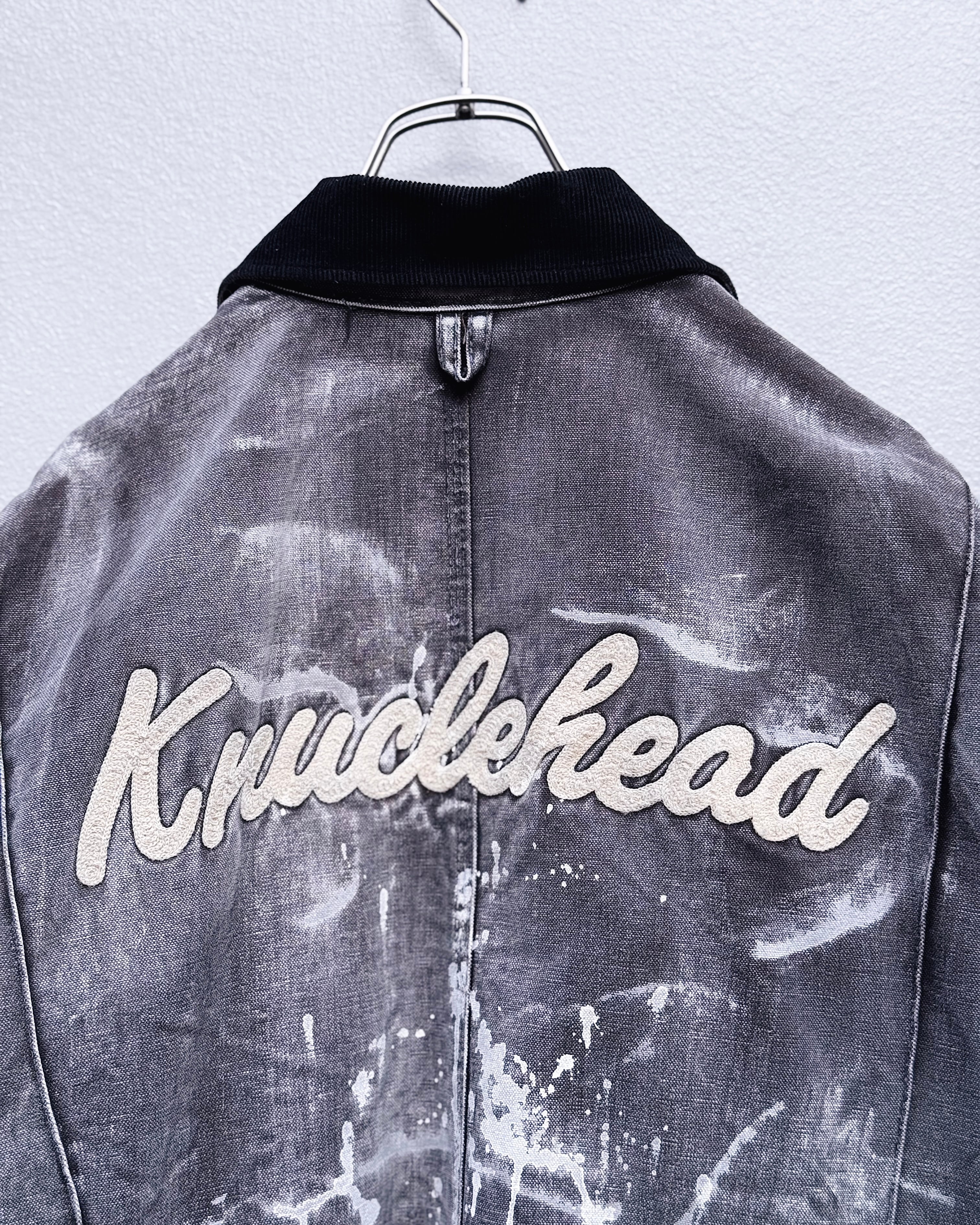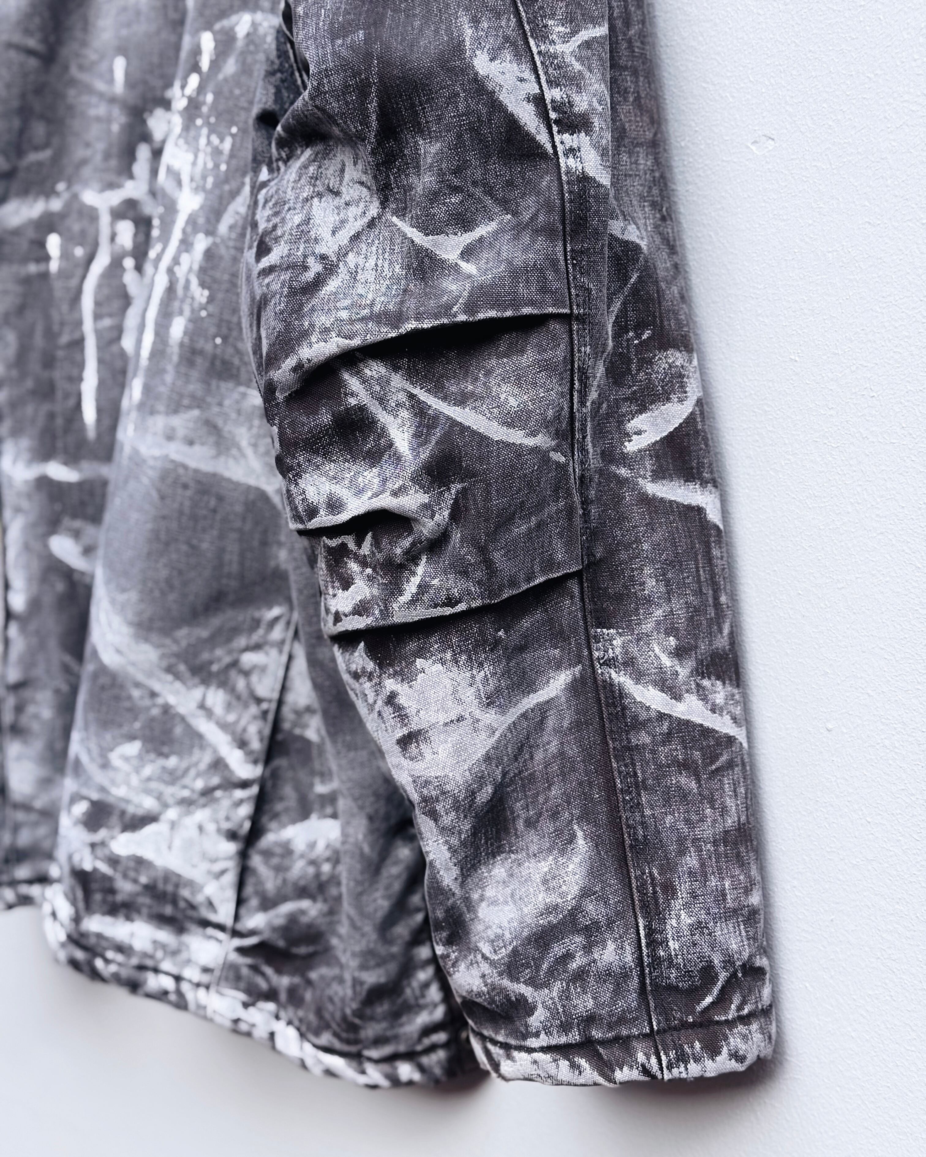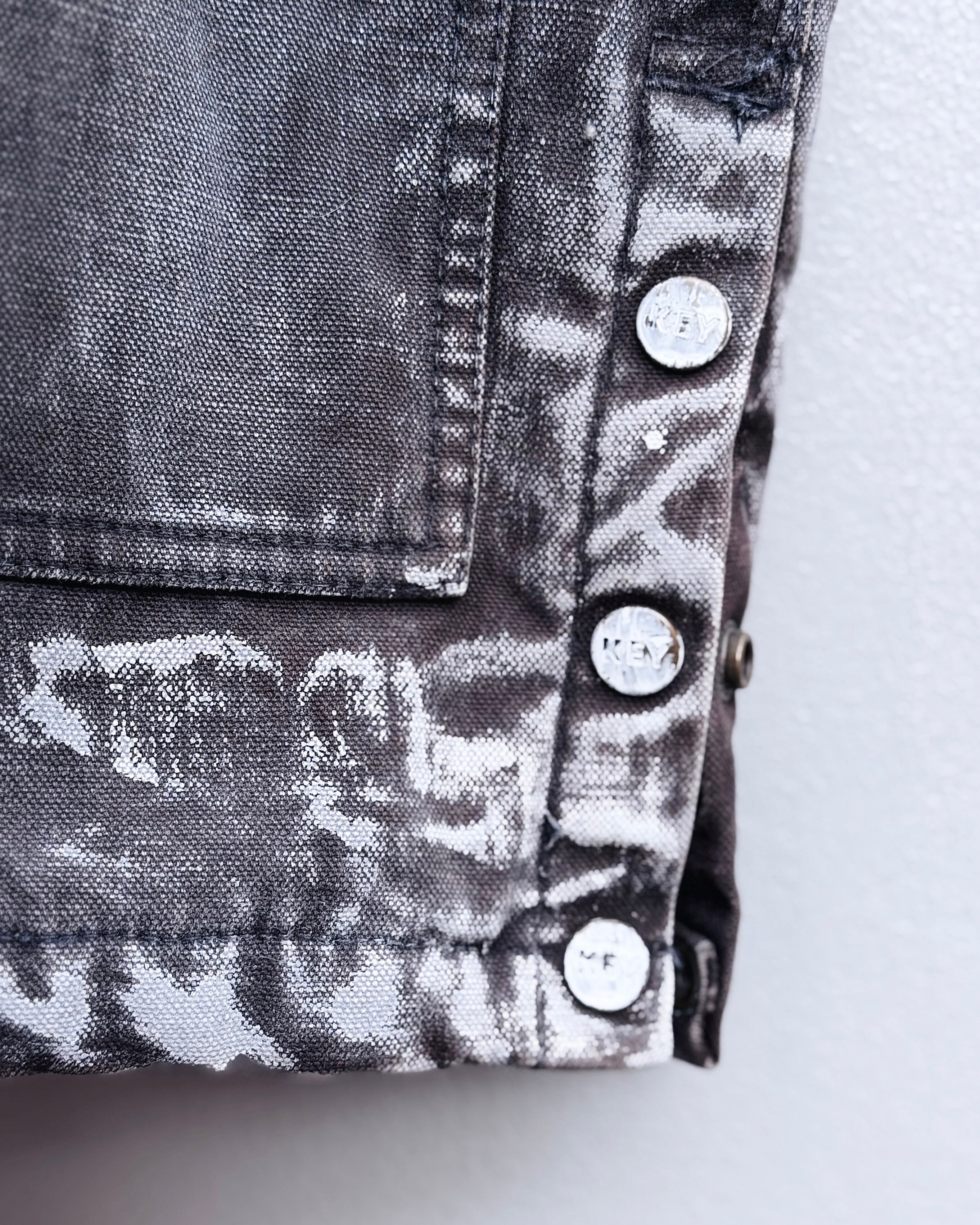 ベースはダック地のワークジャケットですが、全面に施されたペイント加工が強烈なノイズとして作用し、無骨さとアート性がせめぎ合う仕上がり。