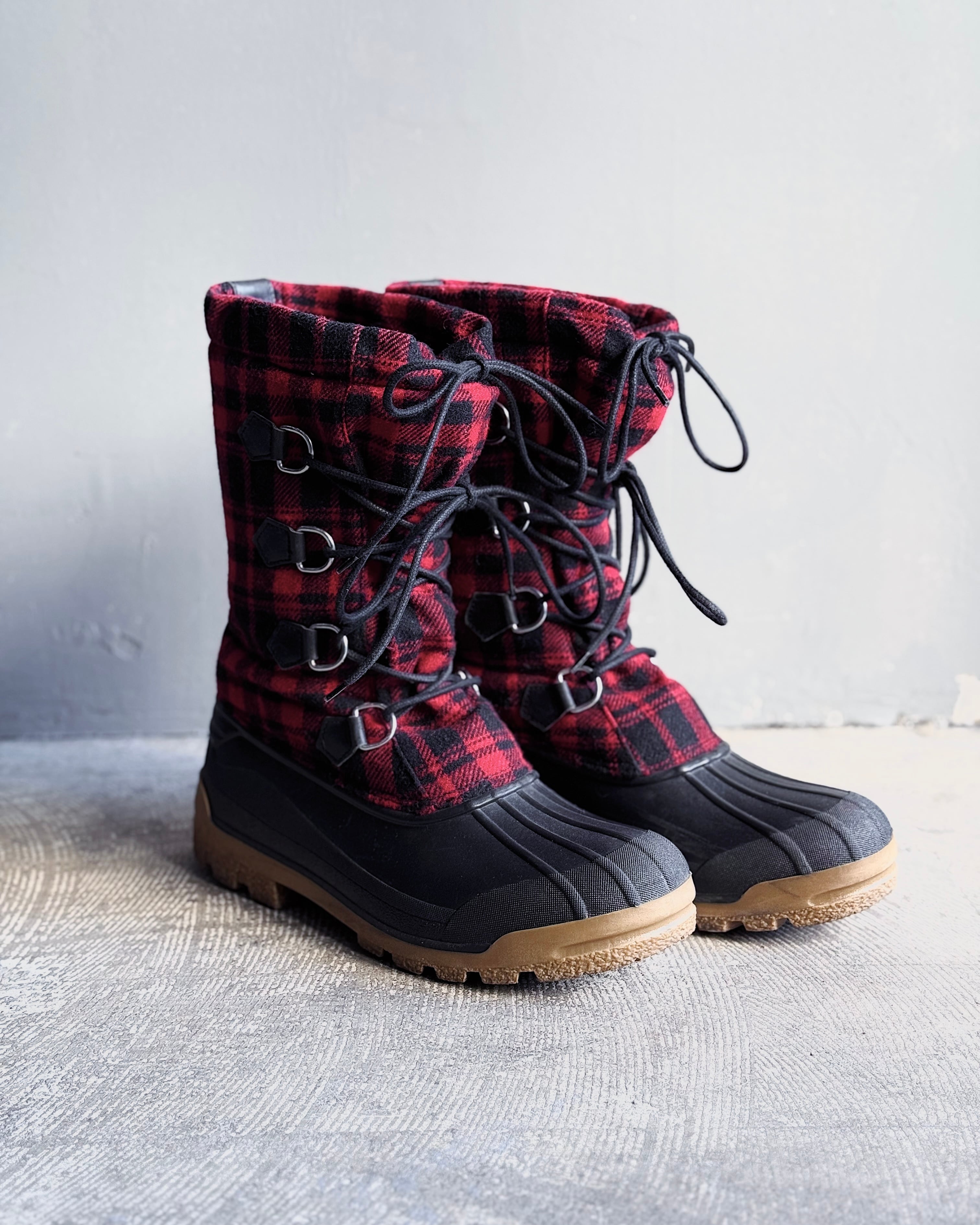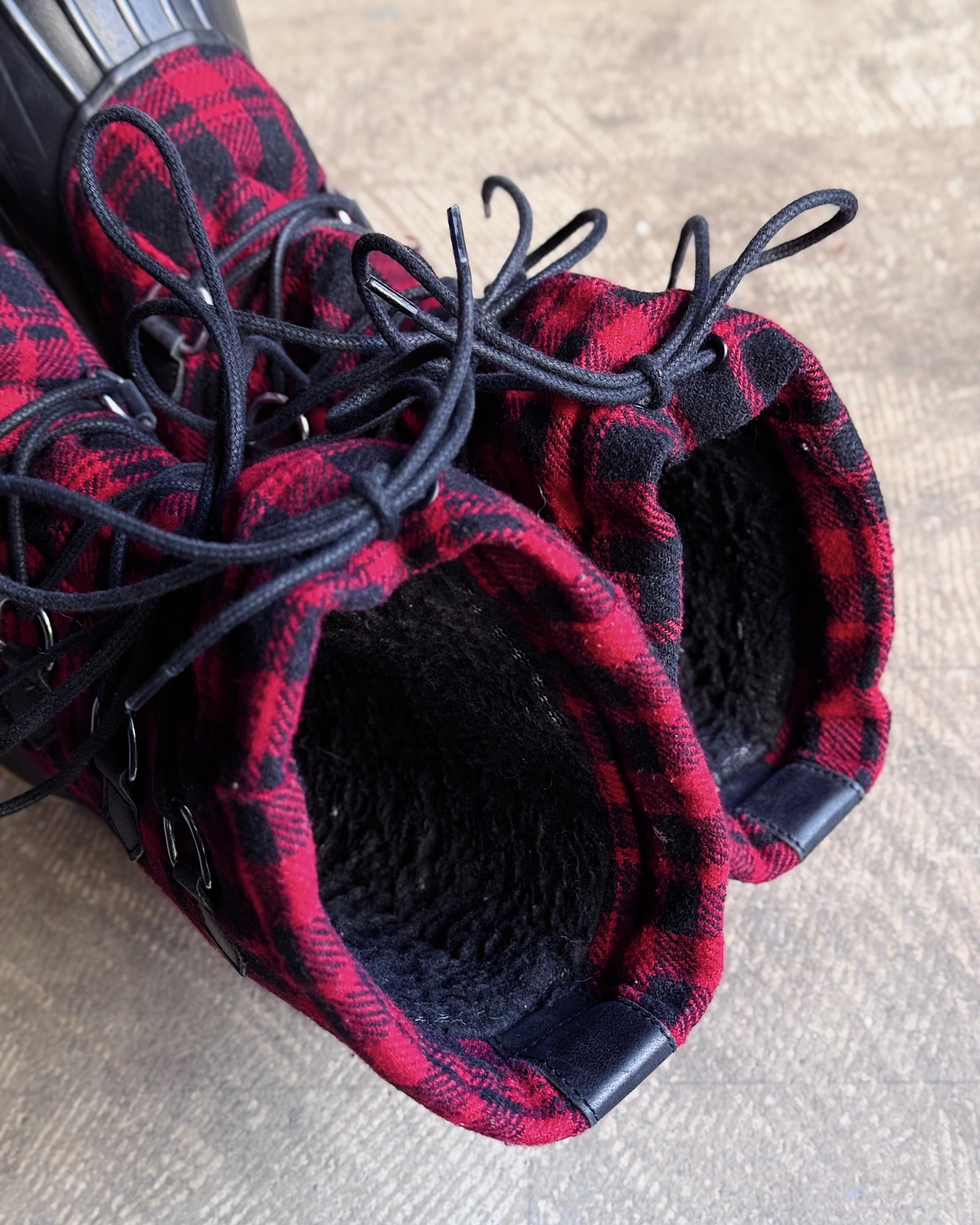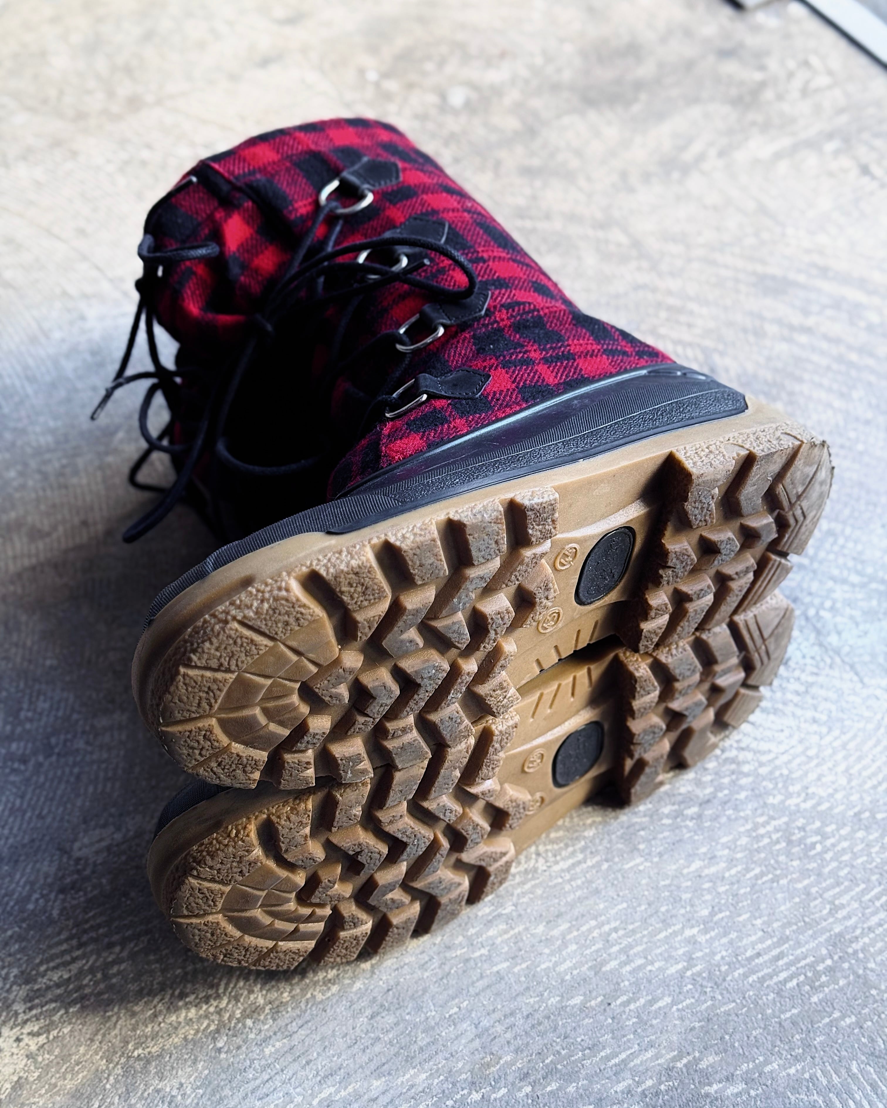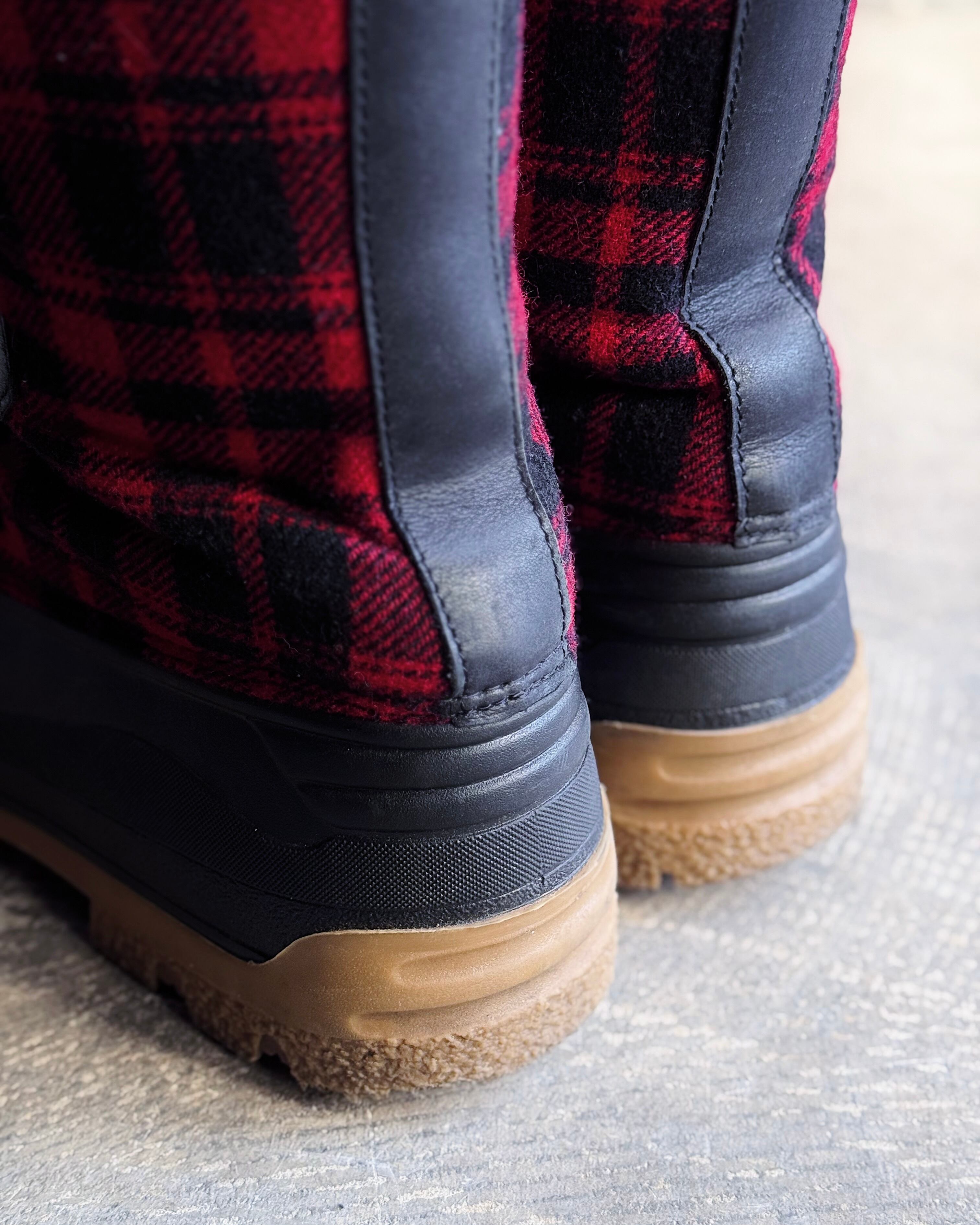 クラシックなダックブーツ構造をベースに、アッパーには赤×黒のチェックウールを組み合わせた一足。
