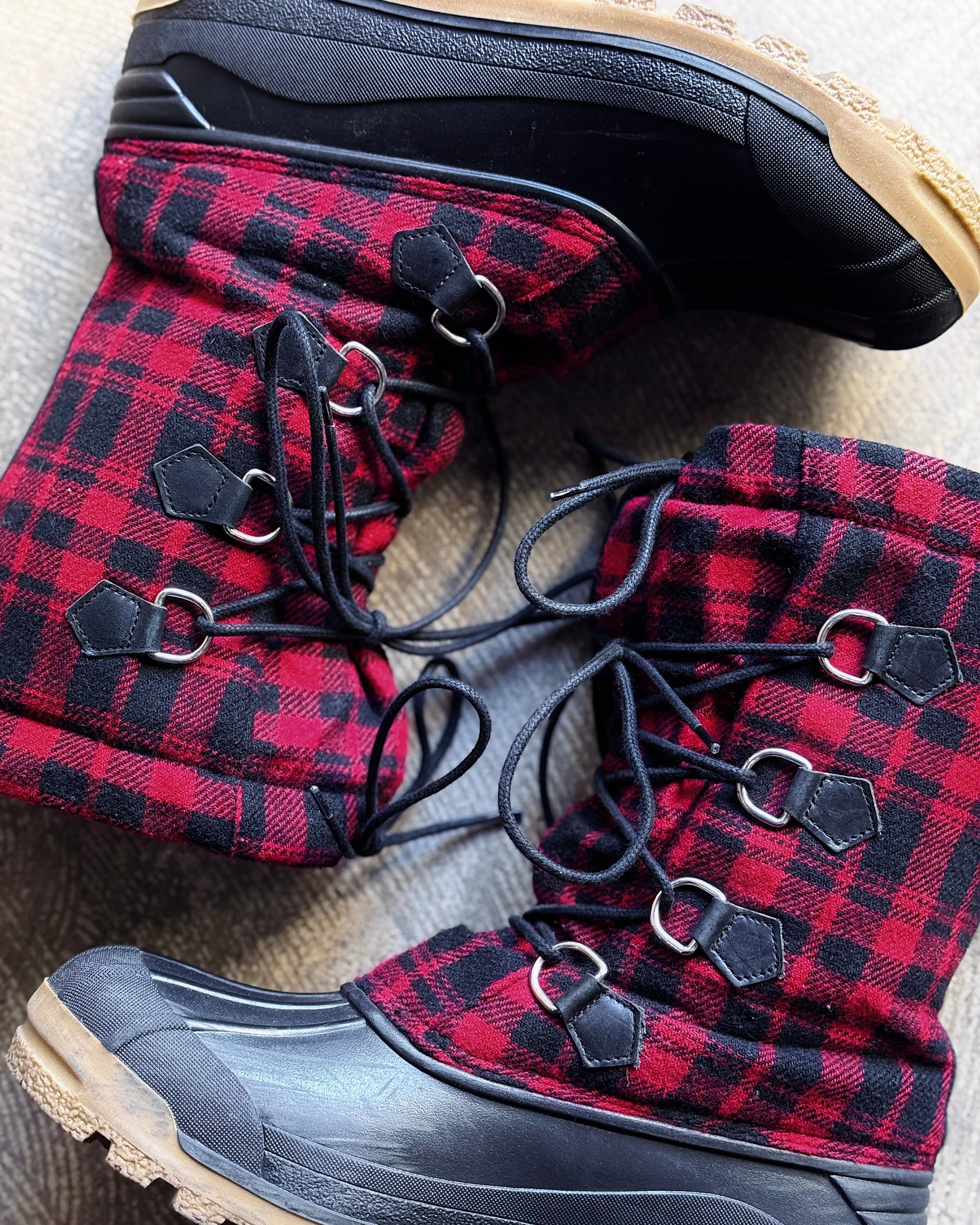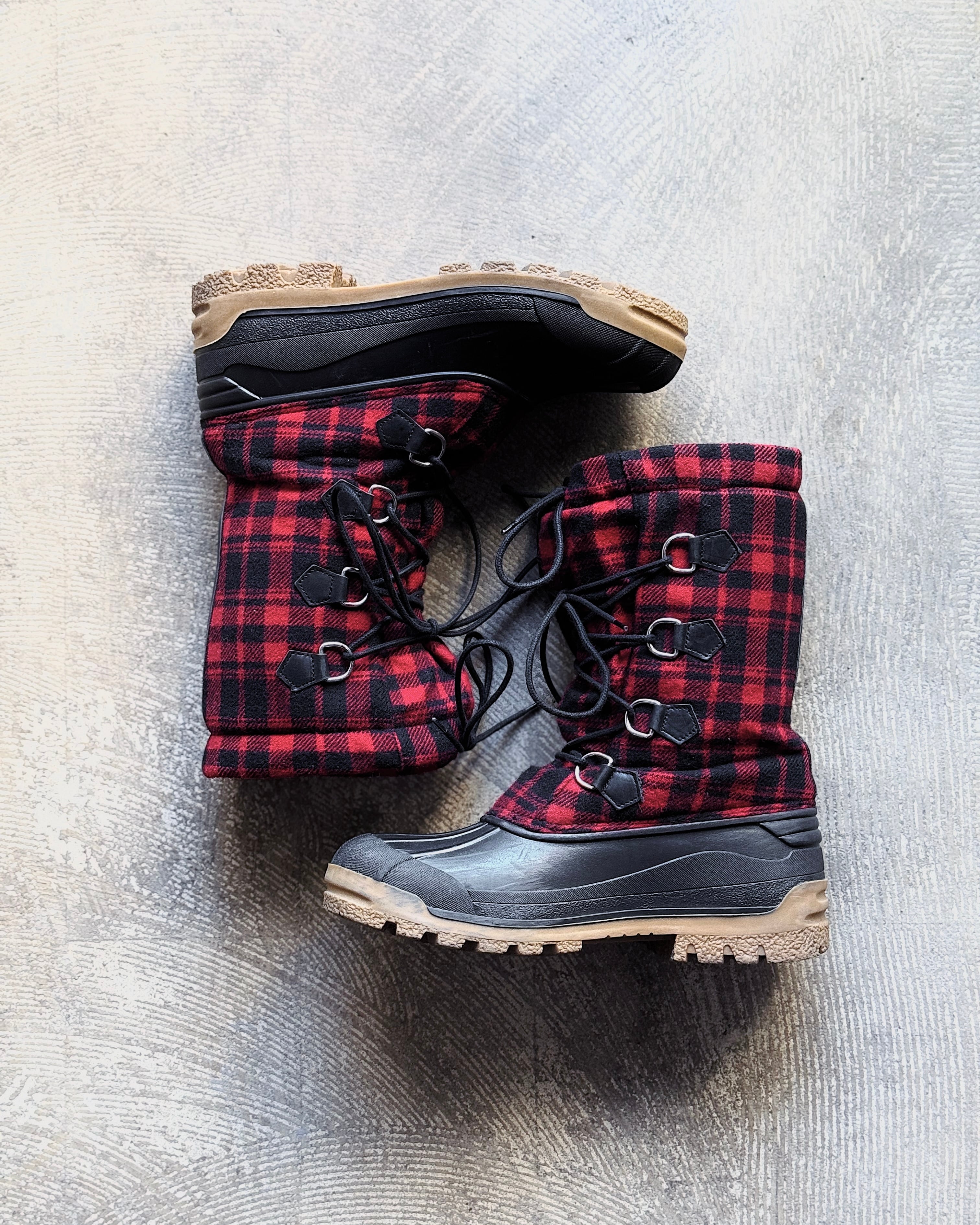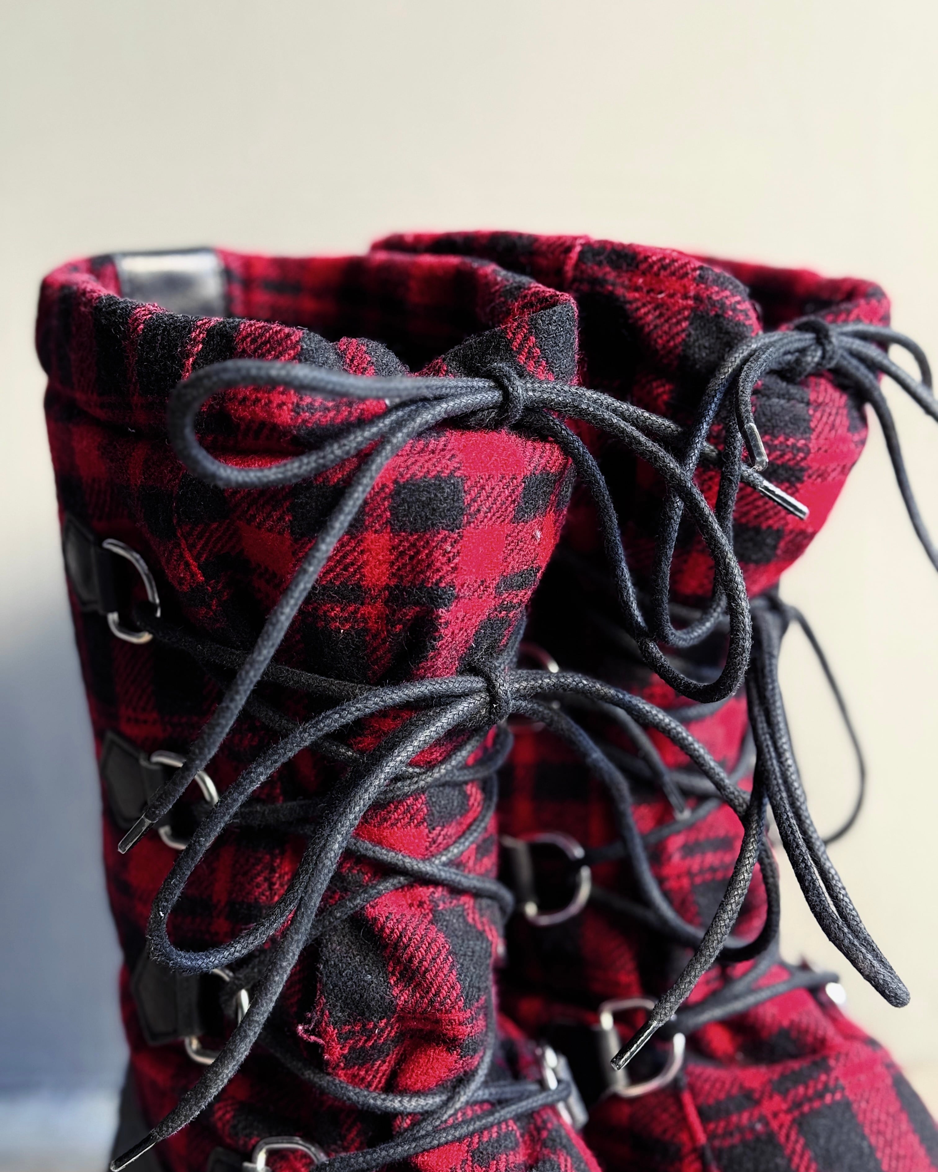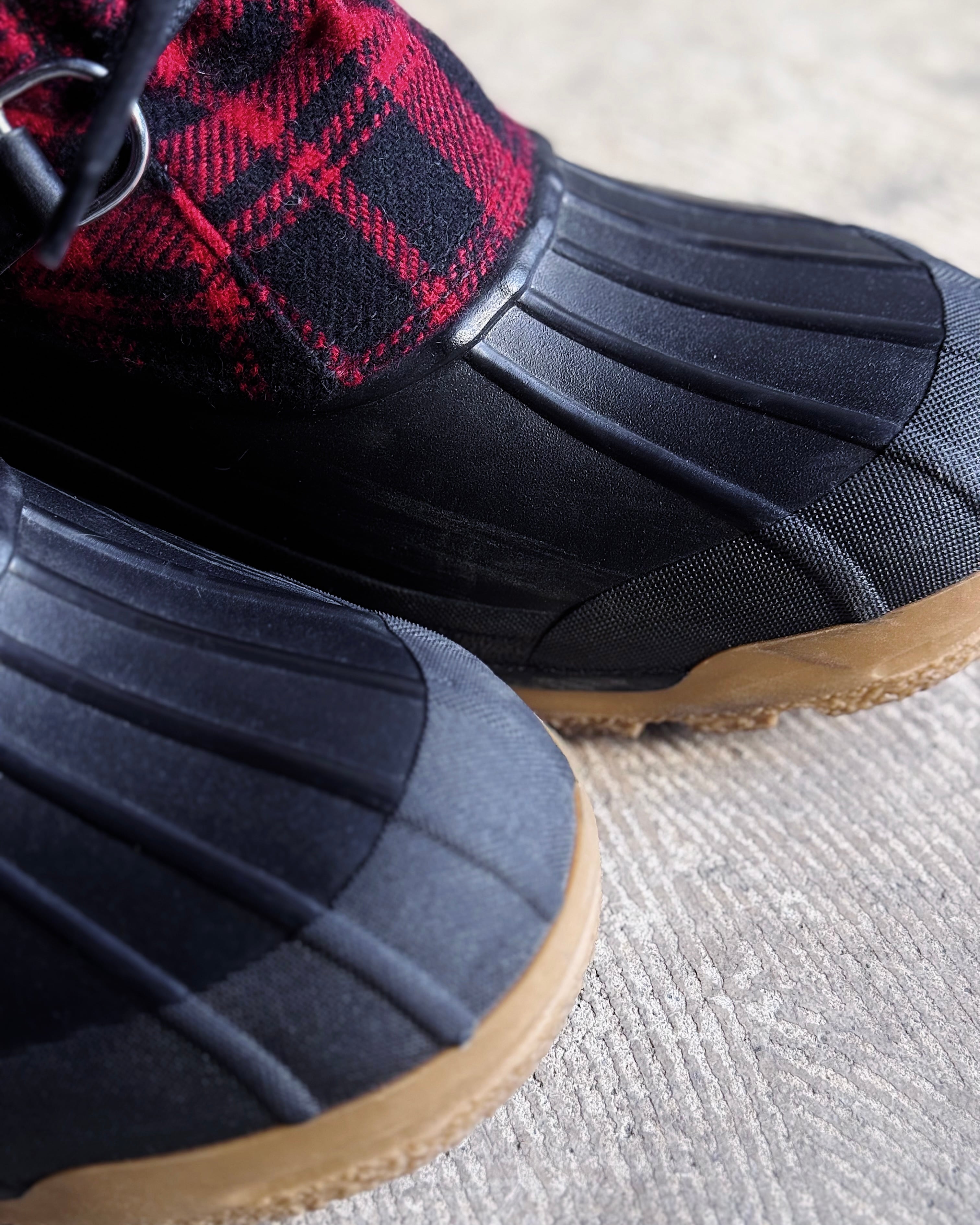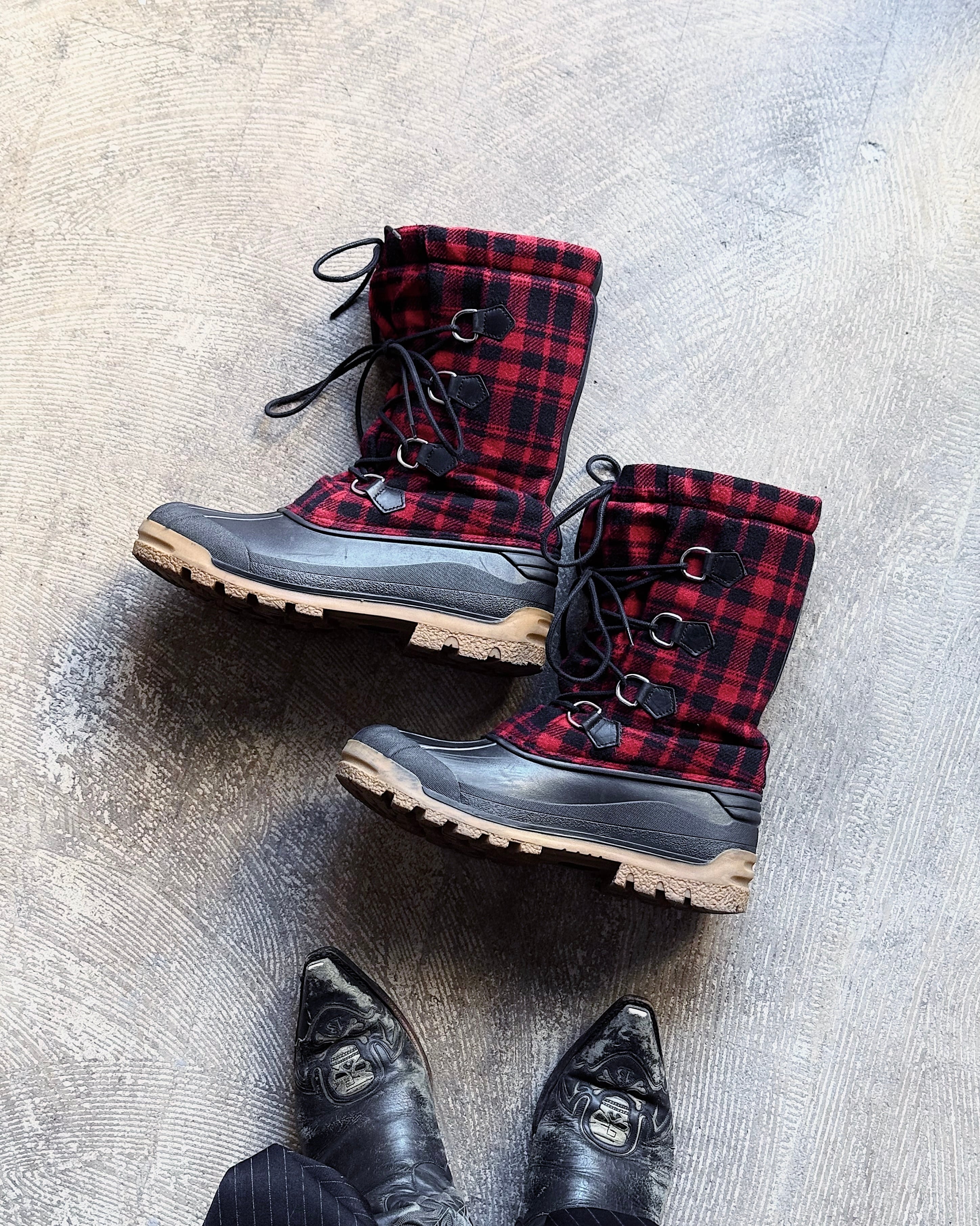 クラシックなダックブーツ構造をベースに、アッパーには赤×黒のチェックウールを組み合わせた一足。