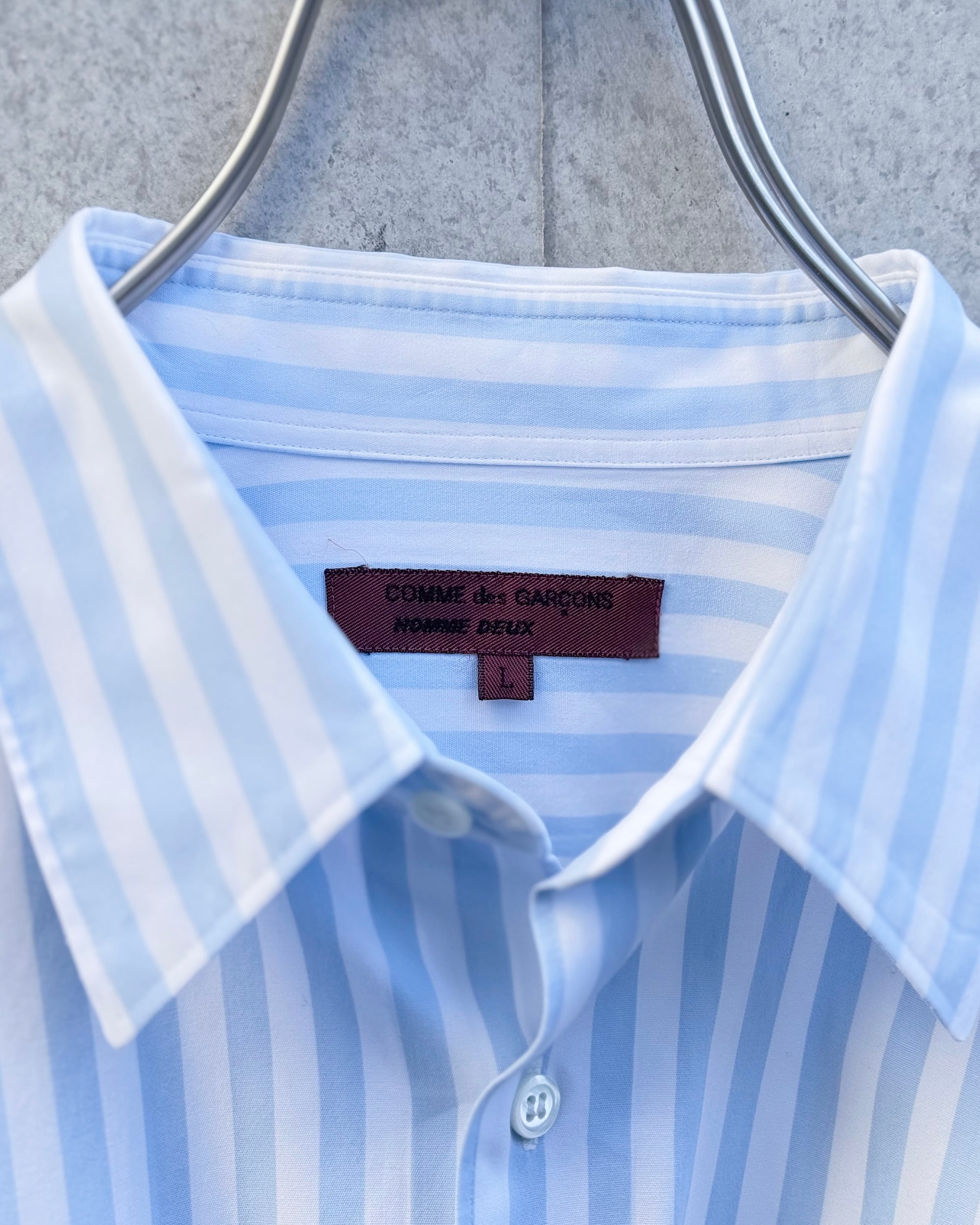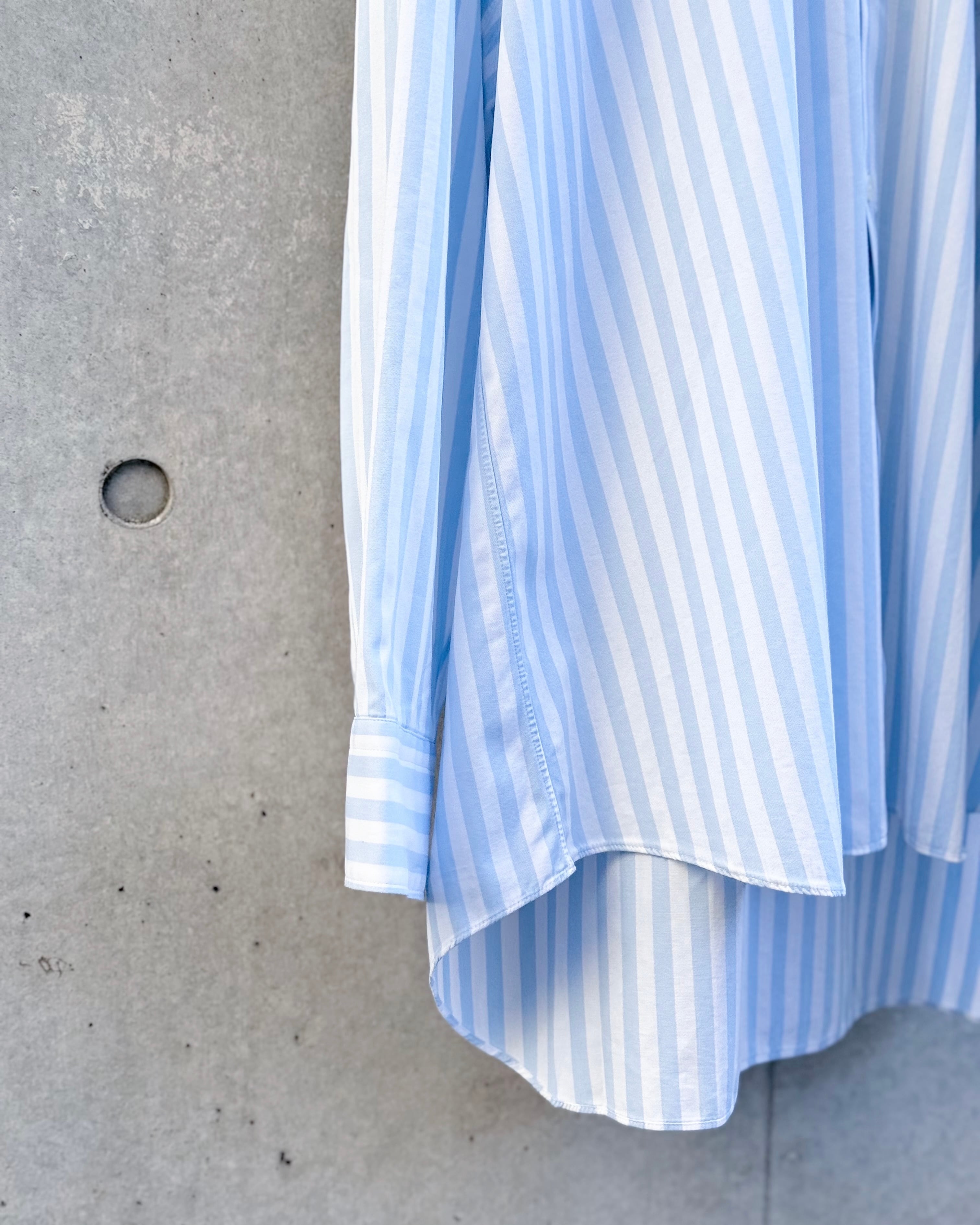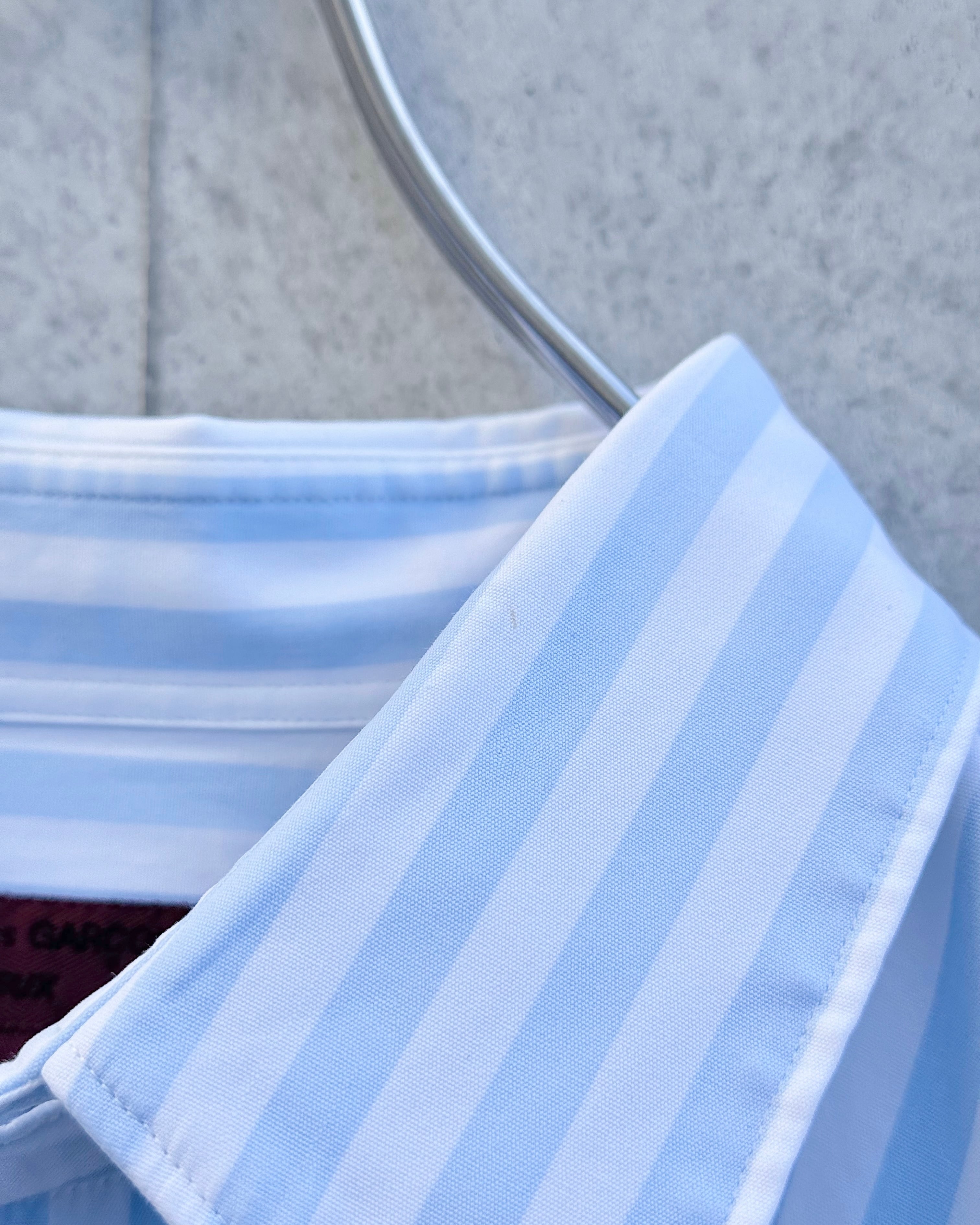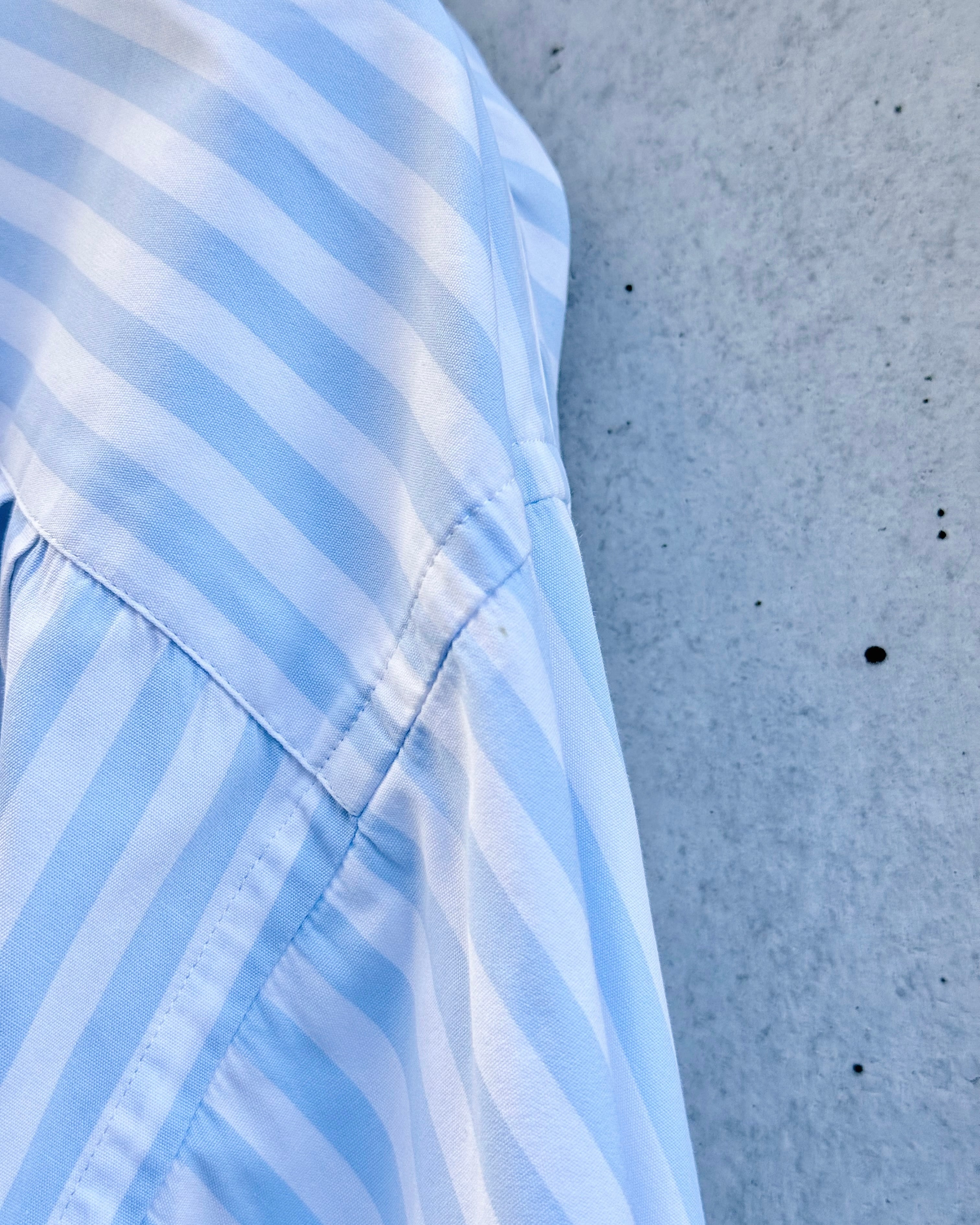 淡いブルートーンで構成され、主張は控えめながらスタイリングに静かなリズムを与える一着。