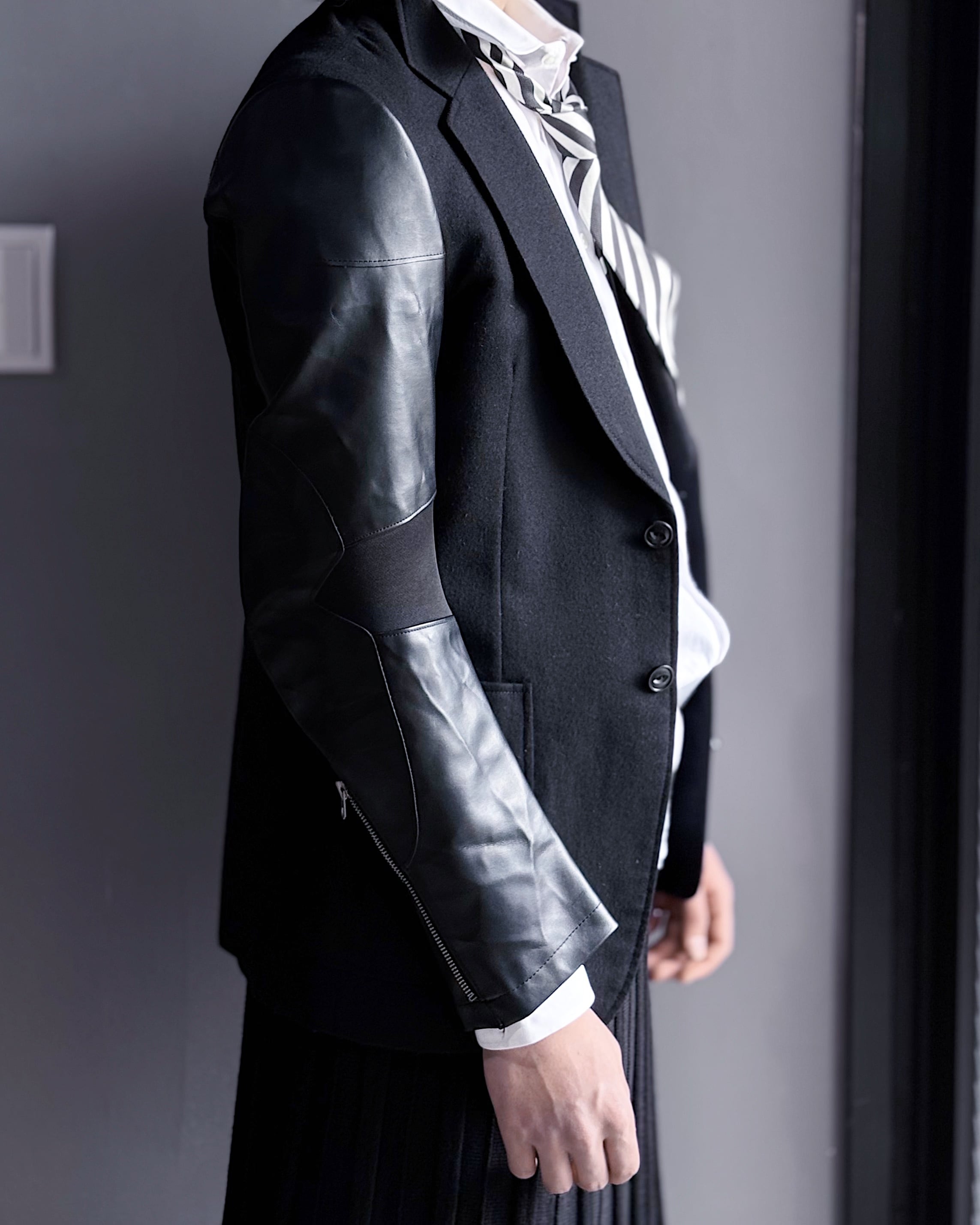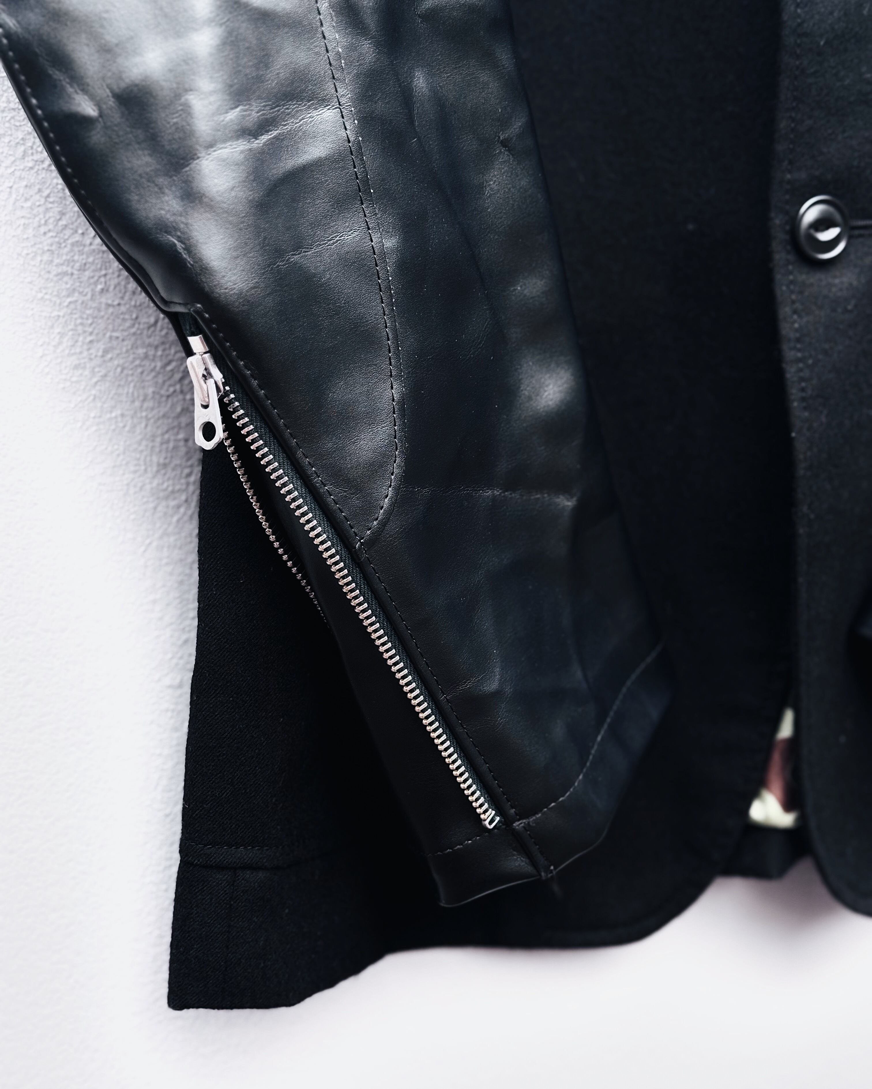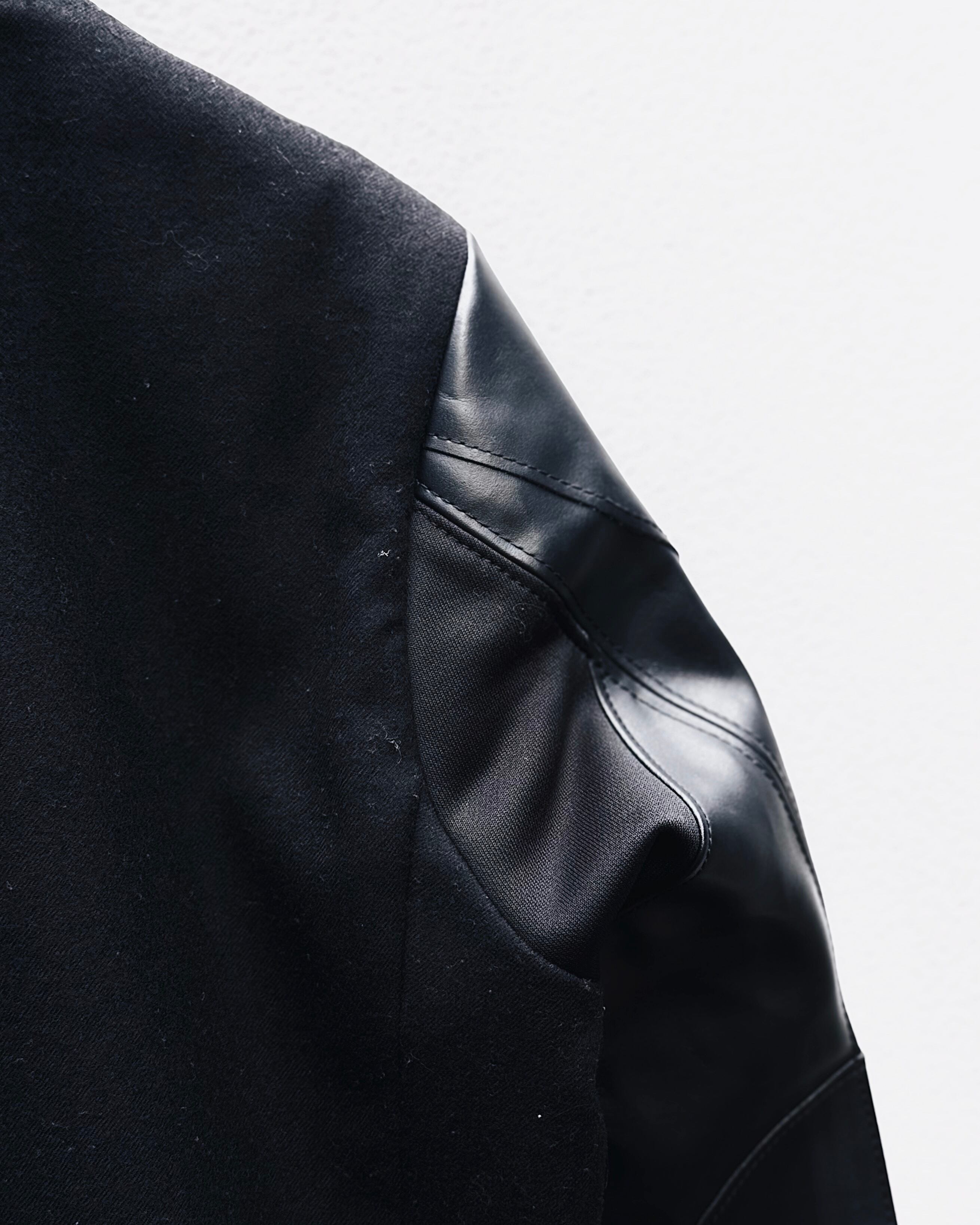 ボディには柔らかなウール地、袖には立体的に切り替えられたレザーパネルを配し、肘や可動域に沿ったパターンワークによって自然な曲線美を形成。