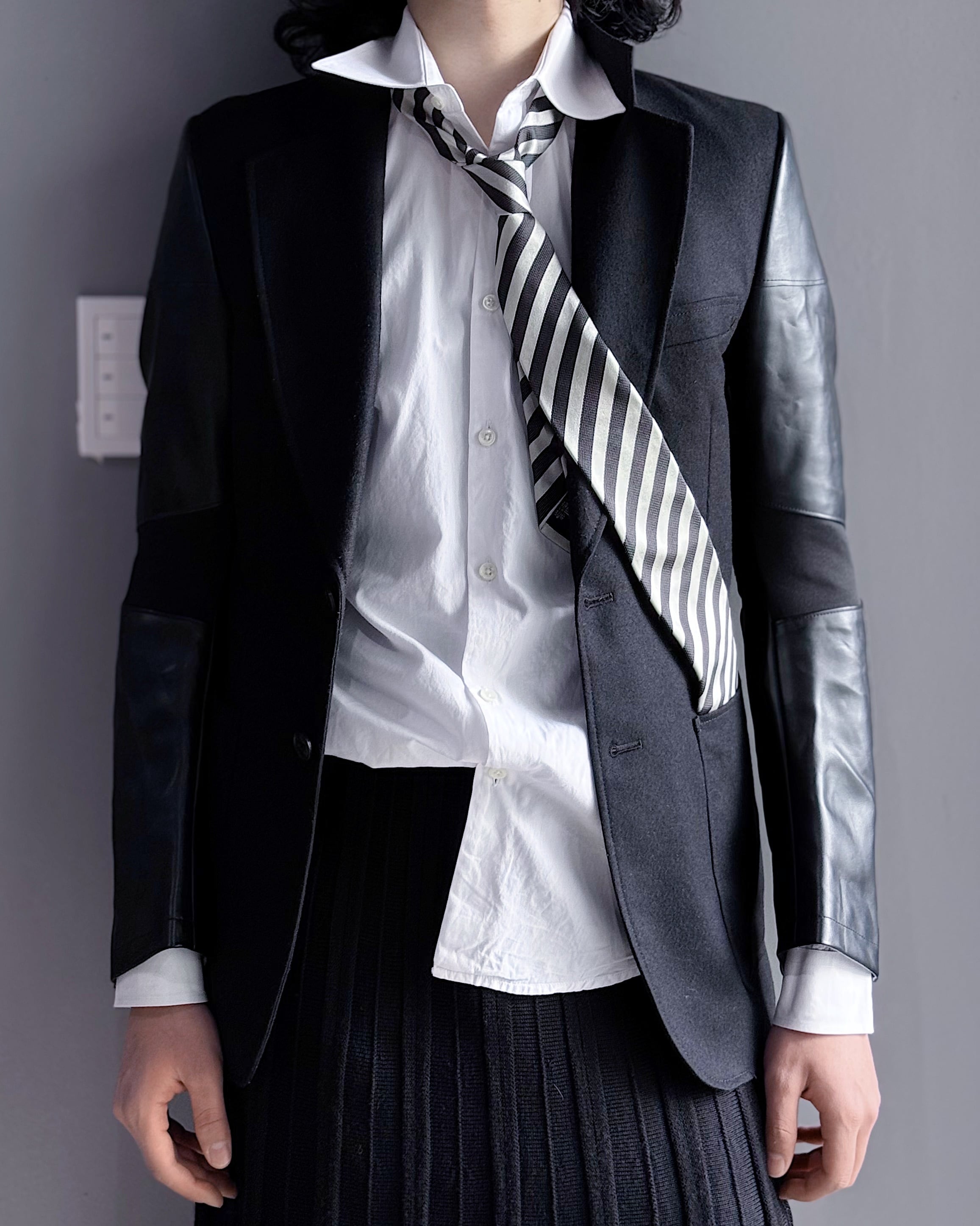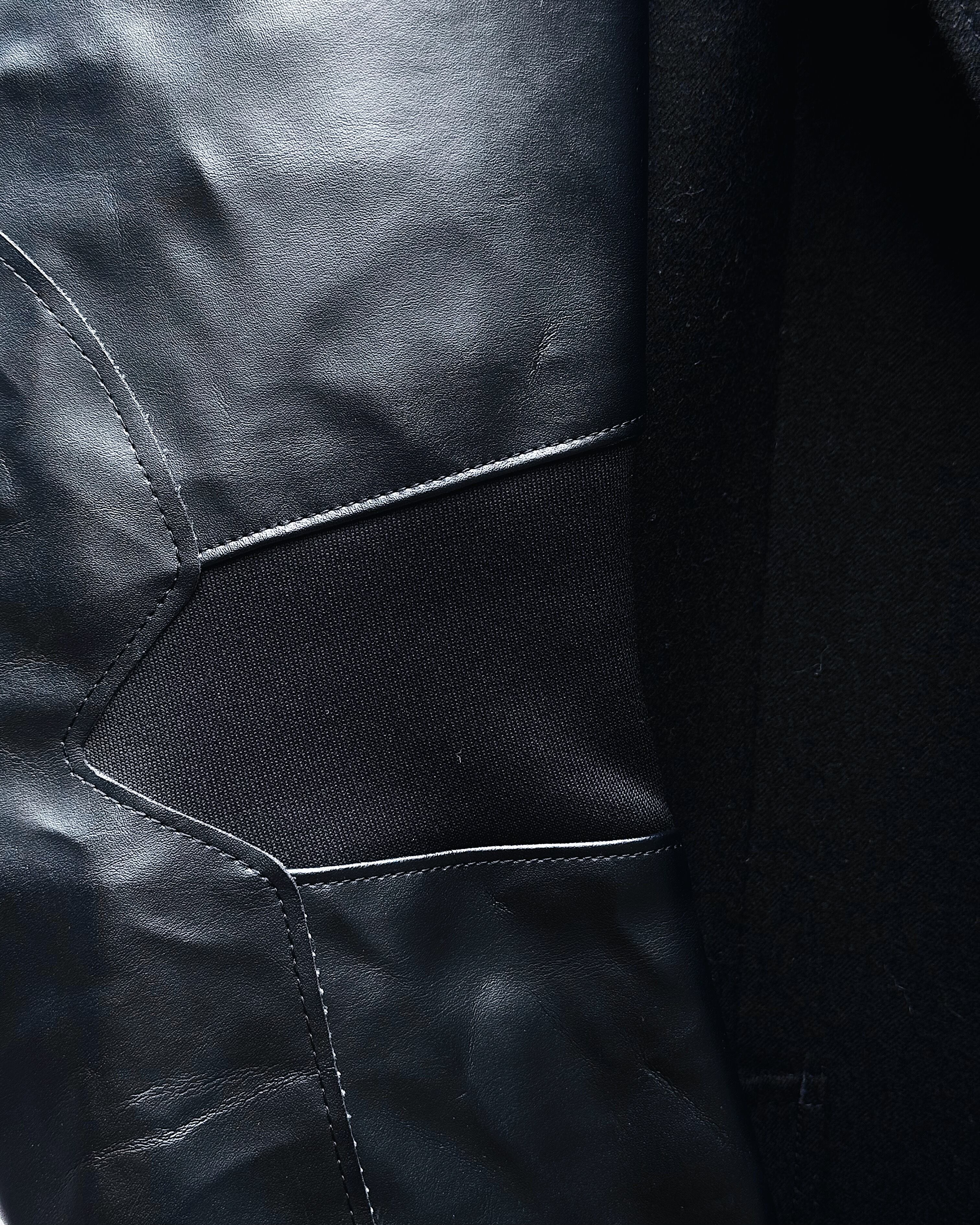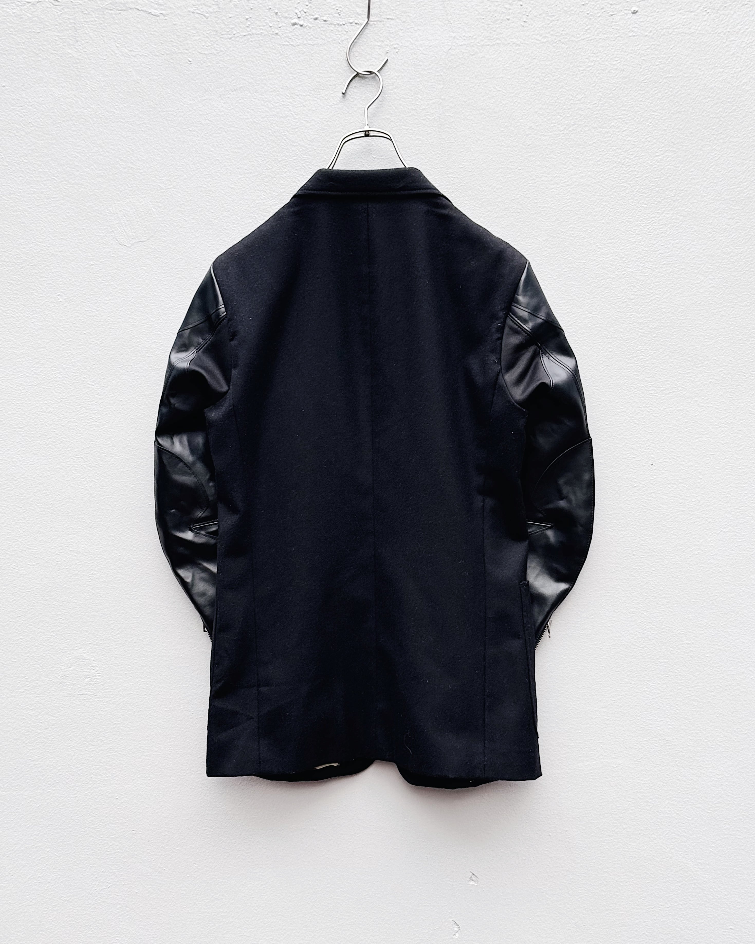 ボディには柔らかなウール地、袖には立体的に切り替えられたレザーパネルを配し、肘や可動域に沿ったパターンワークによって自然な曲線美を形成。