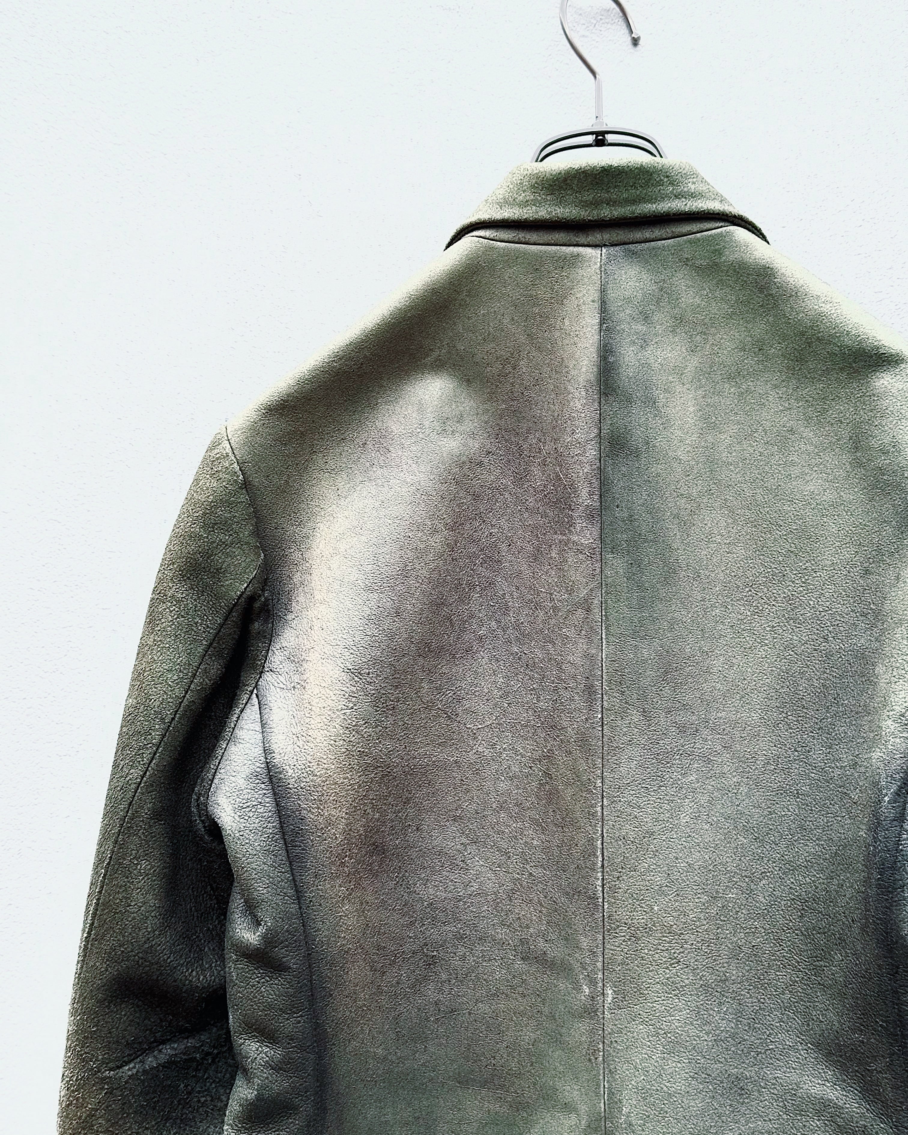 肉厚で荒々しい質感を持つレザーに、長い年月を経たような退廃的エイジングが現れた一着です。