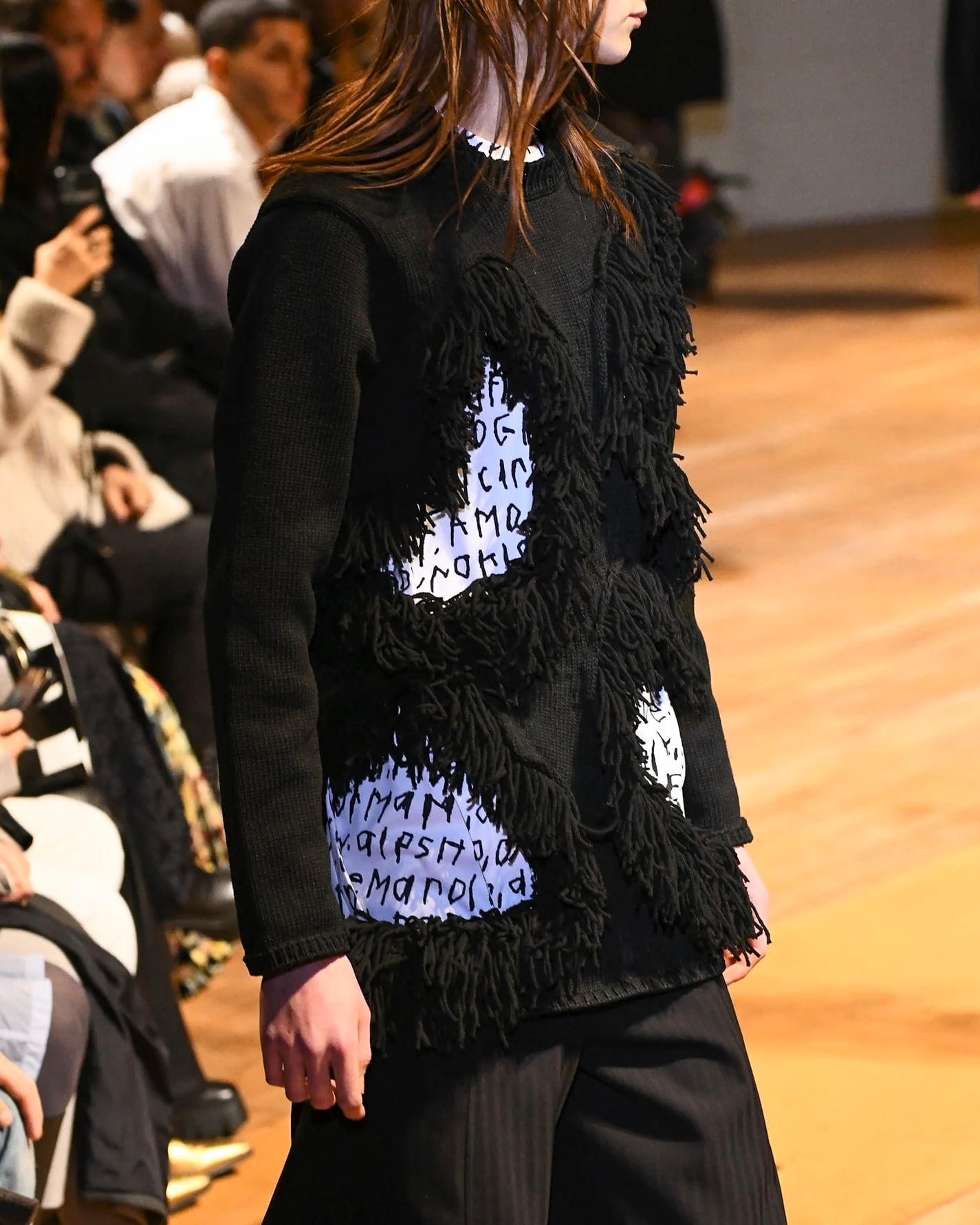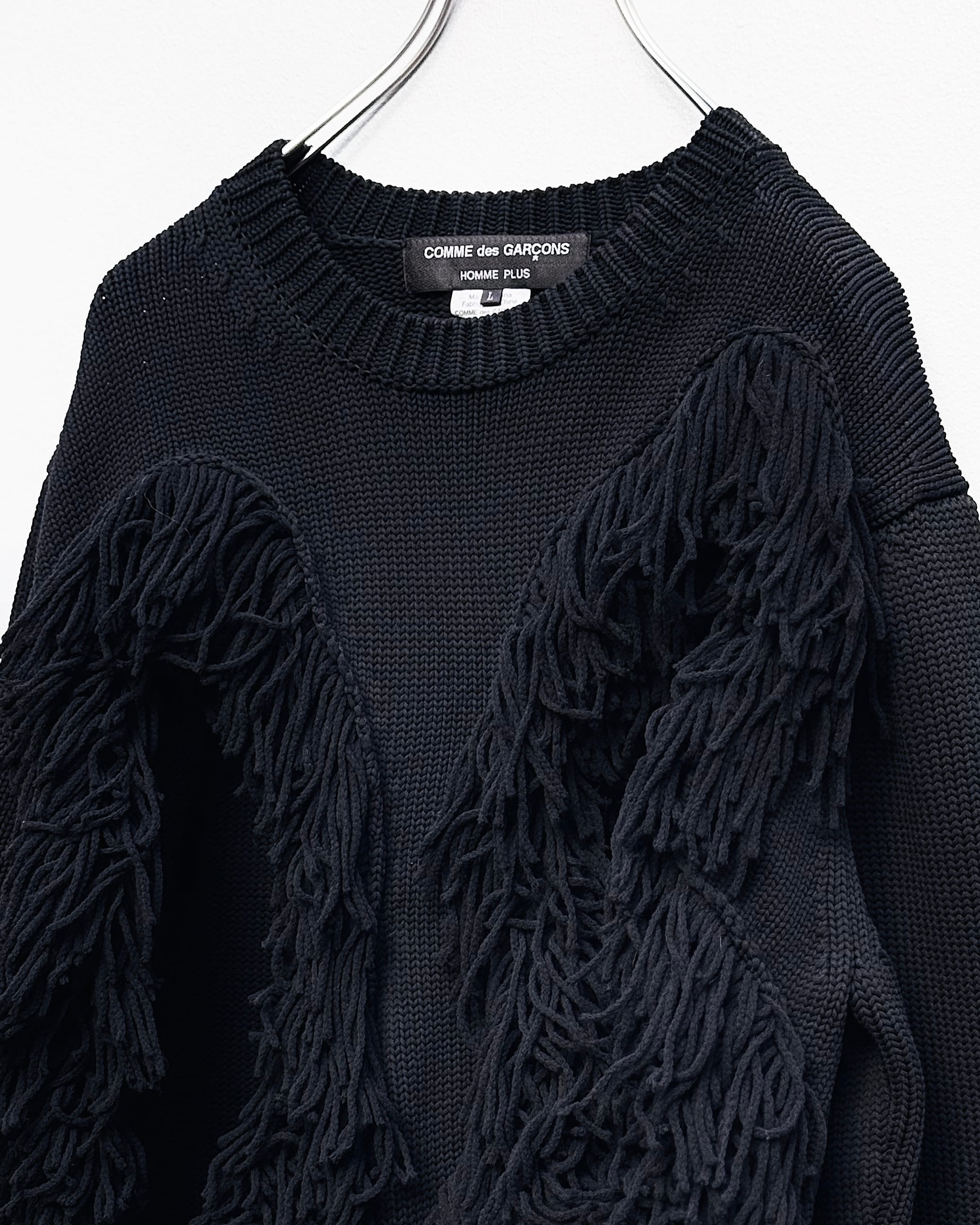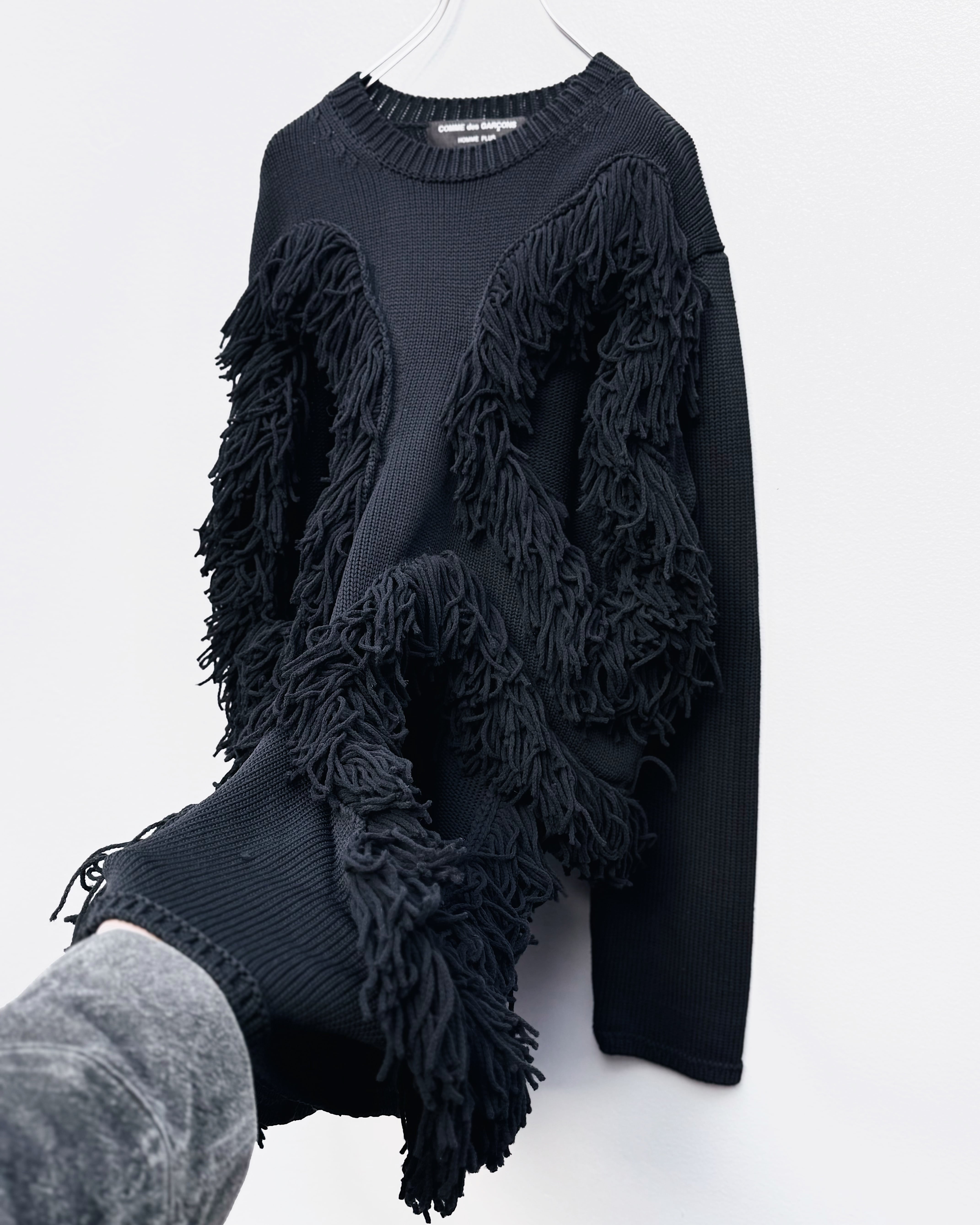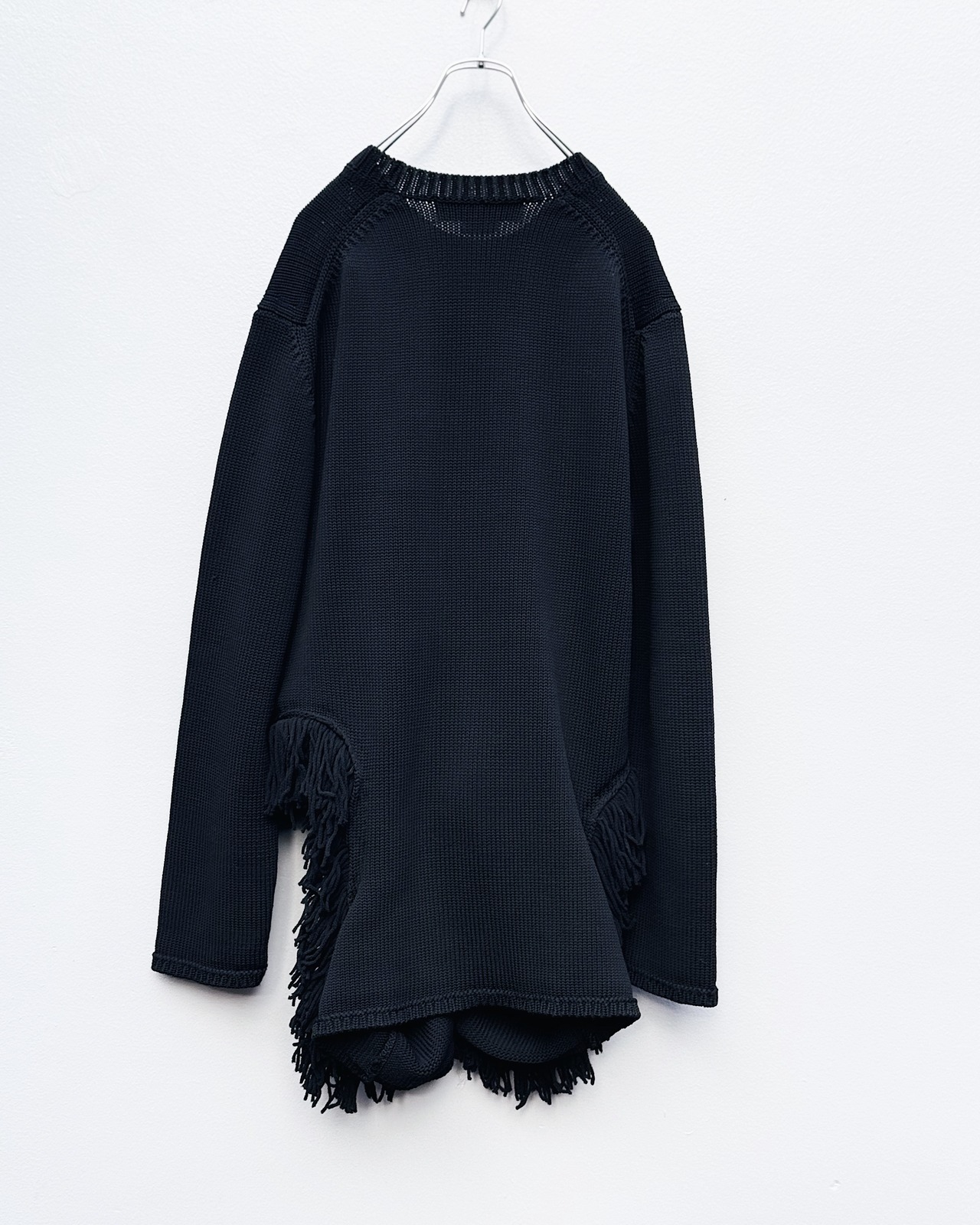 ベースはブラックカラーのベーシックなニットながら、フリンジとホールによって奥行きと抜けを形成。