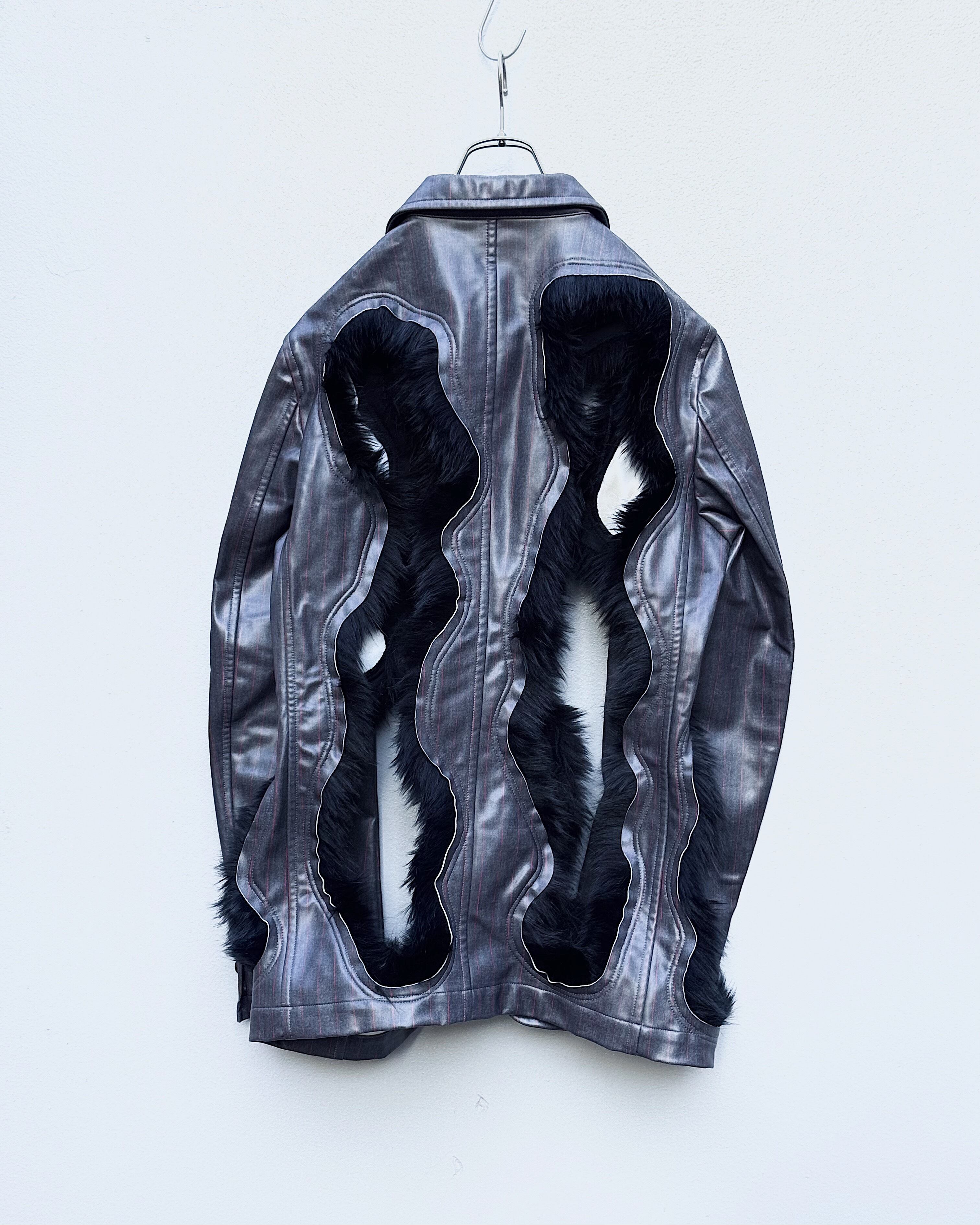 フロントからバックにかけて大胆に切り抜かれた空洞構造に、毛足のあるファーをレイヤー。