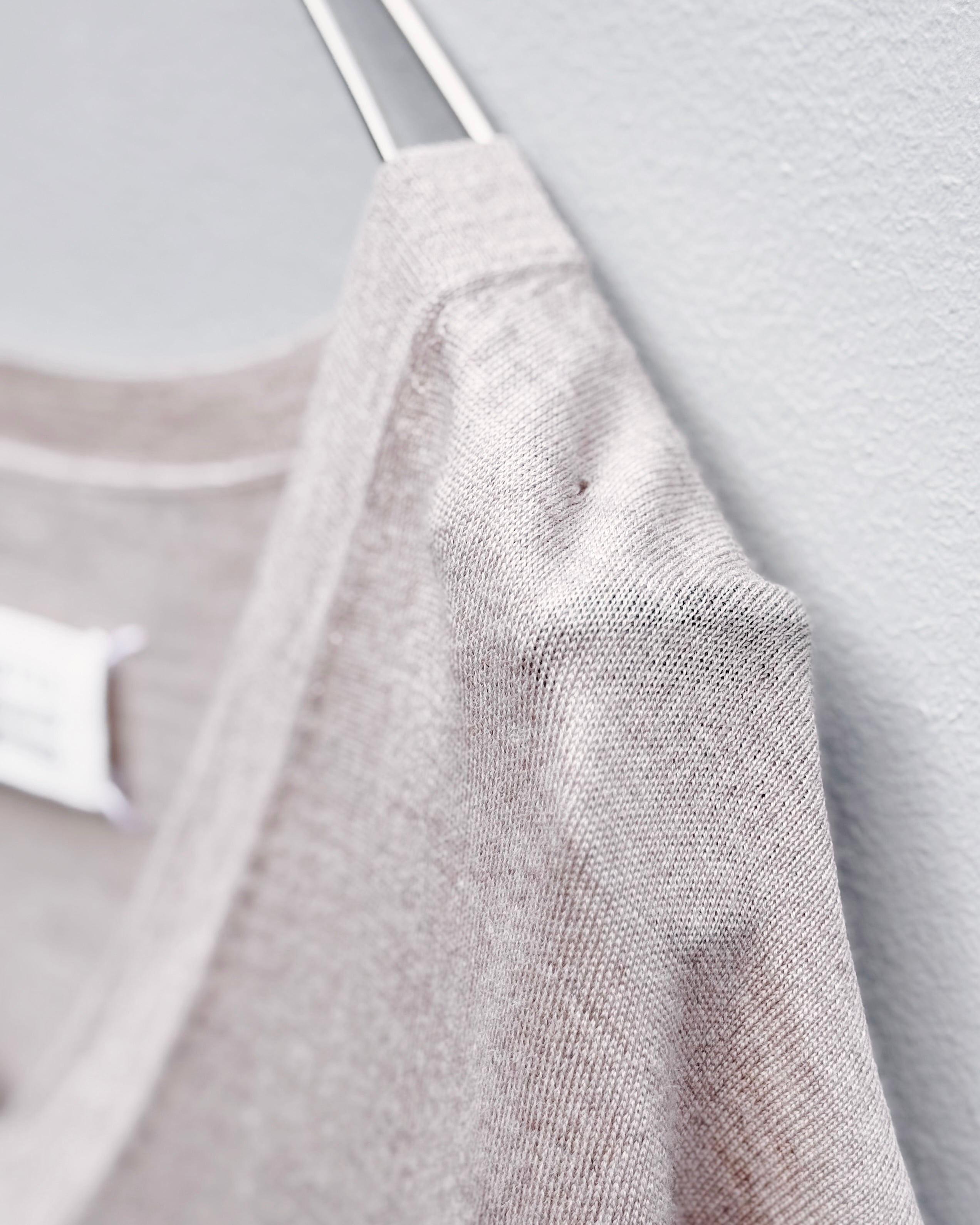 深めのVネックと広く取られた身幅、丸みを帯びた縦のフォルムが特徴的で、身体との距離を自然に生む設計。