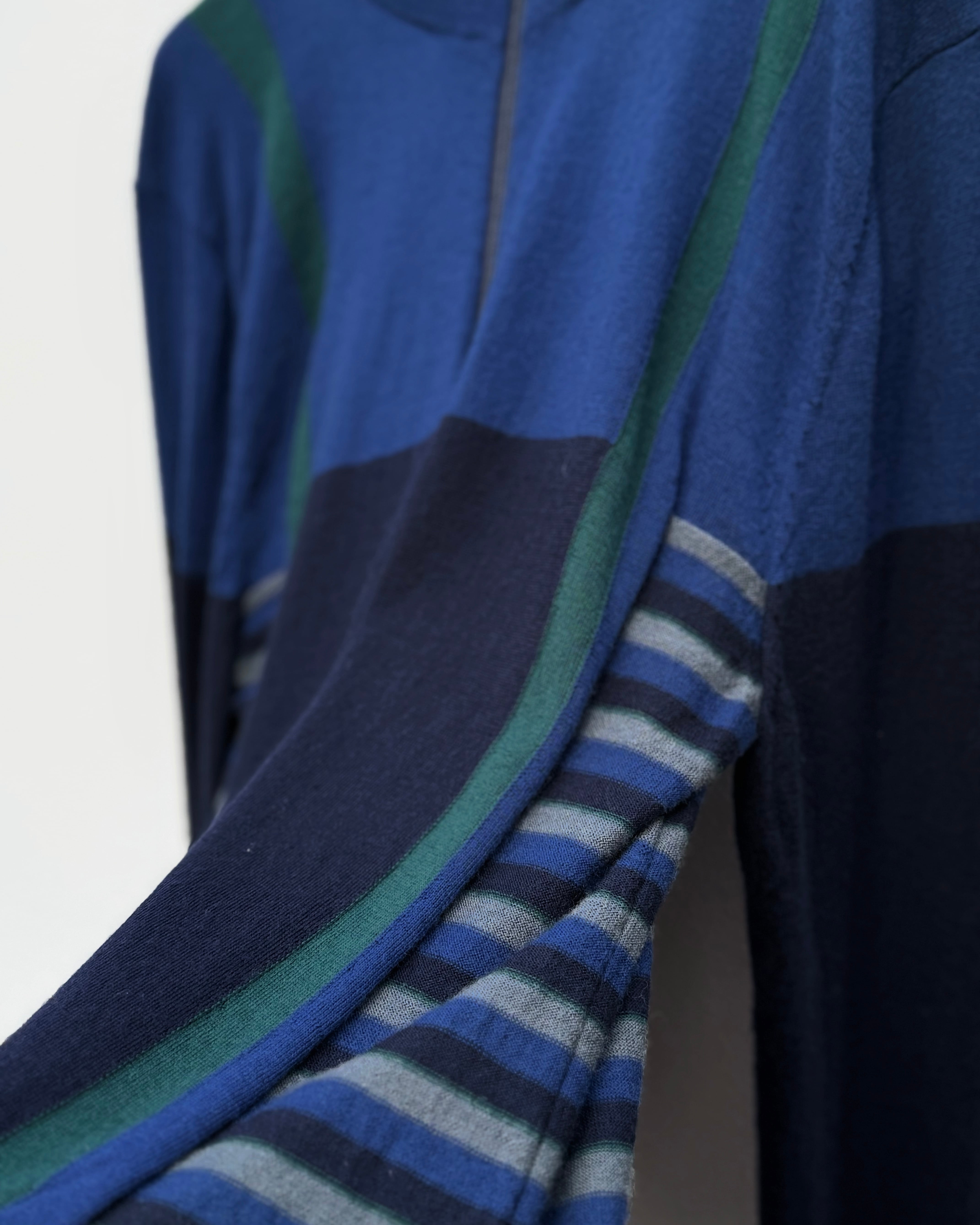 発色の良いブルーをベースに、グリーンのラインとサイドのボーダーで構成された切り替えデザイン。