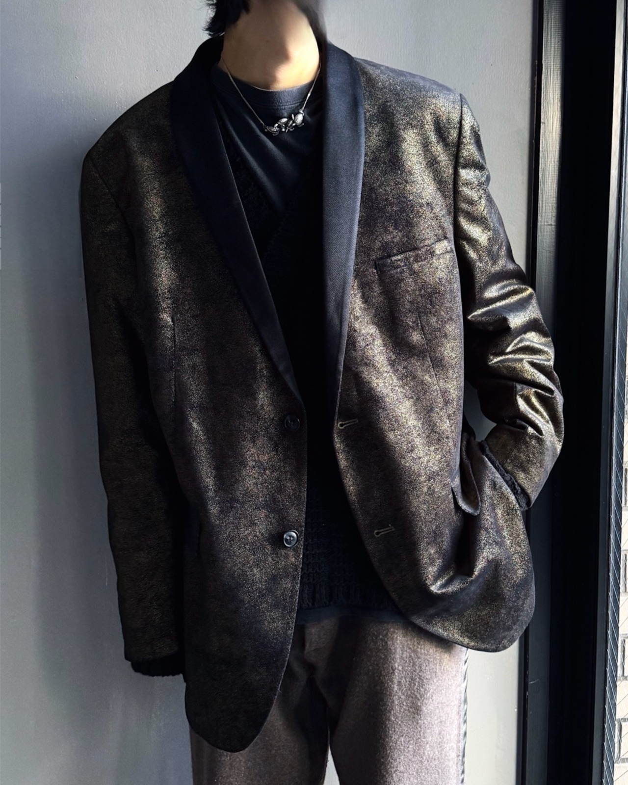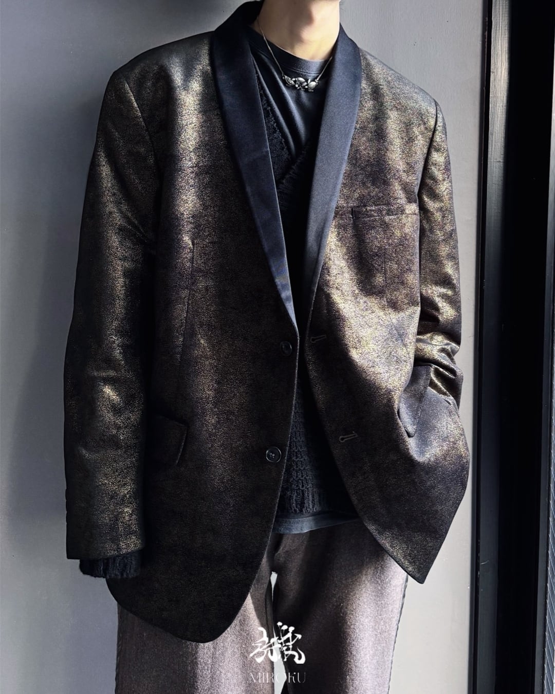 ショールカラーでスモーキングジャケットのような趣もあり、派手ながらも不思議と全体がまとまって見えるのもポイント。